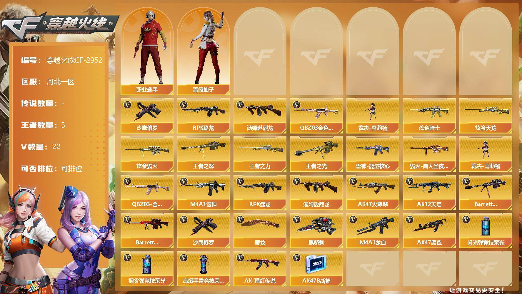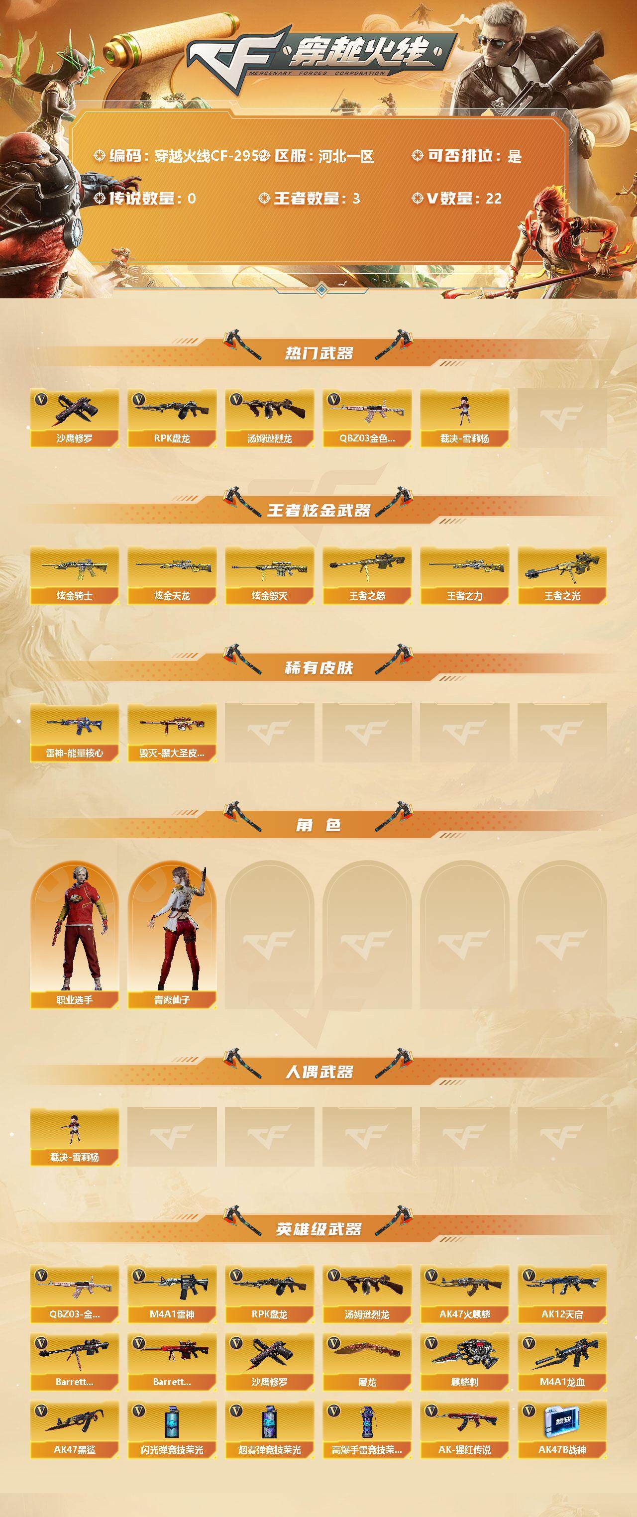 [12780976]河北一区-22V-3王者-3炫金 【热门武器】:QBZ03-金色蔷薇*2,汤姆逊-烈龙,RPK-盘龙,裁决-雪莉杨,沙鹰-修罗 【王者炫金武器】:炫金骑士,炫金天龙,炫金毁灭,王者之光,王者之怒,王者之力 【稀有皮肤】:雷神-能量核心,毁灭-黑大圣皮肤 【角色】:职业选手,青霞仙子 【人偶武器】:裁决-雪莉杨 【英雄级武器】:高爆手雷-竞技荣光,烟雾弹-竞技荣光*2,闪光弹-竞技荣光,QBZ03-金色蔷薇*2,M4A1-雷神,RPK-盘龙,汤姆逊-烈龙,AK47-火麒麟*2,AK12-天启,Barrett-毁灭,Barrett-极光,M4A1-龙血,AK47-黑鲨,AK-47-猩红传说,AK47-B-战神,沙鹰-修罗,麒麟刺,屠龙 【特殊枪械】:1烈龙,1盘龙