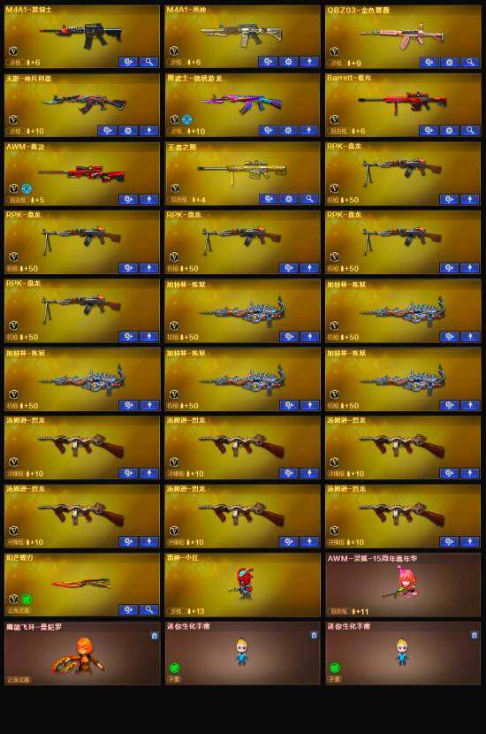 【英雄级武器】:QBZ03-金色蔷薇,无影-神兵利器,M4A1-黑骑士,M4A1-死神,RPK-盘龙*5,加特林-炼狱*5,汤姆逊-烈龙*6,Barrett-极光,AWM-裁决,黑武士-锦绣游龙,炽芒蝶刃
