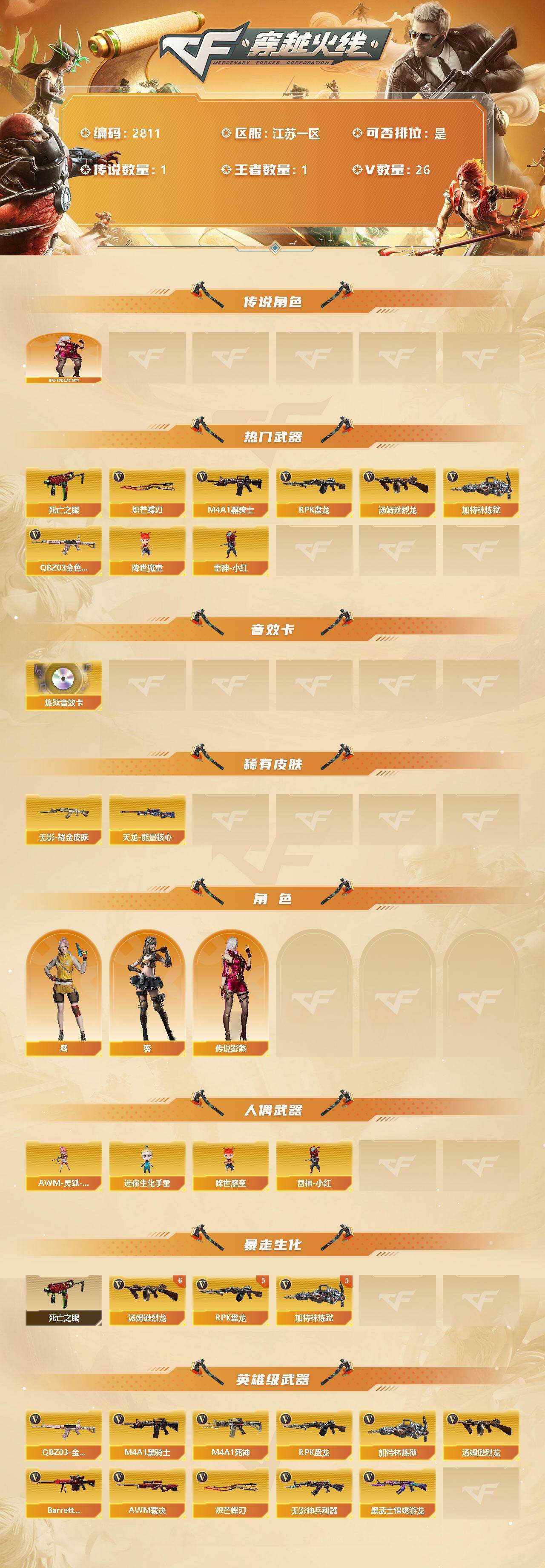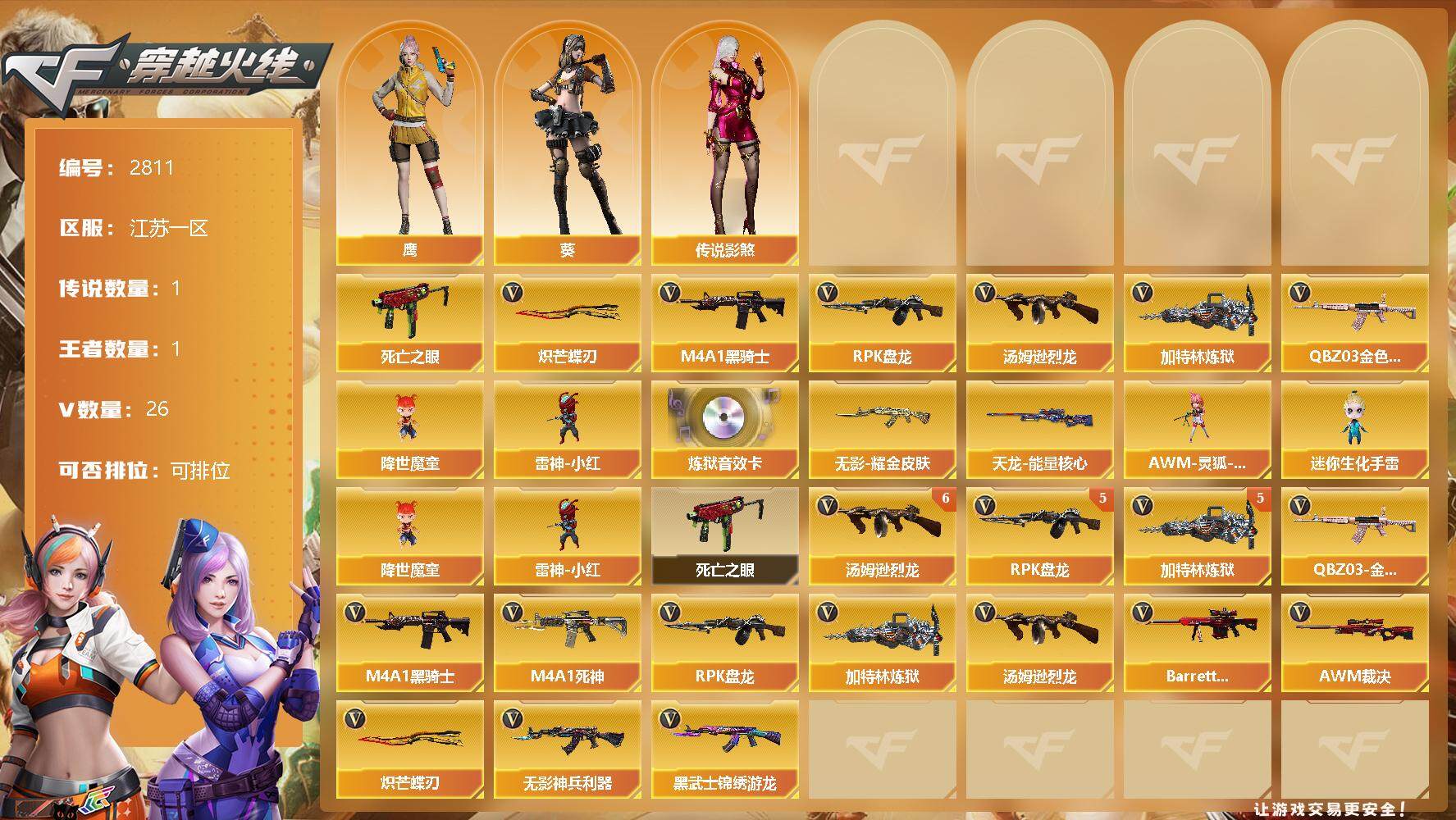 [12781834]江苏一区-26V-1王者-0炫金 【传说角色】:传说影煞 【热门武器】:QBZ03-金色蔷薇,死亡之眼,M4A1-黑骑士,汤姆逊-烈龙*6,RPK-盘龙*5,加特林-炼狱*5,降世魔童,雷神-小红,炽芒蝶刃 【音效卡】:加特林-炼狱音效卡 【稀有皮肤】:天龙-能量核心,无影耀金皮肤 【角色】:传说影煞,葵,鹰 【人偶武器】:降世魔童,雷神-小红,AWM-灵狐-15周年嘉年华,迷你生化手雷*2 【暴走生化】:死亡之眼 【英雄级武器】:QBZ03-金色蔷薇,无影-神兵利器,M4A1-黑骑士,M4A1-死神,RPK-盘龙*5,加特林-炼狱*5,汤姆逊-烈龙*6,Barrett-极光,AWM-裁决,黑武士-锦绣游龙,炽芒蝶刃 【特殊枪械】:1黑骑士,6烈龙,5盘龙,5炼狱