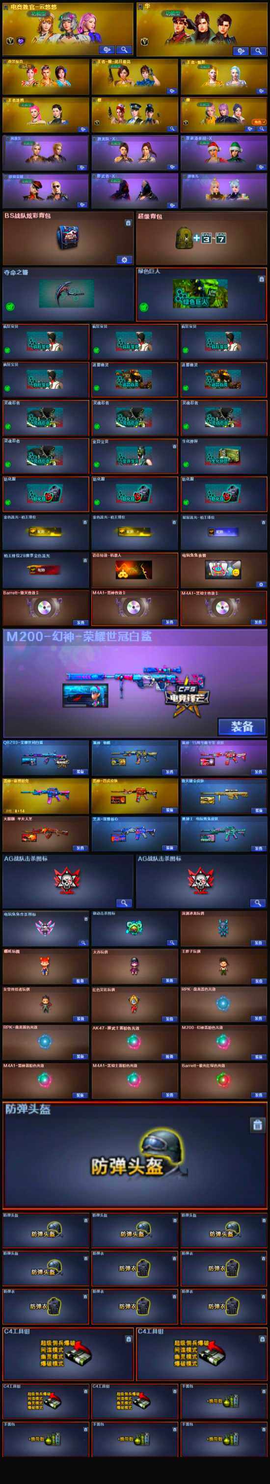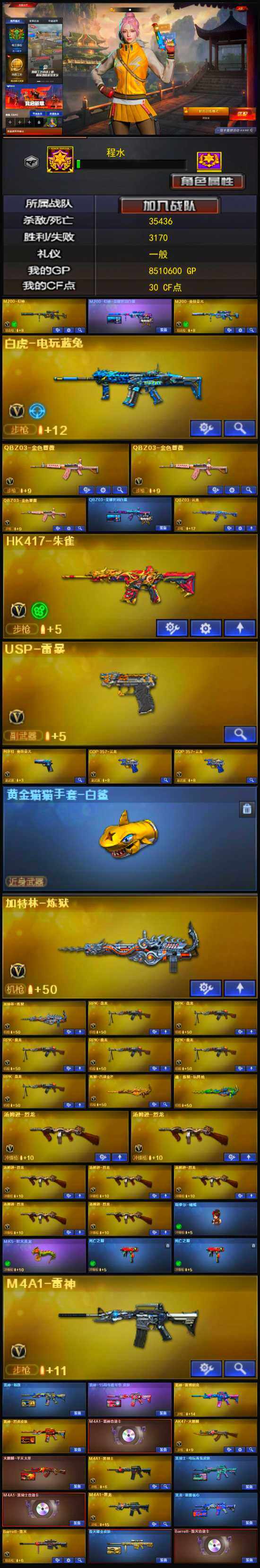 【热门武器】:QBZ03-金色蔷薇*3,HK417-朱雀,M200-幻神,M200-竞技荣光,死亡之眼*2,白虎-电玩蓝兔,M4A1-黑骑士,汤姆逊-烈龙*7,RPK-盘龙*6,加特林-炼狱*2,斯泰尔-蝴蝶,MK5-炽火炎龙,COP-白鲨*2,USP-雷暴,黄金猫猫手套-白鲨