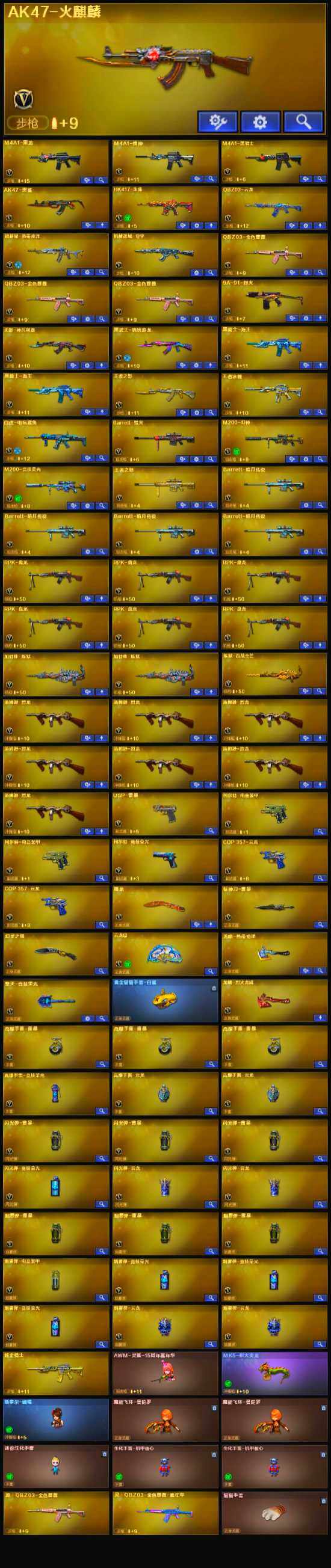 【英雄级武器】:QBZ03-云龙,COP 357-云龙*2,M200-竞技荣光,柯尔特-竞技荣光,擎天-竞技荣光,高爆手雷-竞技荣光,烟雾弹-竞技荣光*3,闪光弹-竞技荣光,幻灵之锋,柯尔特-电竞装甲*2,USP-雷暴,斩神刀-雷暴,QBZ03-金色蔷薇*3,HK417-朱雀,白虎-电玩蓝兔,无影-神兵利器,M4A1-雷神,M4A1-黑龙,M4A1-黑骑士,RPK-盘龙*6,加特林-炼狱*2,汤姆逊-烈龙*7,AK47-火麒麟,Barrett-毁灭,M200-幻神,AK47-黑鲨,黑武士-锦绣游龙,黑骑士-海王*2,超新星-热带奇洋,M4A1-赤狱骑士,屠龙,龙啸-热带奇洋