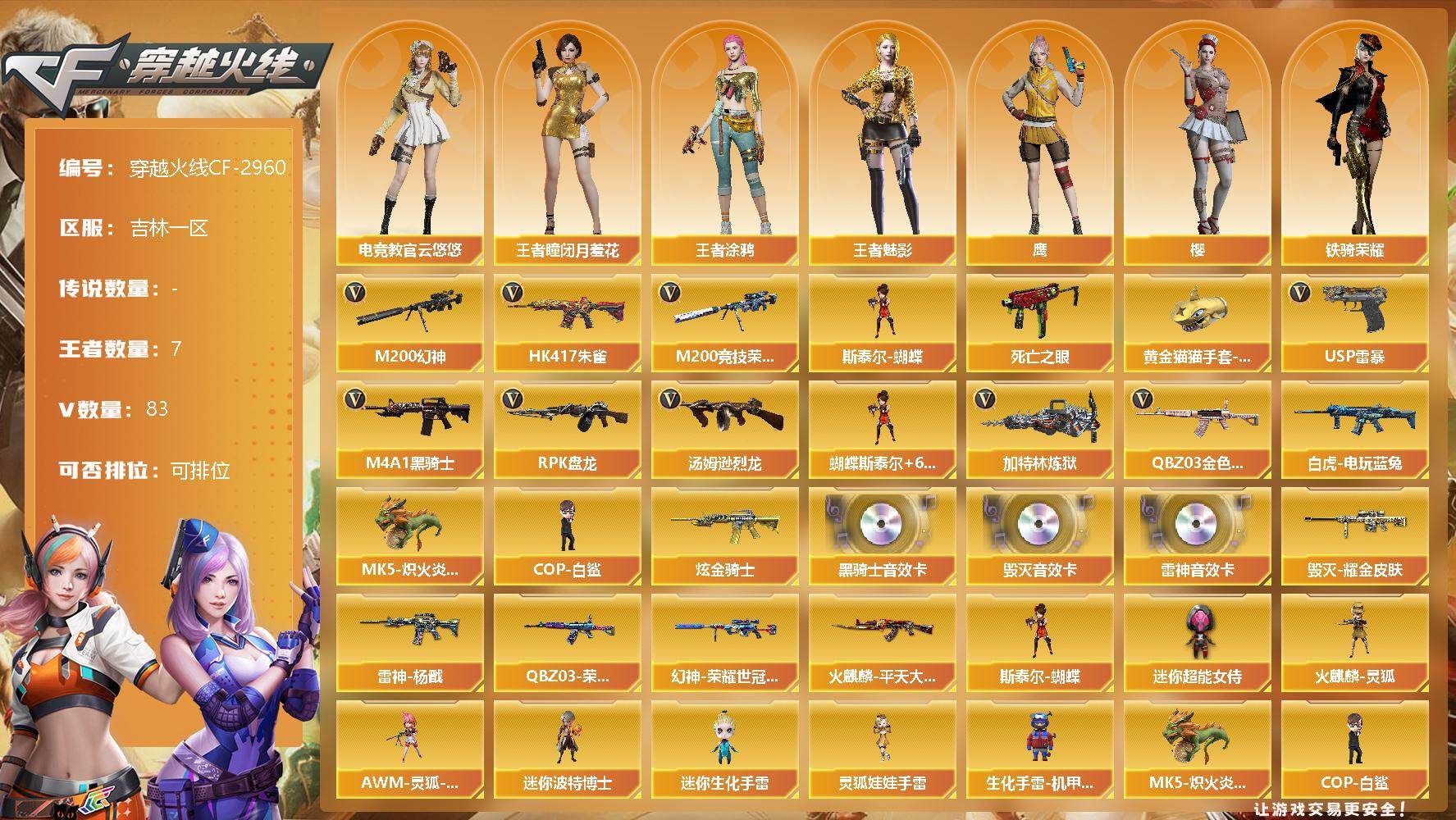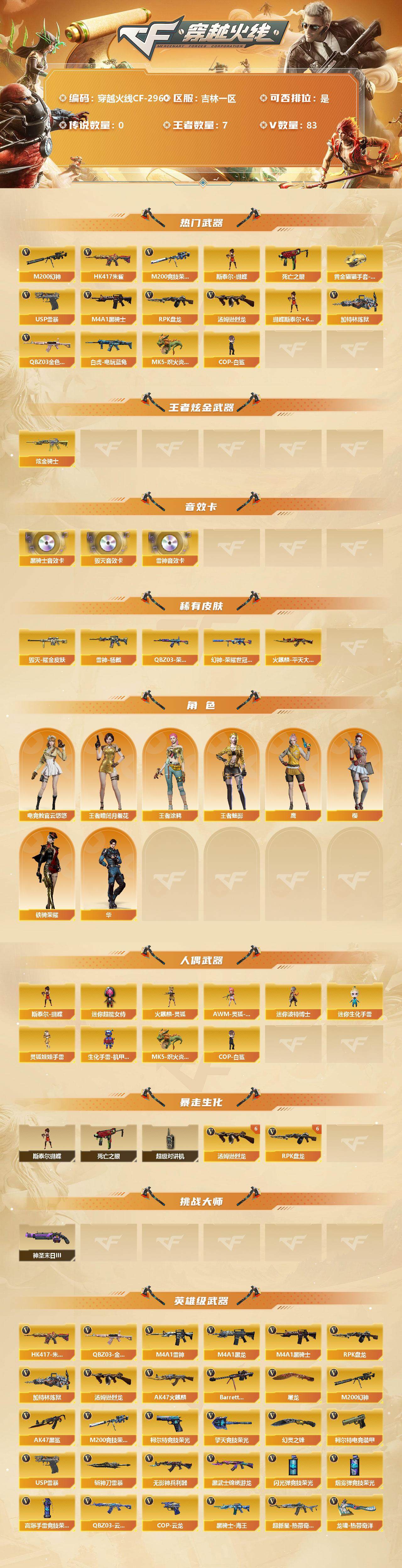 [12781971]吉林一区-83V-7王者-1炫金 【热门武器】:QBZ03-金色蔷薇*3,HK417-朱雀,M200-幻神,M200-竞技荣光,死亡之眼*2,白虎-电玩蓝兔,M4A1-黑骑士,汤姆逊-烈龙*7,RPK-盘龙*6,加特林-炼狱*2,斯泰尔-蝴蝶,MK5-炽火炎龙,COP-白鲨*2,USP-雷暴,黄金猫猫手套-白鲨 【王者炫金武器】:炫金骑士 【音效卡】:M4A1-雷神音效卡,M4A1-黑骑士音效卡,Barrett-毁灭音效卡 【稀有皮肤】:M200-幻神-荣耀世冠白鲨,QBZ03-荣耀世冠白鲨,雷神-杨戬,火麒麟-平天大圣,毁灭耀金皮肤 【角色】:王者-瞳-闭月羞花,王者涂鸦,王者-魅影,樱,电竞教官-云悠悠,鹰,华,铁骑荣耀 【人偶武器】:MK5-炽火炎龙,COP-白鲨*2,斯泰尔-蝴蝶,火麒麟-灵狐,AWM-灵狐-15周年嘉年华,迷你超能女侍,迷你波特博士,迷你生化手雷,灵狐娃娃手雷,生化手雷-机甲核心*2 【暴走生化】:斯泰尔-蝴蝶,死亡之眼*2,超级对讲机 【挑战大师】:神圣爆裂者-末日III*2 【英雄级武器】:QBZ03-云龙,COP 357-云龙*2,M200-竞技荣光,柯尔特-竞技荣光,擎天-竞技荣光,高爆手雷-竞技荣光,烟雾弹-竞技荣光*3,闪光弹-竞技荣光,幻灵之锋,柯尔特-电竞装甲*2,USP-雷暴,斩神刀-雷暴,QBZ03-金色蔷薇*3,HK417-朱雀,白虎-电玩蓝兔,无影-神兵利器,M4A1-雷神,M4A1-黑龙,M4A1-黑骑士,RPK-盘龙*6,加特林-炼狱*2,汤姆逊-烈龙*7,AK47-火麒麟,Barrett-毁灭,M200-幻神,AK47-黑鲨,黑武士-锦绣游龙,黑骑士-海王*2,超新星-热带奇洋,M4A1-赤狱骑士,屠龙,龙啸-热带奇洋 【特殊枪械】:蝴蝶斯泰尔+6烈龙,1黑骑士,6烈龙,6盘龙,2炼狱,1蝴蝶斯泰尔