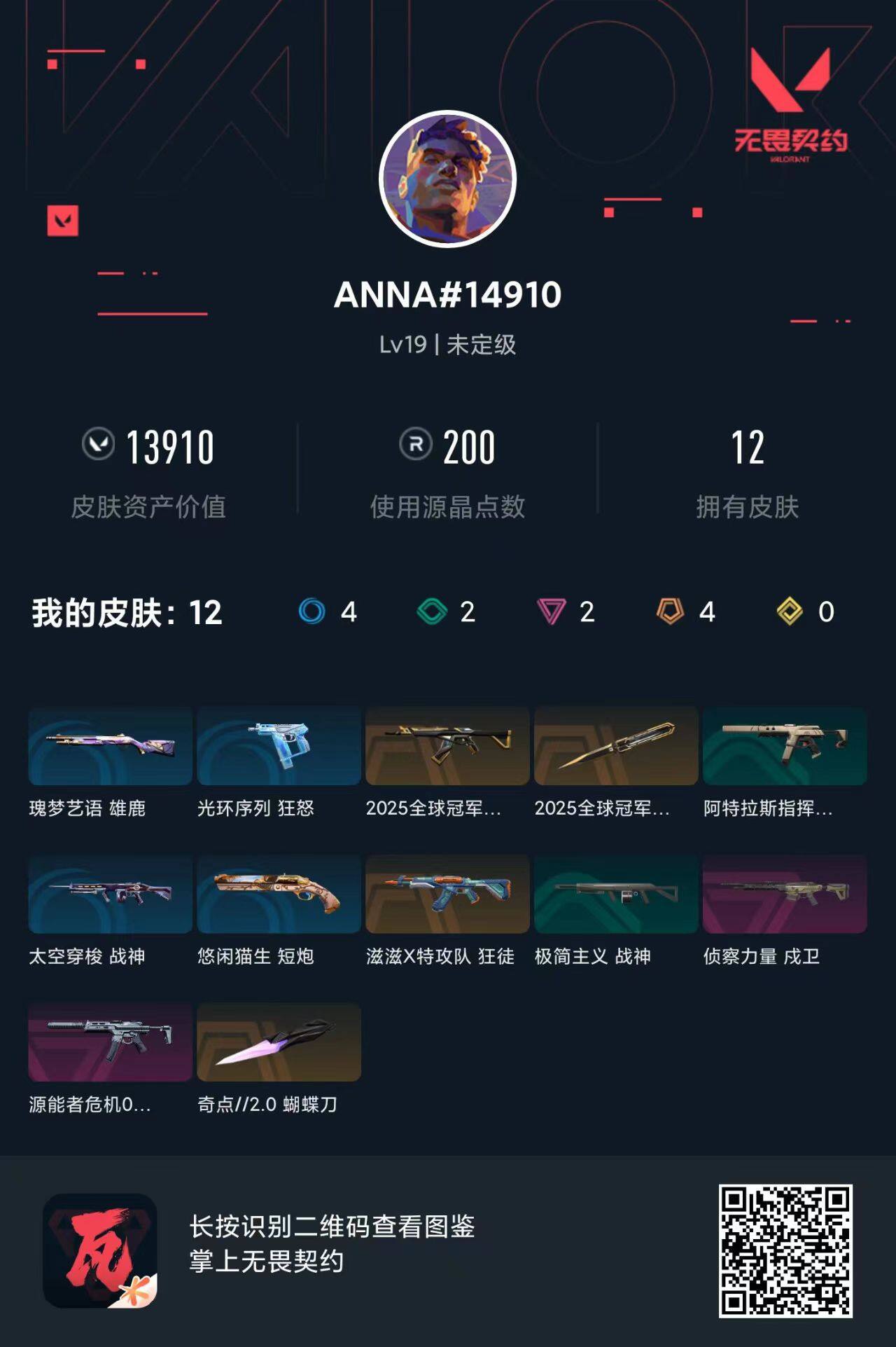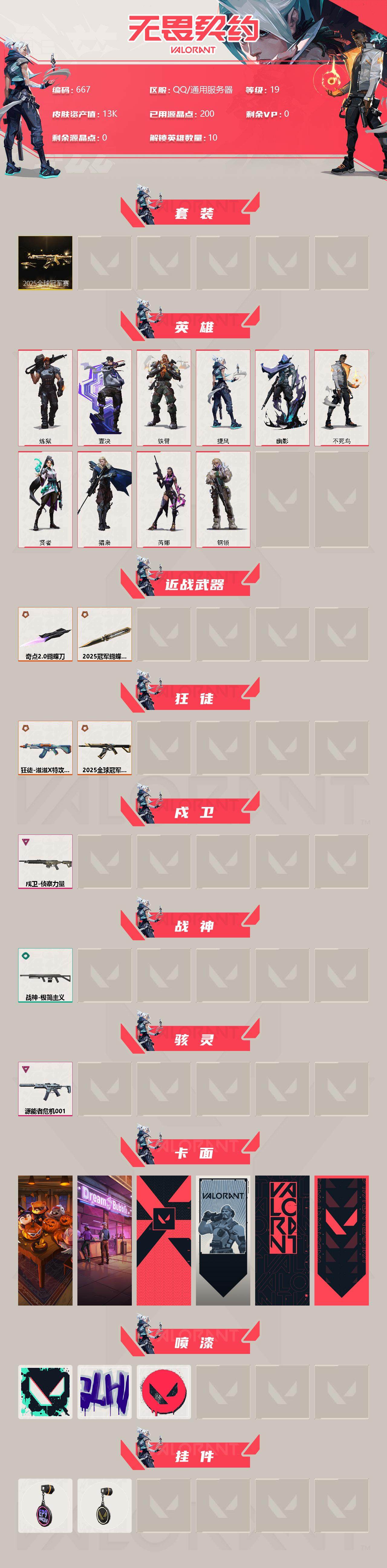 [12782655]【套装】:2025全球冠军赛套装 【英雄】:炼狱,壹决,铁臂,捷风,幽影,不死鸟,贤者,猎枭,芮娜,钢锁 【近战 武器】:近战武器-2025全球冠军赛 蝴蝶刀,近战武器-奇点//2.0 蝴蝶刀 【狂徒】:狂徒-2025全球冠军赛,狂徒-滋滋X特攻队 【戍卫】:戍卫-侦察力量 【战神】:战神-极简主义 【骇灵】:骇灵-源能者危机001 【卡面】:南瓜盛典 卡面,梦幻奶茶 卡面,代号红色 卡面,新兵报到 卡面,V契约 卡面,无畏契约 卡面 【喷漆】:胜利属于无畏契约 喷漆,GLHF 喷漆,无畏契约 喷漆 【挂饰】:第九季//第三幕 纪念币 挂饰,无畏契约 纪念币 挂饰