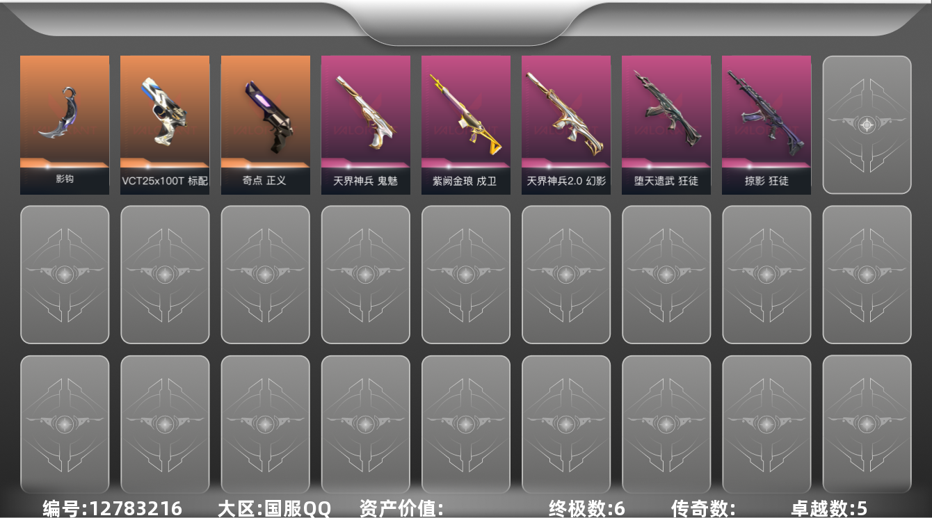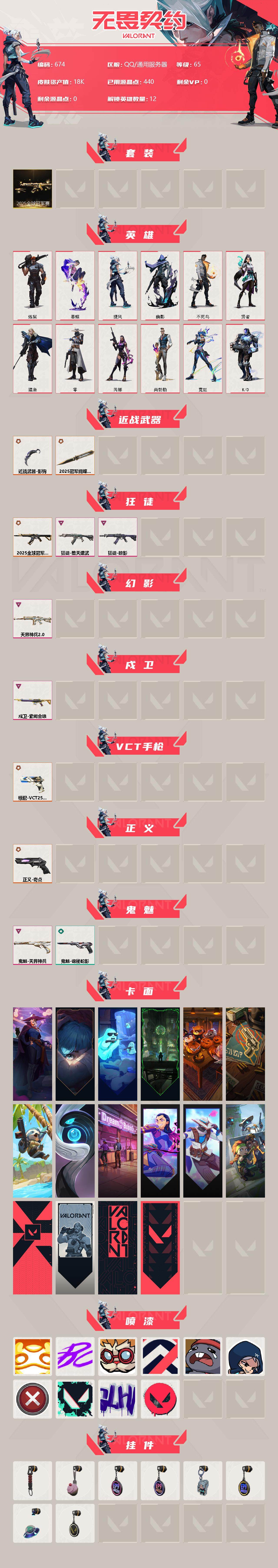 [12783216]【套装】:2025全球冠军赛套装 【英雄】:炼狱,暮蝶,捷风,幽影,不死鸟,贤者,猎枭,零,芮娜,尚勃勒,霓虹,K/O 【近战 武器】:近战武器-2025全球冠军赛 蝴蝶刀,近战武器-影钩 【狂徒】:狂徒-2025全球冠军赛,狂徒-堕天遗武,狂徒-掠影 【幻影】:幻影-天界神兵//2.0 【戍卫】:戍卫-紫阙金琅 【VCT手枪】:标配-VCT25 x 100T 【正义】:正义-奇点 【鬼魅】:鬼魅-天界神兵,鬼魅-诡秘蛇影 【卡面】:银弹猎手 卡面,《双城之战》拥抱 卡面,精灵大战 卡面,欢迎来到底城 卡面,南瓜盛典 卡面,正义的化身 卡面,树懒大作战 卡面,聚合之力 卡面,梦幻奶茶 卡面,无畏契约GO!第一卷:芮娜 卡面,无畏契约GO!第一卷:零 卡面,别冒尖 卡面,代号红色 卡面,新兵报到 卡面,V契约 卡面,无畏契约 卡面 【喷漆】:嗨宝南瓜灯 喷漆,嘭! 喷漆,都算到了 喷漆,控场勿近 喷漆,熊抱 喷漆,捷风差距 喷漆,买装还是存钱 喷漆,胜利属于无畏契约 喷漆,GLHF 喷漆,无畏契约 喷漆 【挂饰】:伞绳 挂饰,《双城之战》小蛋糕 挂饰,第九季//第三幕 纪念币 挂饰,第九季//第二幕 纪念币 挂饰,袖珍捷风 挂饰,第九季//第一幕 纪念币 挂饰,天外飞客 挂饰,无畏契约 纪念币 挂饰