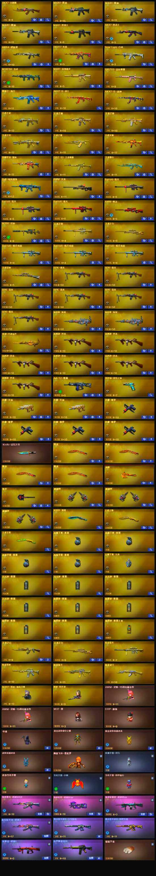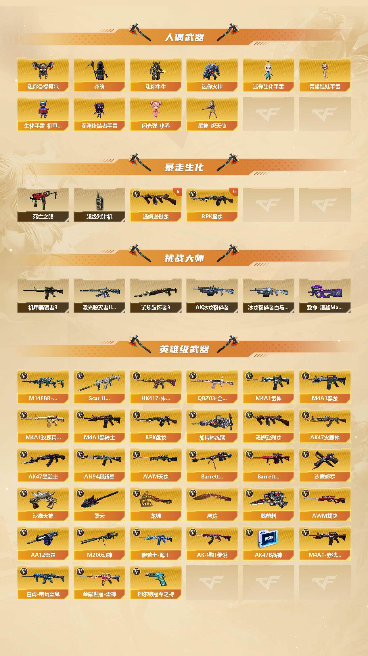【英雄级武器】:荣耀世冠-雷神,QBZ03-金色蔷薇,M14EBR-玄武,Scar Light-白虎,HK417-朱雀,白虎-电玩蓝兔,M4A1-雷神*2,M4A1-黑龙,M4A1-玫瑰精灵,M4A1-黑骑士,RPK-盘龙*6,加特林-炼狱*2,汤姆逊-烈龙*6,AK47-火麒麟,AK47-黑武