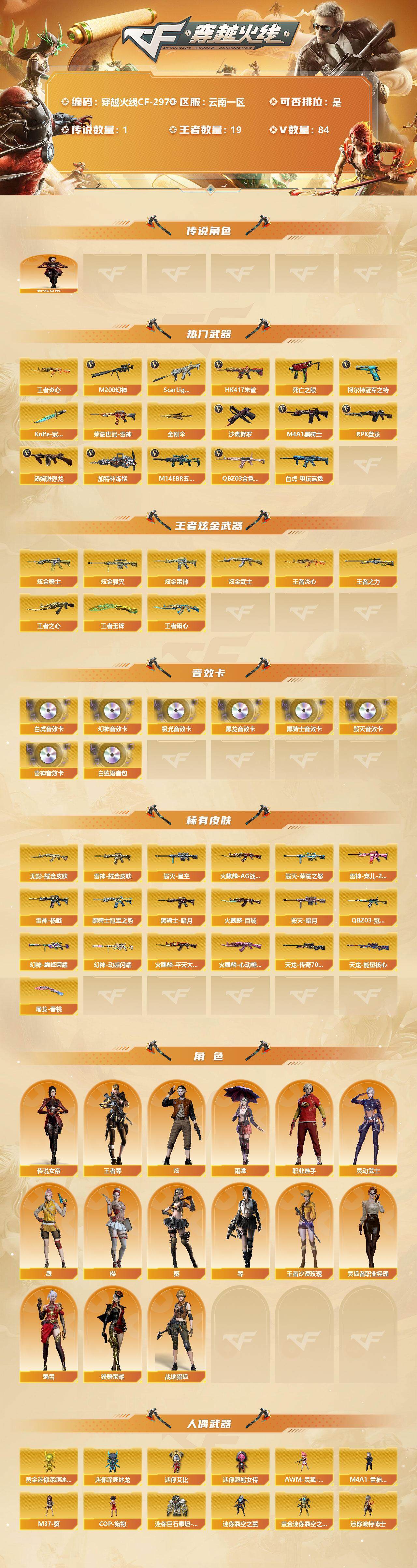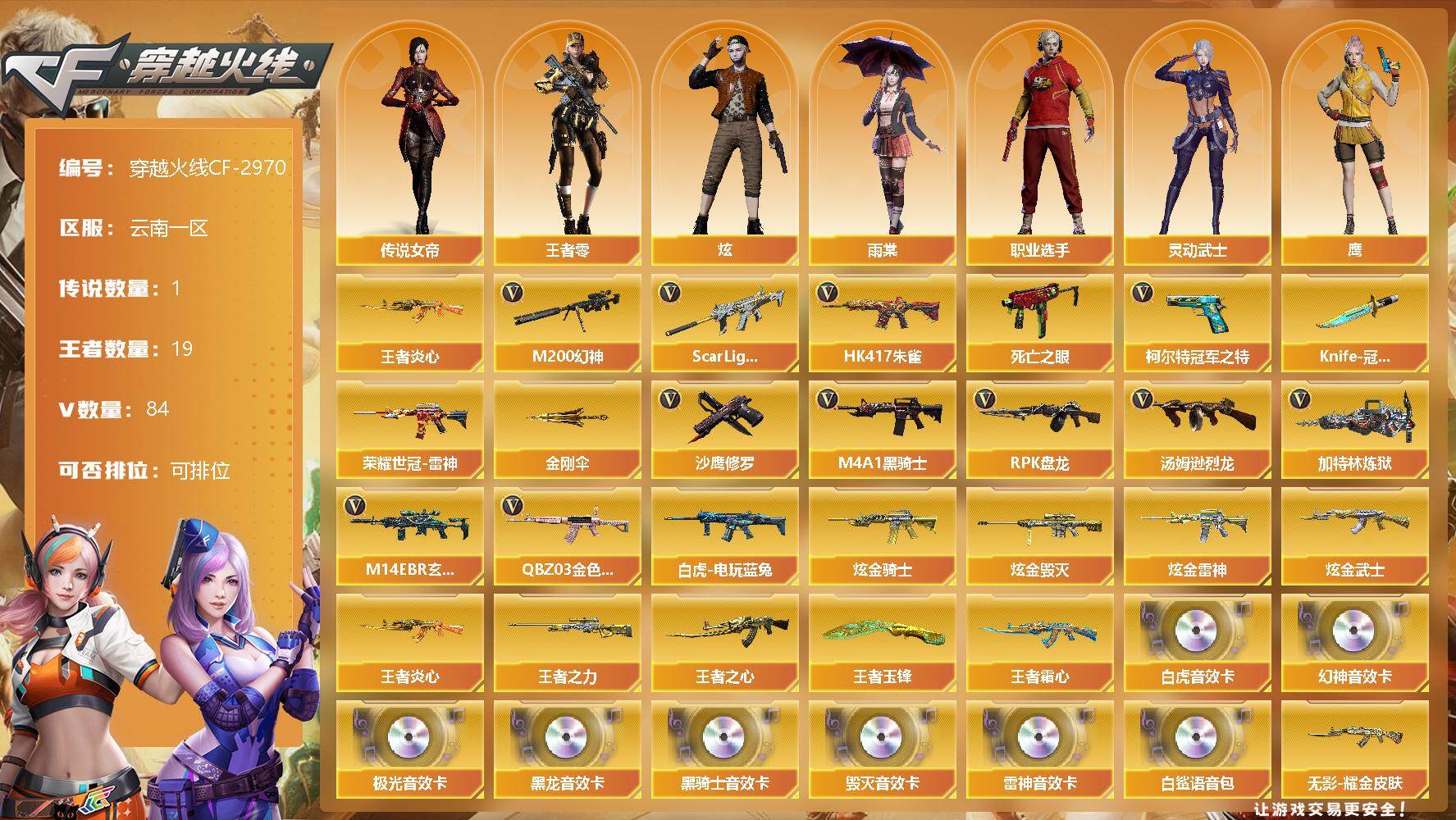 [12783968]云南一区-84V-19王者-4炫金 【传说角色】:传说女帝 【热门武器】:QBZ03-金色蔷薇,M14EBR-玄武,Scar Light-白虎,HK417-朱雀,M200-幻神,死亡之眼,荣耀世冠-雷神,白虎-电玩蓝兔,柯尔特-冠军之特,王者炎心,M4A1-黑骑士,汤姆逊-烈龙*6,RPK-盘龙*6,加特林-炼狱*2,沙鹰-修罗*4,Knife-冠军之刃,金刚伞 【王者炫金武器】:炫金骑士,炫金毁灭,炫金雷神,炫金武士,王者炎心,王者之力,王者之心,王者霜心,王者玉锋 【音效卡】:M200-幻神音效卡,M4A1-雷神音效卡,M4A1-黑龙音效卡,M4A1-黑骑士音效卡,Barrett-毁灭音效卡,Barrett-极光音效卡,Scar Light-白虎音效卡,白鲨语音包 【稀有皮肤】:幻神-巅峰荣耀,幻神-动感闪耀 皮肤,QBZ03-冠军之薇,雷神-耀金皮肤,雷神-宠儿-2019MVP,雷神-杨戬,火麒麟-AG战队皮肤,火麒麟-平天大圣,火麒麟-百城,火麒麟-心动糖果,黑骑士-暗月,黑骑士-冠军之势,毁灭-暗月,毁灭-荣耀之怒,毁灭-星空,天龙-能量核心,AWM-天龙-传奇70KG,无影耀金皮肤,屠龙-春桃 皮肤 【角色】:传说女帝,王者-零,王者沙漠玫瑰,灵狐者-职业经理,零,葵,樱,炫,雨棠,鹰,战地猎狐,蜀雪,铁骑荣耀,灵动武士,职业选手 【人偶武器】:星神-炽天使,AWM-灵狐-15周年嘉年华*2,M4A1-雷神-精英刀锋,M37-葵,COP-旗袍,黄金迷你深渊冰龙,迷你深渊冰龙,迷你艾比,迷你超能女侍,迷你巨石泰坦-魔花研究所,迷你裂空之翼,黄金迷你裂空之翼,迷你波特博士,迷你曼提柯尔,夺魂,迷你牛牛,迷你火种,迷你生化手雷,灵狐娃娃手雷,生化手雷-机甲核心,深渊终结者手雷,闪光弹-小乔 【暴走生化】:死亡之眼,超级对讲机 【挑战大师】:机甲撕裂者III,试炼破坏者III,激光毁灭者III-白马银枪,AK47-冰龙粉碎者,冰龙粉碎者-白马银枪,致命乱世-超越Max 【英雄级武器】:荣耀世冠-雷神,QBZ03-金色蔷薇,M14EBR-玄武,Scar Light-白虎,HK417-朱雀,白虎-电玩蓝兔,M4A1-雷神*2,M4A1-黑龙,M4A1-玫瑰精灵,M4A1-黑骑士,RPK-盘龙*6,加特林-炼狱*2,汤姆逊-烈龙*6,AK47-火麒麟,AK47-黑武