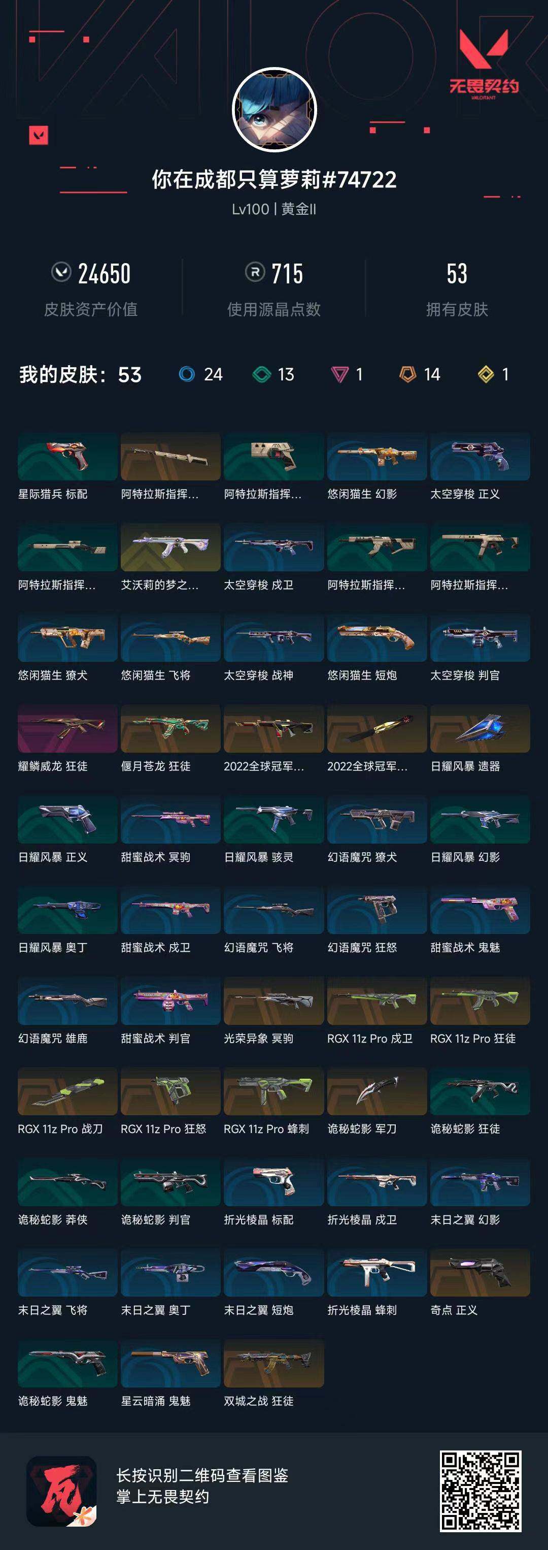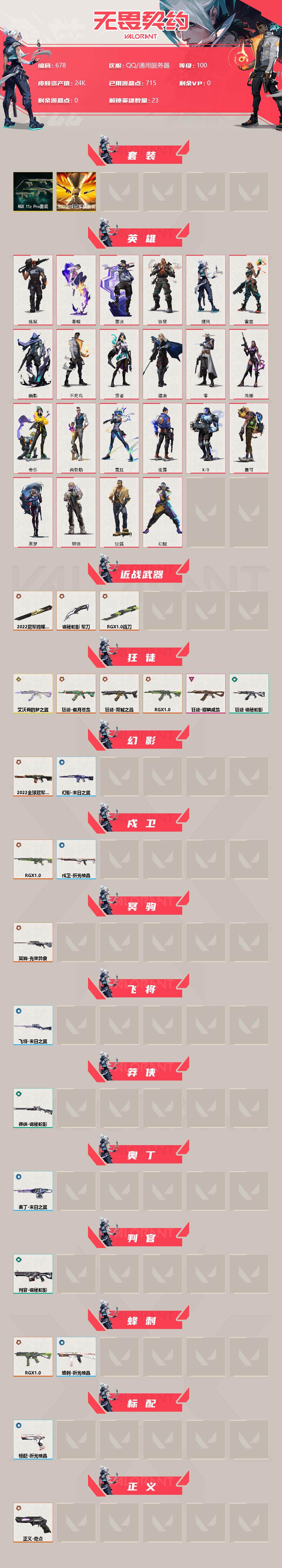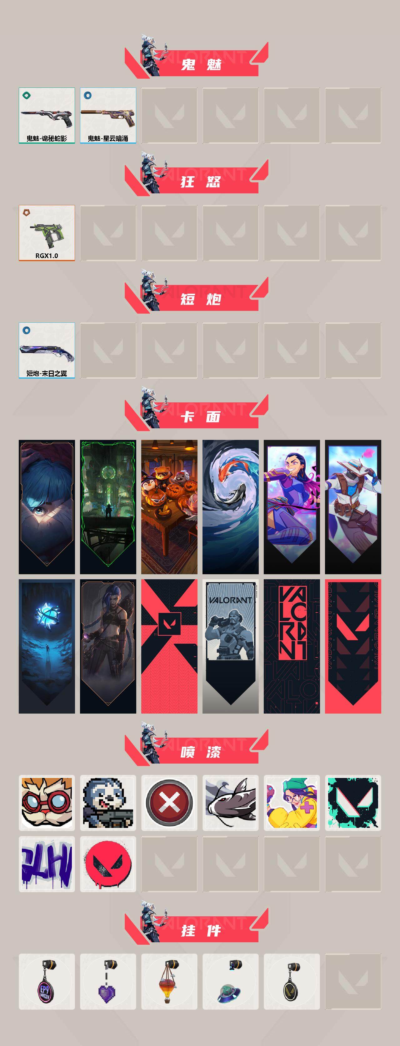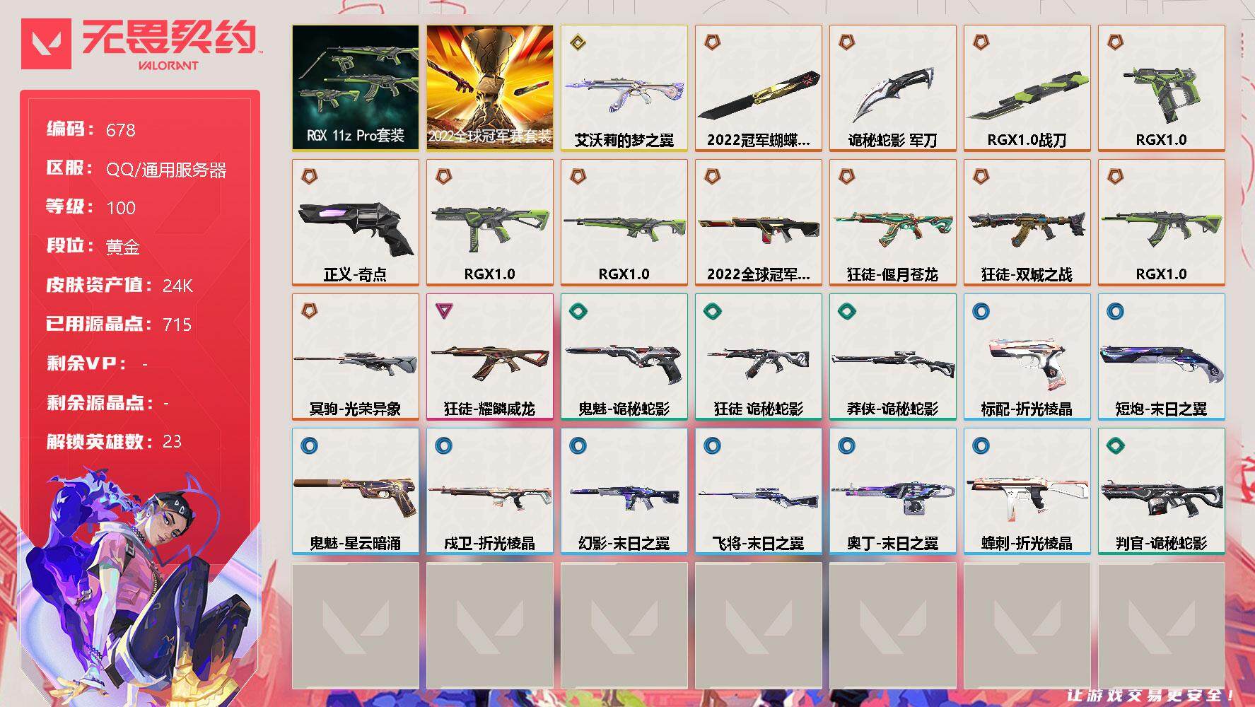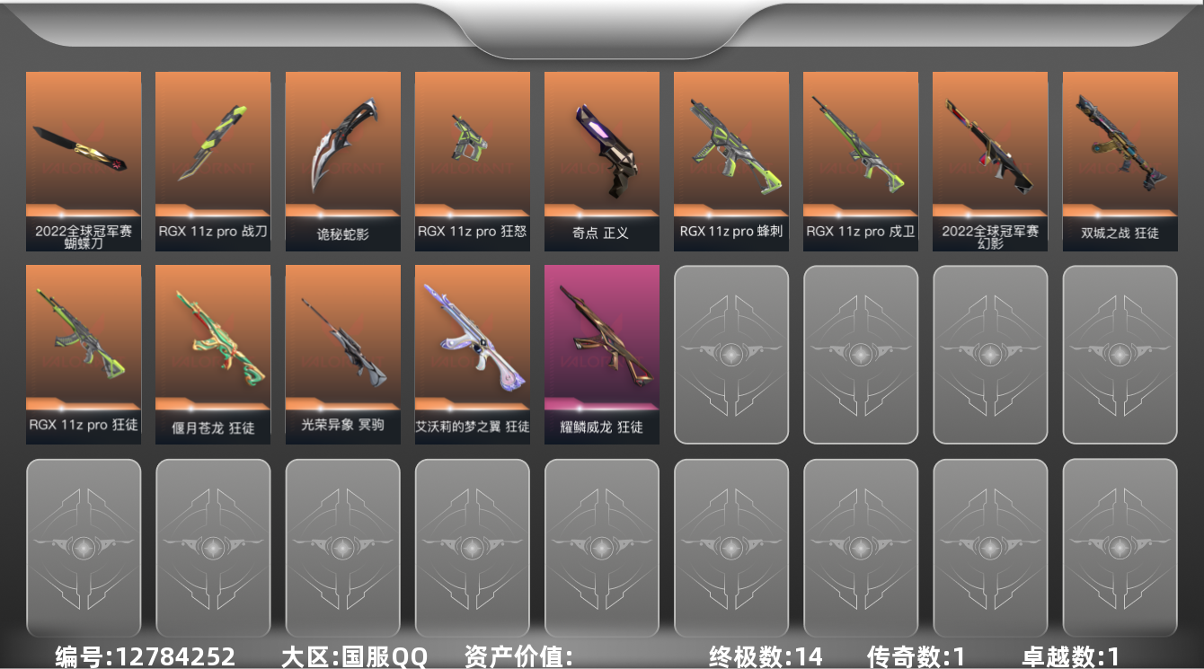 [12784252]【套装】:2022全球冠军赛套装,RGX 11z Pro套装 【英雄】:幻棱,炼狱,暮蝶,钛狐,壹决,铁臂,捷风,雷兹,幽影,不死鸟,贤者,猎枭,零,芮娜,奇乐,尚勃勒,霓虹,夜露,K/O,盖可,黑梦,钢锁 【近战 武器】:近战武器-2022全球冠军赛 蝴蝶刀,近战武器-RGX 11z Pro 战刀,近战武器-诡秘蛇影 军刀 【狂徒】:狂徒-艾沃莉的梦之翼,狂徒-双城之战,狂徒-偃月苍龙,狂徒-RGX 11z Pro,狂徒-耀鳞威龙,狂徒-诡秘蛇影 【幻影】:幻影-2022全球冠军赛,幻影-末日之翼 【戍卫】:戍卫-RGX 11z Pro,戍卫-折光棱晶 【冥驹】:冥驹-光荣异象 【飞将】:飞将-末日之翼 【莽侠】:莽侠-诡秘蛇影 【奥丁】:奥丁-末日之翼 【判官】:判官-诡秘蛇影 【蜂刺】:蜂刺-RGX 11z Pro,蜂刺-折光棱晶 【标配】:标配-折光棱晶 【正义】:正义-奇点 【鬼魅】:鬼魅-诡秘蛇影,鬼魅-星云暗涌 【狂怒】:狂怒-RGX 11z Pro 【短炮】:短炮-末日之翼 【卡面】:《双城之战》拥抱 卡面,欢迎来到底城 卡面,南瓜盛典 卡面,红鳞松叶 卡面,无畏契约GO!第一卷:芮娜 卡面,无畏契约GO!第一卷:零 卡面,无垠星环 卡面,《双城之战》金克丝 卡面,代号红色 卡面,新兵报到 卡面,V契约 卡面,无畏契约 卡面 【喷漆】:都算到了 喷漆,审判之爪 喷漆,买装还是存钱 喷漆,松叶 喷漆,无畏契约GO!第一卷:奇乐 喷漆,胜利属于无畏契约 喷漆,GLHF 喷漆,无畏契约 喷漆 【挂饰】:第九季//第三幕 纪念币 挂饰,薰衣草之心 挂饰,冲上云霄 挂饰,天外飞客 挂饰,无畏契约 纪念币 挂饰