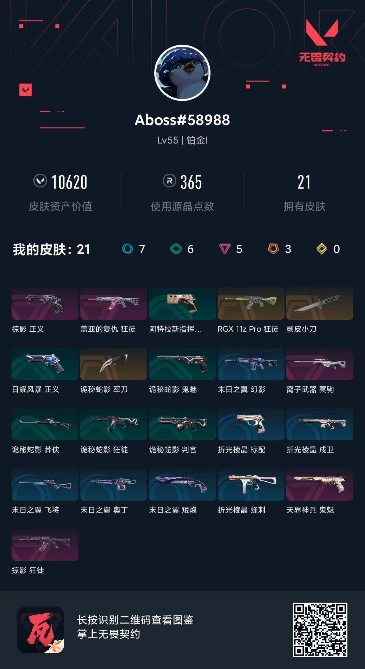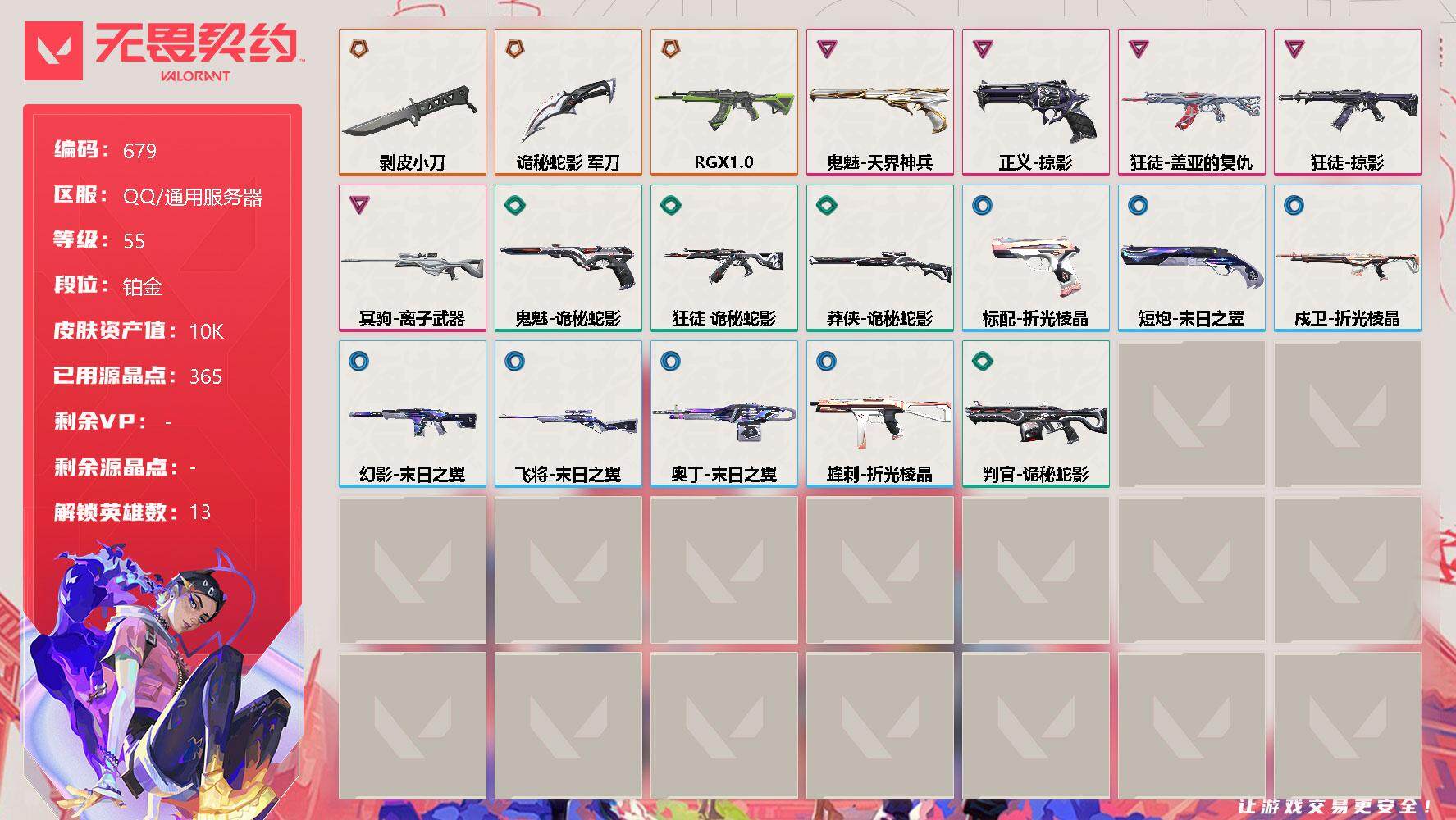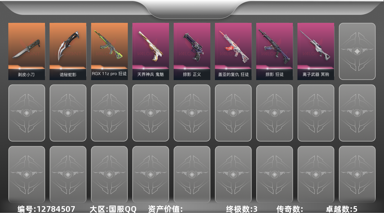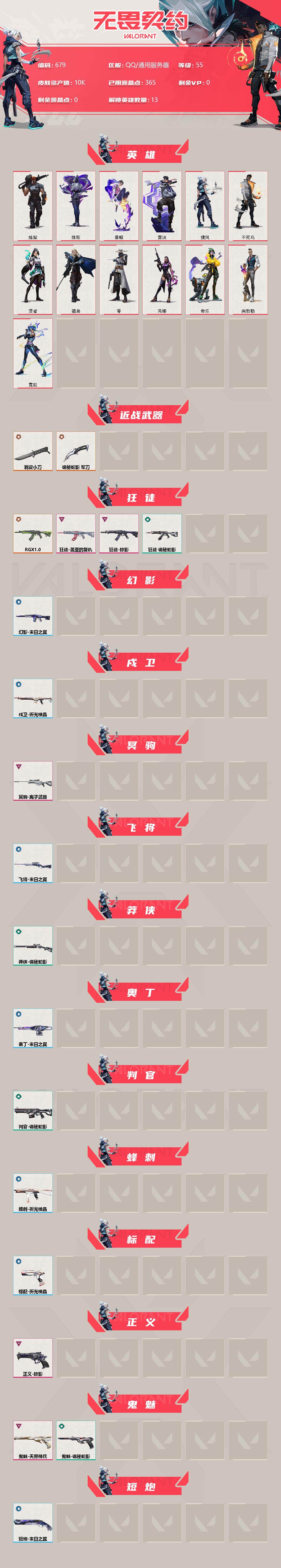 [12784507]【英雄】:炼狱,维斯,暮蝶,壹决,捷风,不死鸟,贤者,猎枭,零,芮娜,奇乐,尚勃勒,霓虹 【近战 武器】:近战武器-剥皮小刀,近战武器-诡秘蛇影 军刀 【狂徒】:狂徒-RGX 11z Pro,狂徒-掠影,狂徒-盖亚的复仇,狂徒-诡秘蛇影 【幻影】:幻影-末日之翼 【戍卫】:戍卫-折光棱晶 【冥驹】:冥驹-离子武器 【飞将】:飞将-末日之翼 【莽侠】:莽侠-诡秘蛇影 【奥丁】:奥丁-末日之翼 【判官】:判官-诡秘蛇影 【蜂刺】:蜂刺-折光棱晶 【标配】:标配-折光棱晶 【正义】:正义-掠影 【鬼魅】:鬼魅-天界神兵,鬼魅-诡秘蛇影 【短炮】:短炮-末日之翼 【卡面】:无畏契约GO!第一卷:零 卡面,化茧成蝶 卡面,代号红色 卡面,新兵报到 卡面,V契约 卡面,无畏契约 卡面 【喷漆】:买装还是存钱 喷漆,胜利属于无畏契约 喷漆,GLHF 喷漆,无畏契约 喷漆 【挂饰】:拳击战术熊 挂饰,无畏契约 纪念币 挂饰