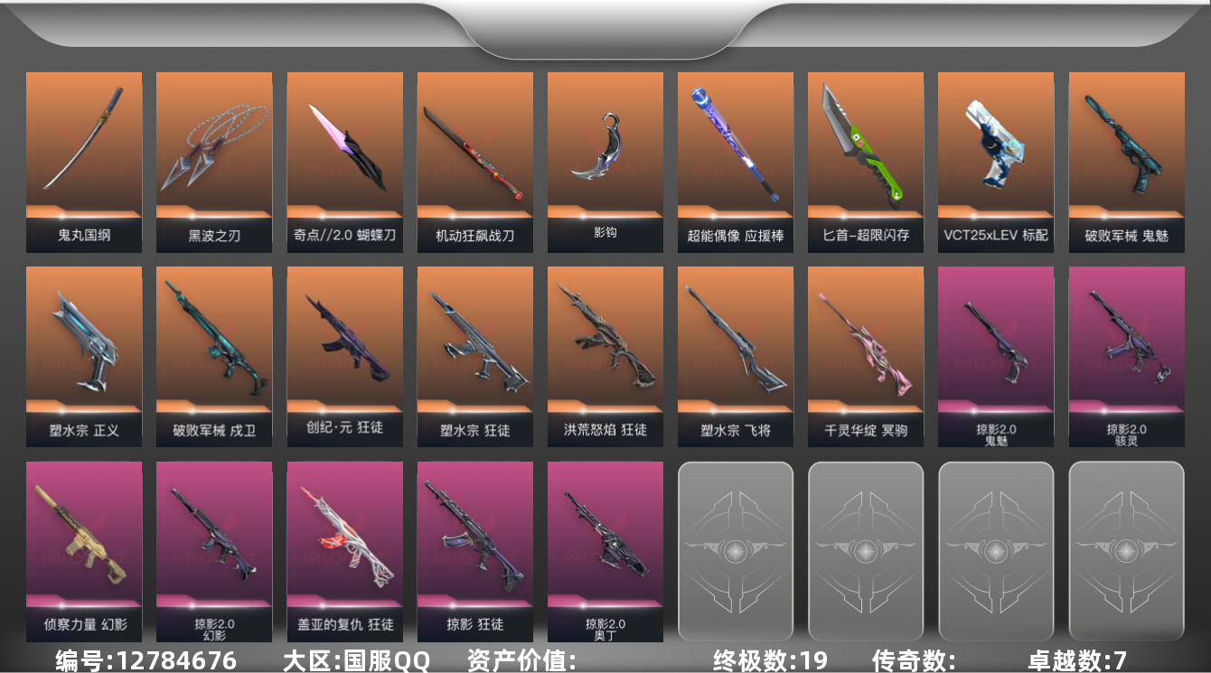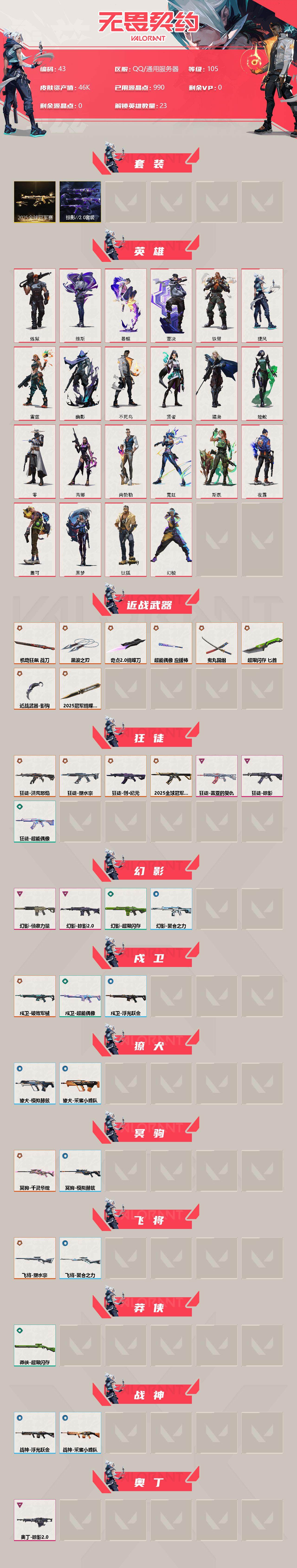 [12784676]【套装】:2025全球冠军赛套装,掠影//2.0套装 【英雄】:幻棱,炼狱,维斯,暮蝶,钛狐,壹决,铁臂,捷风,雷兹,幽影,不死鸟,贤者,猎枭,蝰蛇,零,芮娜,尚勃勒,霓虹,斯凯,夜露,盖可,黑梦 【近战 武器】:近战武器-2025全球冠军赛 蝴蝶刀,近战武器-影钩,近战武器-奇点//2.0 蝴蝶刀,近战武器-黑波之刃,近战武器-鬼丸国纲,近战武器-超能偶像 应援棒,近战武器-超限闪存 匕首,近战武器-机动狂飙 战刀 【狂徒】:狂徒-2025全球冠军赛,狂徒-洪荒怒焰,狂徒-塑水宗,狂徒-创·纪元,狂徒-掠影,狂徒-盖亚的复仇,狂徒-超能偶像 【幻影】:幻影-侦察力量,幻影-掠影//2.0,幻影-超限闪存,幻影-聚合之力 【戍卫】:戍卫-破败军械,戍卫-超能偶像,戍卫-浮光跃金 【獠犬】:獠犬-采蜜小蜂队,獠犬-模拟赫兹 【冥驹】:冥驹-千灵华绽,冥驹-模拟赫兹 【飞将】:飞将-塑水宗,飞将-聚合之力 【莽侠】:莽侠-超限闪存 【战神】:战神-采蜜小蜂队,战神-浮光跃金 【奥丁】:奥丁-掠影//2.0 【判官】:判官-超能偶像,判官-采蜜小蜂队 【雄鹿】:雄鹿-模拟赫兹 【骇灵】:骇灵-掠影//2.0,骇灵-无限竞技,骇灵-浮光跃金 【蜂刺】:蜂刺-超限闪存,蜂刺-聚合之力 【标配】:标配-超能偶像,标配-浮光跃金 【VCT手枪】:标配-VCT25 x LEV 【正义】:正义-塑水宗,正义-超限闪存 【鬼魅】:鬼魅-破败军械,鬼魅-掠影//2.0,鬼魅-采蜜小蜂队,鬼魅-模拟赫兹 【狂怒】:狂怒-聚合之力 【卡面】:《双城之战》拥抱 卡面,精灵大战 卡面,欢迎来到底城 卡面,南瓜盛典 卡面,VCT CN首冠 卡面,唱片的故事 卡面,钢弓与箭弦 卡面,排除故障 卡面,战术桌游 卡面,悠享食光 卡面,修车达人 卡面,热舞环节 卡面,模拟赫兹 卡面,浮光跃金 卡面,超限闪存 卡面,维斯工牌 卡面,正义的化身 卡面,终章:生意人麦宝 卡面,铁之华 卡面,失而复得 卡面,时间到 卡面,最高舞台 卡面,复活专家 卡面,归乡 // 蝰蛇 卡面,超能偶像 卡面,生意人麦宝 卡面,音熊登场 卡面,树懒大作战 卡面,声感陷阱设计图 卡面,红鳞松叶 卡面,Clutch 卡面,钢锁工牌 卡面,战术小伙伴的夏日 卡面,采蜜小蜂队 卡面,聚合之力 卡面,梦幻奶茶 卡面,源能反应 卡面,零点嗅