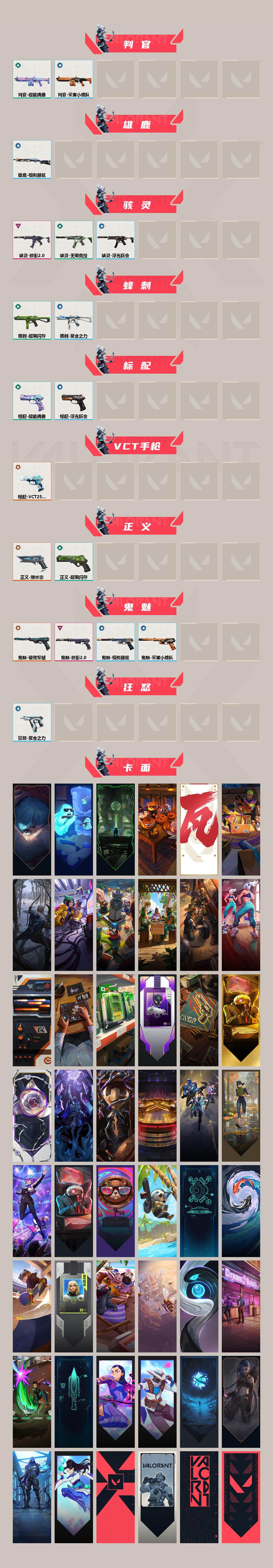 【卡面】:《双城之战》拥抱 卡面,精灵大战 卡面,欢迎来到底城 卡面,南瓜盛典 卡面,VCT CN首冠 卡面,唱片的故事 卡面,钢弓与箭弦 卡面,排除故障 卡面,战术桌游 卡面,悠享食光 卡面,修车达人 卡面,热舞环节 卡面,模拟赫兹 卡面,浮光跃金 卡面,超限闪存 卡面,维斯工牌 卡面,正义的化身 卡面,终章:生意人麦宝 卡面,铁之华 卡面,失而复得 卡面,时间到 卡面,最高舞台 卡面,复活专家 卡面,归乡 // 蝰蛇 卡面,超能偶像 卡面,生意人麦宝 卡面,音熊登场 卡面,树懒大作战 卡面,声感陷阱设计图 卡面,红鳞松叶 卡面,Clutch 卡面,钢锁工牌 卡面,战术小伙伴的夏日 卡面,采蜜小蜂队 卡面,聚合之力 卡面,梦幻奶茶 卡面,源能反应 卡面,零点嗅