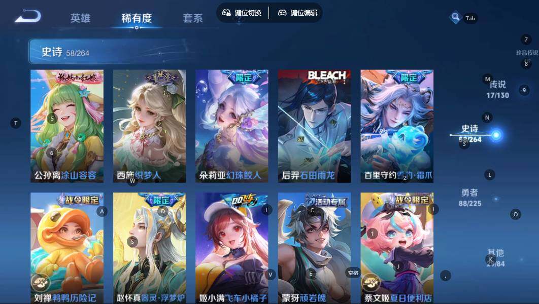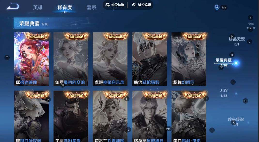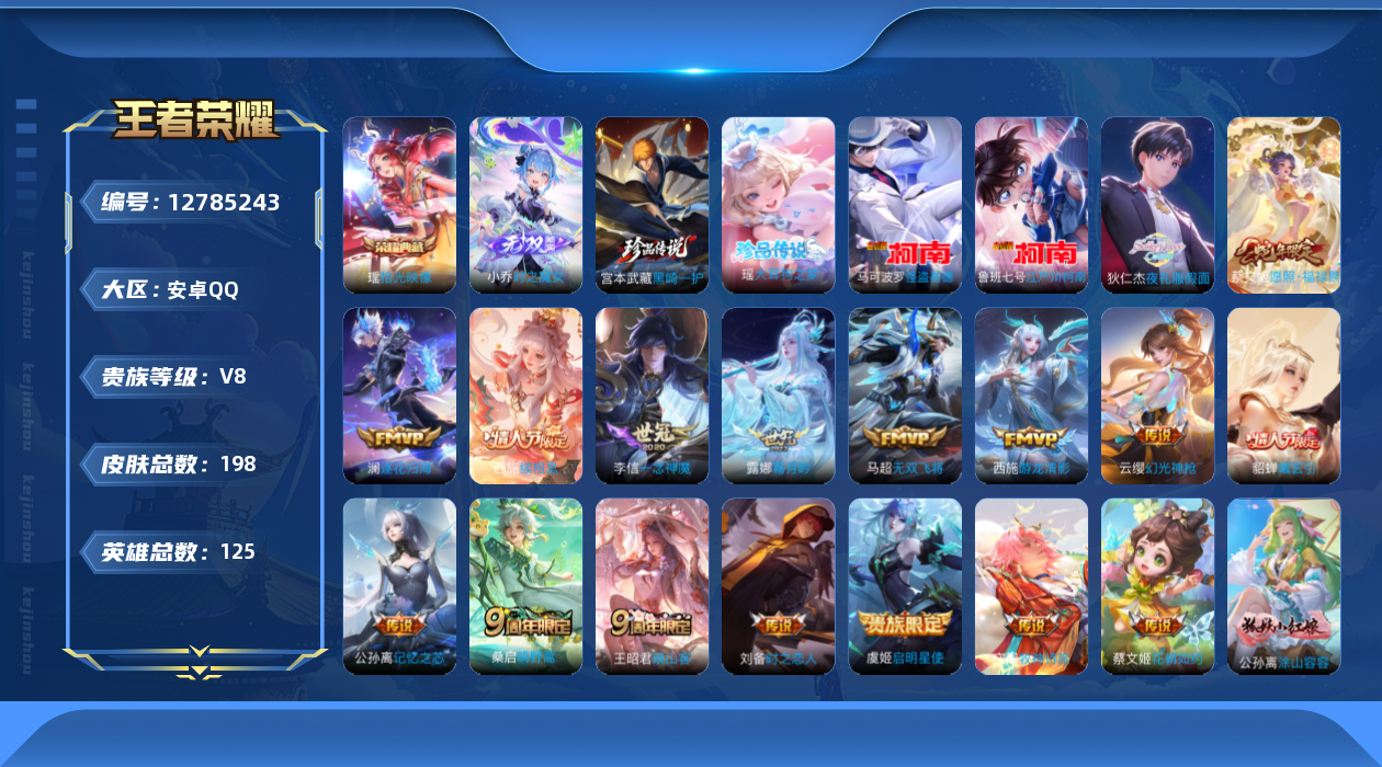 - [11853384]V8 1典藏 1珍品传说 10传说 124英雄 225皮肤 可修改实名 优质装备:鸣剑·曳影,怪盗基德,云鹰飞将(小将军),末日机甲-孙尚香(绿蚂蚱),地狱火,仲夏夜之梦(大飞蛾),无双飞将,涂山容容 珍宝阁皮:玩趣恶龙 限定皮:至尊宝,白虎志(电光耗子),凤求凰(白切鸡),时之彼端,时雨天司(水龙头),神威(电光马子),飞衡(韩信年限),遇见飞天,五谷丰年,游园惊梦,梁祝,天狼溯光者,祈雪灵祝(雪兔子),天狼绘梦者,李小龙,逐梦之影,朱雀志(守约年限),辉光之辰,冰霜恋舞曲,神奇女侠 史诗皮:紫霞仙子,黄金分割率,特工魅影,千年之狐,江河有灵,蒙恬荣光圣徽,无限星赏官,偶像歌手,猫狗日记-大乔,乱世虎臣,节奏热浪,修罗,女仆咖啡,摇滚巨星,水果甜心,星夜王子,功夫厨神,暗隐猎兽者,幽灵船长,鬼剑武藏,心灵战警,地狱岩魂,繁星吟游(呼啦呼啦),缤纷独角兽,乘风破浪,水晶猎龙者,曙光守护者,金属风暴,原初追逐者,圣诞狂欢,圣诞恋歌,鹰眼统帅,魅力维加斯,黎明之约,无心,未来纪元-赵云