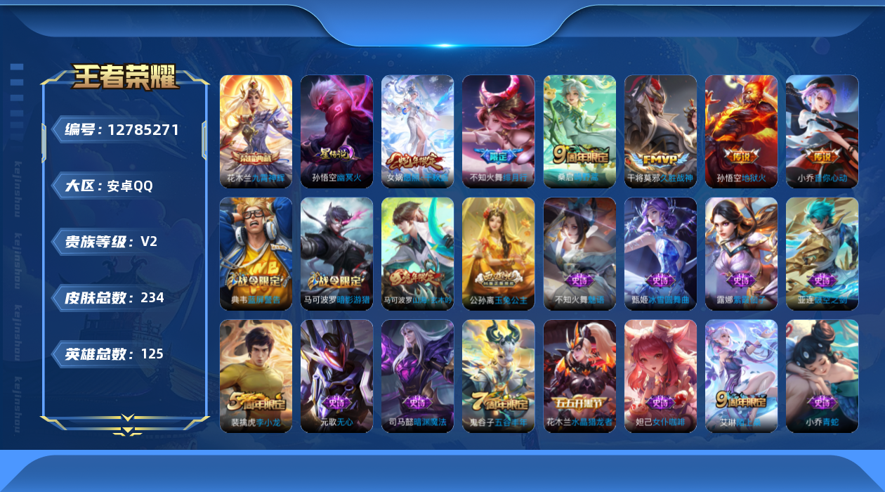 [12785271]中路35段,安卓Q-V2-永恒钻石III段位-125英雄-234皮肤-1典藏-1星传说-6传说-58史诗 【英雄全皮】:影全皮 【荣耀典藏】:花木兰九霄神辉 【传说皮肤】:女娲愿照千秋盛,桑启鸣野蒿,不知火舞绯月行,小乔音你心动,干将莫邪久胜战神,孙悟空地狱火 【限定皮肤】:白起狰,蒙犽顽岩魄,蔡文姬夏日便利店,大乔绒语心约,虞姬夏日便利店,姜子牙天穹之誓,狄仁杰阴阳师,虞姬凯尔特女王,赵云皇家上将,庄周蜃楼王,庄周高山流水,高渐离玩趣恶龙,孙膑妖精王,扁鹊炼金王,芈月重明,吕布猎兽之王,元歌无心,夏侯惇朔风刀,典韦穷奇,典韦蓝屏警告,马可波罗暗影游猎,马可波罗山海玄木吟,狄仁杰魔术师,狄仁杰万华元夜,达摩沙漠行僧,项羽海滩派对,老夫子醍醐杖,安琪拉魔法小厨娘,程咬金演武夺筹,兰陵王金庭之子,不知火舞绯月行,亚瑟狮心王,牛魔御旌,后羿圣弓游侠,李元芳云中旅人,女娲朔望之晖,干将莫邪真爱魔法,鬼谷子原初探秘者,鬼谷子五谷丰年,苏烈千军破阵,百里玄策原初追逐者,弈星混沌棋,公孙离玉兔公主,沈梦溪大漠名商,明世隐疑决卦,裴擒虎李小龙,狂铁御狮,米莱狄御霄,盾山御銮,上官婉儿梁祝,嫦娥拒霜思,鲁班大师探海日志,桑启海盐诗旅,艾琳女武神,沈梦溪龙舞盛年,刘邦剑破天穹,镜青焰无极,项羽苍威无极,刘备异域游侠,芈月浮光幕影,周瑜熔金海岸 【年限皮肤】:马可波罗山海玄木吟 【赛季限定】:庄周蜃楼王,孙膑妖精王,扁鹊炼金王,白起狰,芈月重明,夏侯惇朔风刀,典韦穷奇,狄仁杰万华元夜,达摩沙漠行僧,老夫子醍醐杖,程咬金演武夺筹,兰陵王金庭之子,亚瑟狮心王,牛魔御旌,李元芳云中旅人,虞姬凯尔特女王,鬼谷子原初探秘者,苏烈千军破阵,百里玄策原初追逐者,弈星混沌棋,沈梦溪大漠名商,明世隐疑决卦,狂铁御狮,米莱狄御霄,盾山御銮,鲁班大师探海日志,桑启海盐诗旅,刘邦剑破天穹,姜子牙天穹之誓 【战令限定】:蔡文姬夏日便利店,虞姬夏日便利店,吕布猎兽之王,典韦蓝屏警告,马可波罗暗影游猎,后羿圣弓游侠,女娲朔望之晖,干将莫邪真爱魔法,镜青焰无极,项羽苍威无极 【史诗皮肤】:露娜紫霞仙子,赵云皇家上将,貂蝉圣诞恋歌,甄姬冰雪圆舞曲,王昭君偶像歌手,狄仁杰魔术师,廉颇地狱岩魂,宫本武藏鬼剑武藏,孙尚香水果甜心,妲己女仆咖啡,墨子金属风暴,刘禅绅士熊喵,李白千年之狐,安琪拉魔法小厨娘,花木兰水晶猎龙者,刘邦