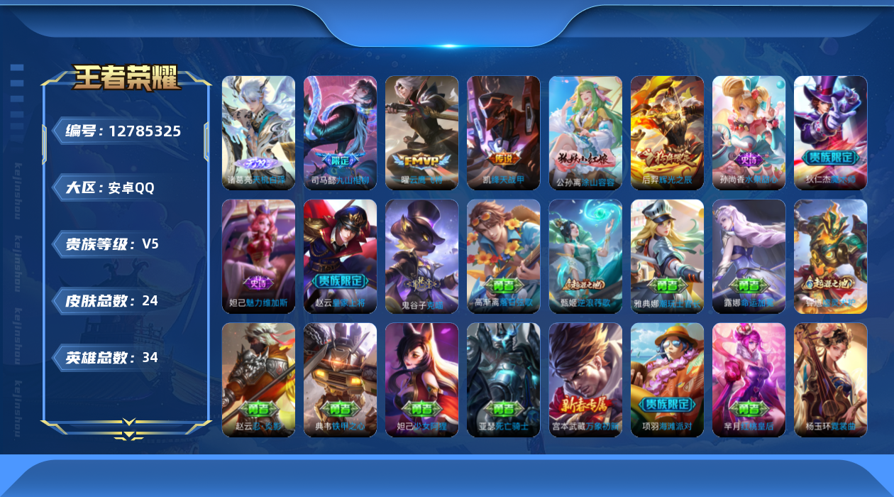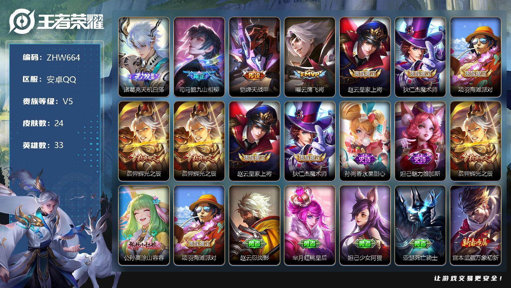 [12785325]【特价急出/详情看图】安卓Q-V5-永恒钻石III段位-33英雄-24皮肤-1无双-3传说-6史诗