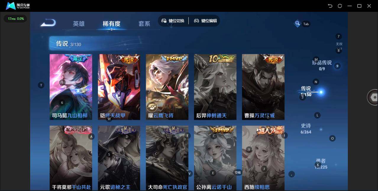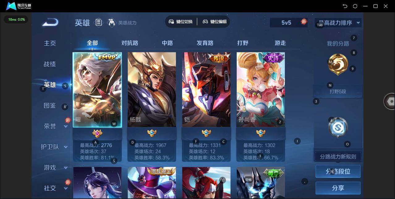 - [8956578]实名: 可修改 贵族等级: V7 英雄数: 123 皮肤数: 228 荣耀水晶: 无限飓风号 传说皮: 云鹰飞将,绛天战甲,一念神魔,无双飞将,幻光神枪 限定皮: 飞衡,青龙志,武陵仙君,如梦令-后羿,高山流水,孙行者,傲雪梅枪,百木心枪,五谷丰年,神器·万象笔,山海·玄木吟,鸣野蒿,愿照·山河定,愿照·岁时盈
