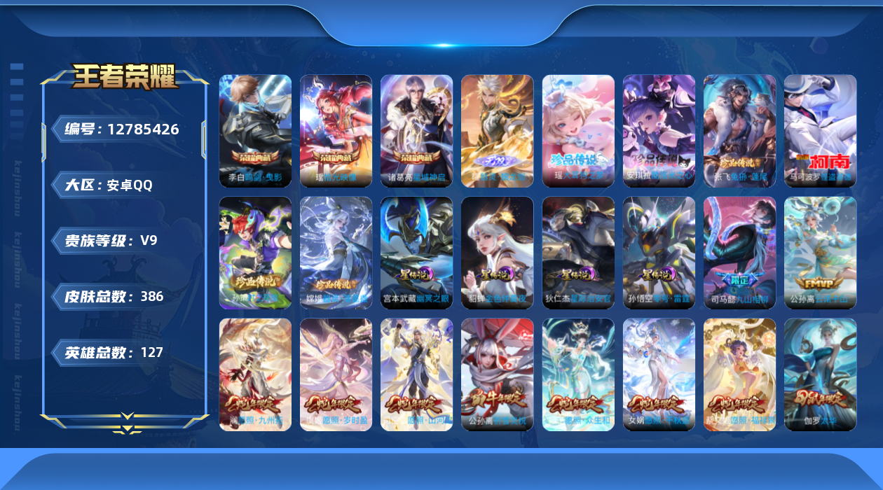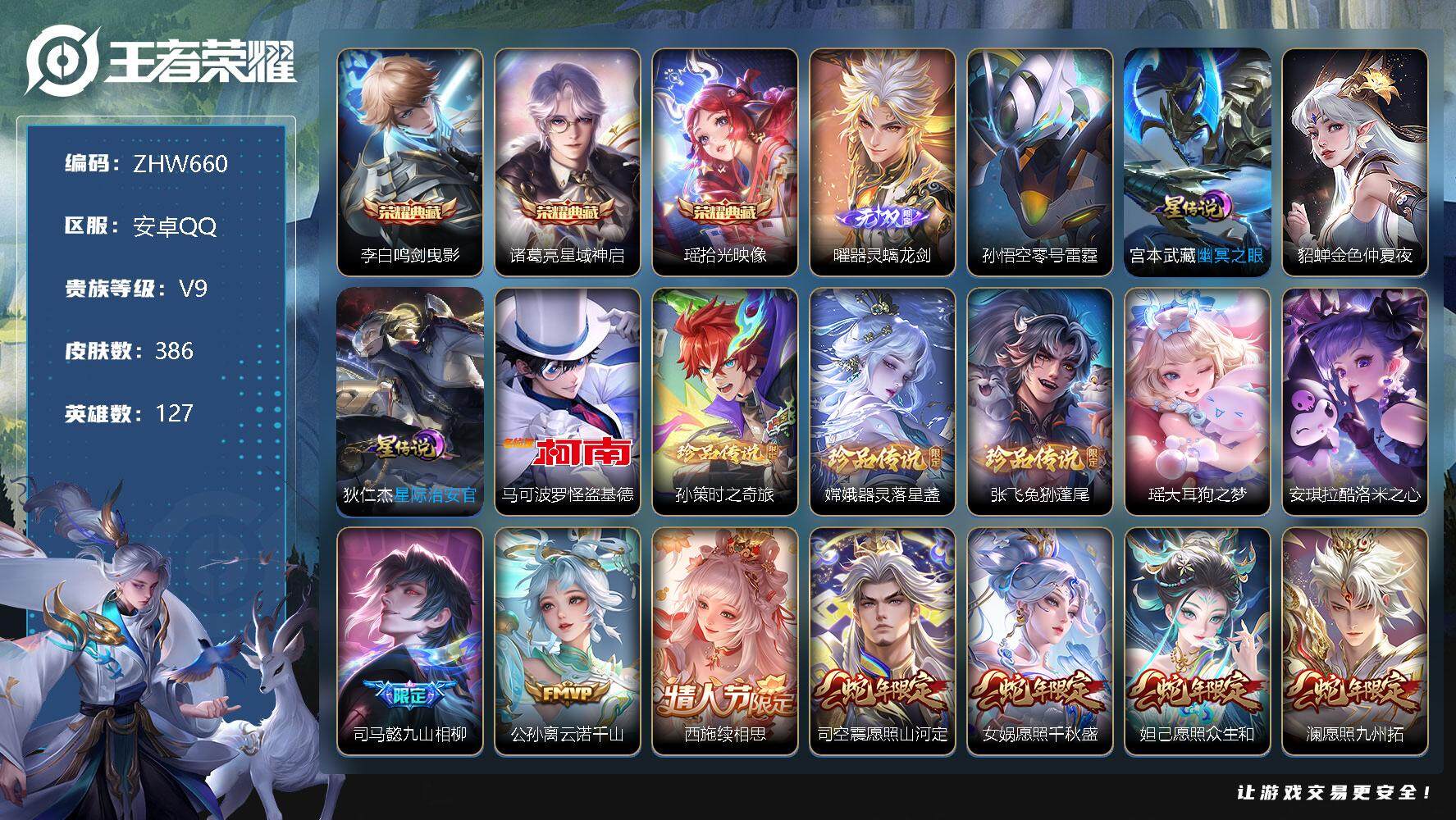 [12785426]安卓Q-V9-最强王者段位-127英雄-386皮肤-3典藏-4星传说-1无双-6珍品传说-32传说-115史诗