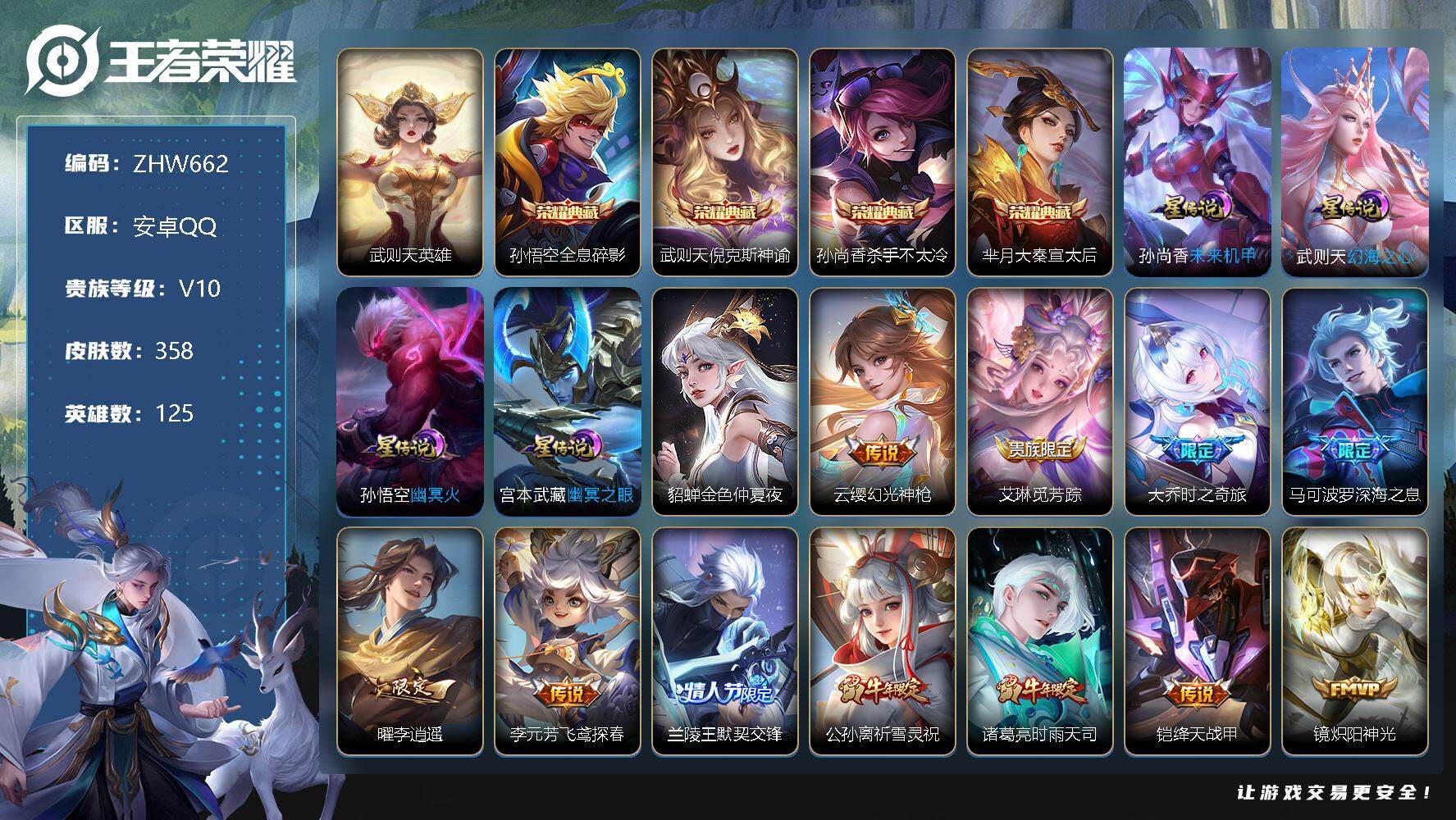 [12785351]【特价急出/详情看图】安卓Q-V10-最强王者段位-125英雄-358皮肤-4典藏-34传说-119史诗