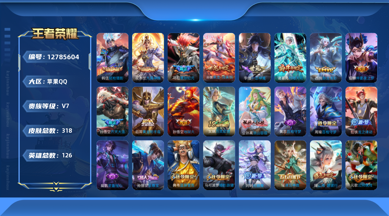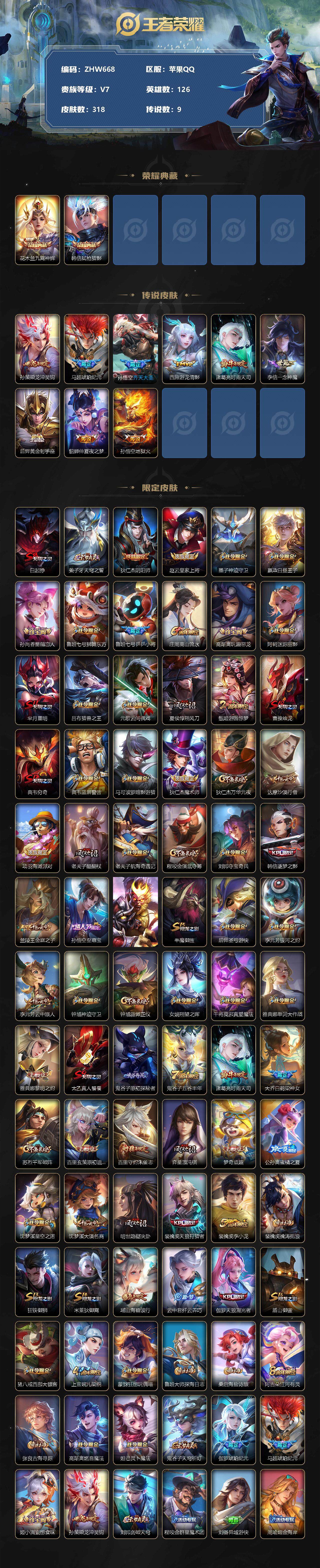 [12785604]苹果Q-V7-最强王者段位-126英雄-318皮肤-2典藏-9传说-90史诗