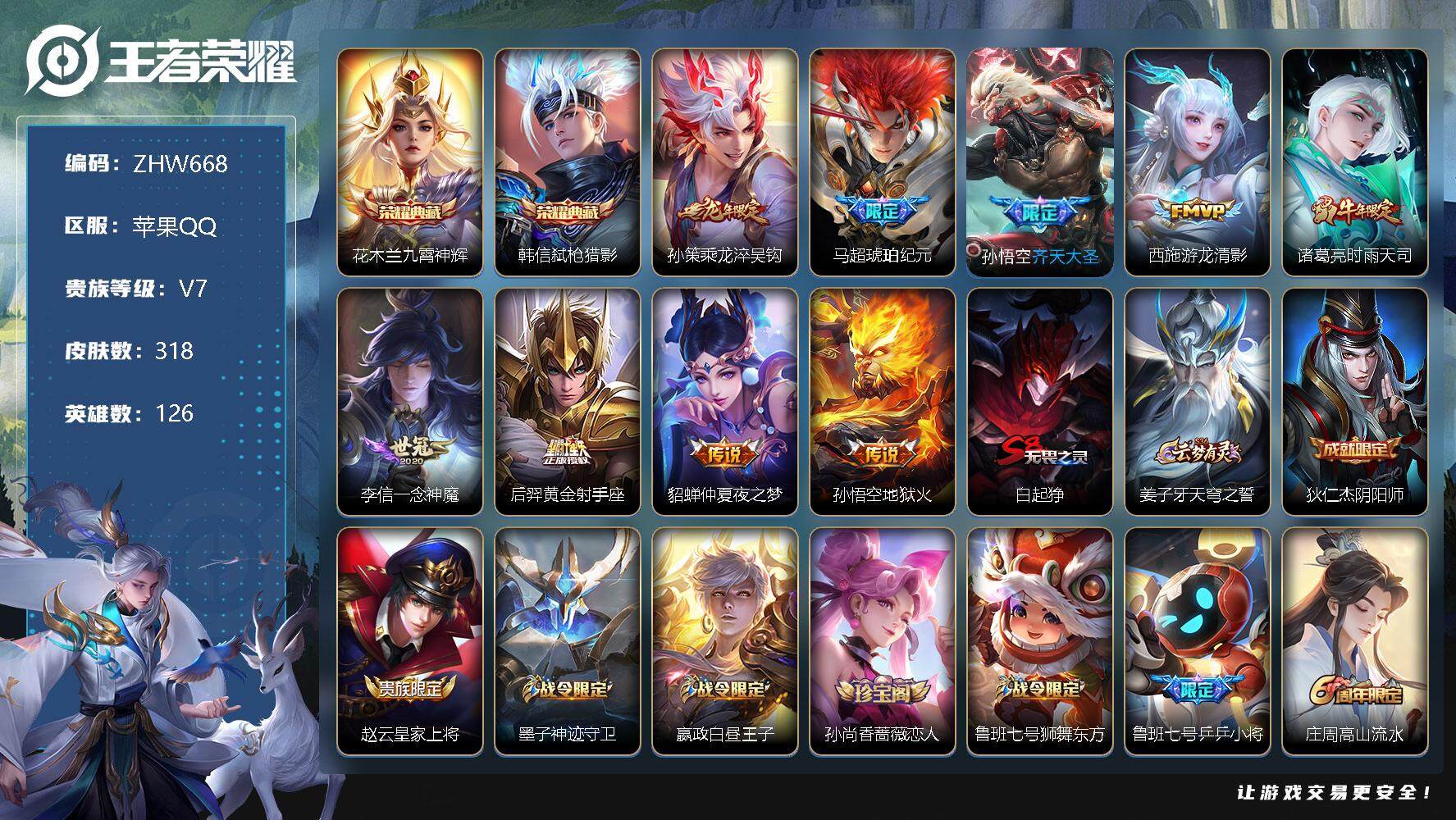 [12785604]苹果Q-V7-最强王者段位-126英雄-318皮肤-2典藏-9传说-90史诗 【英雄全皮】:刘邦全皮,孙权全皮,雅典娜全皮,鬼谷子全皮,影全皮 【荣耀典藏】:花木兰九霄神辉,韩信弑枪猎影 【传说皮肤】:孙策乘龙淬吴钩,马超琥珀纪元,孙悟空齐天大圣,西施游龙清影,诸葛亮时雨天司,李信一念神魔,后羿黄金射手座,貂蝉仲夏夜之梦,孙悟空地狱火 【限定皮肤】:白起狰,姜子牙天穹之誓,狄仁杰阴阳师,赵云皇家上将,墨子神迹守卫,嬴政白昼王子,孙尚香蔷薇恋人,鲁班七号狮舞东方,鲁班七号乒乒小将,庄周高山流水,高渐离玩趣恶龙,阿轲迷踪丽影,芈月重明,吕布猎兽之王,元歌云间偶戏,夏侯惇朔风刀,甄姬游园惊梦,曹操烛龙,典韦穷奇,典韦蓝屏警告,马可波罗暗影游猎,狄仁杰魔术师,狄仁杰万华元夜,达摩沙漠行僧,项羽海滩派对,老夫子醍醐杖,老夫子航海奇遇记,程咬金演武夺筹,刘邦夺宝奇兵,韩信逐梦之影,兰陵王金庭之子,孙悟空至尊宝,孙悟空齐天大圣,牛魔御旌,后羿圣弓游侠,李元芳银河之约,李元芳云中旅人,钟馗神迹守卫,钟馗驱傩正仪,女娲朔望之晖,干将莫邪真爱魔法,雅典娜单词大作战,雅典娜黎明之约,太乙真人饕餮,鬼谷子原初探秘者,鬼谷子五谷丰年,诸葛亮时雨天司,大乔白鹤梁神女,苏烈千军破阵,百里玄策原初追逐者,百里守约朱雀志,弈星混沌棋,梦奇顽趣,公孙离蜜橘之夏,沈梦溪星空之诺,沈梦溪大漠名商,明世隐疑决卦,裴擒虎天狼狩猎者,裴擒虎李小龙,裴擒虎擒涛扼浪,狂铁御狮,米莱狄御霄,瑶山海碧波行,云中君纤云弄巧,伽罗天狼溯光者,盾山御銮,猪八戒西部大镖客,上官婉儿梁祝,蒙犽狂想玩偶喵,鲁班大师探海日志,桑启海盐诗旅,阿古朵江河有灵,张良古海寻踪,高渐离燃音魔法,妲己灵卜魔法,鬼谷子天穹祈灯,伽罗琥珀纪元,马超琥珀纪元,姬小满妄想食味,孙策乘龙淬吴钩,刘邦剑破天穹,程咬金群星魔术团,刘备异域游侠,周瑜熔金海岸 【年限皮肤】:百里守约朱雀志,诸葛亮时雨天司,瑶山海碧波行,孙策乘龙淬吴钩 【赛季限定】:白起狰,芈月重明,夏侯惇朔风刀,曹操烛龙,典韦穷奇,狄仁杰万华元夜,达摩沙漠行僧,老夫子醍醐杖,程咬金演武夺筹,兰陵王金庭之子,张良古海寻踪,牛魔御旌,李元芳云中旅人,钟馗驱傩正仪,雅典娜黎明之约,太乙真人饕餮,鬼谷子原初探秘者,苏烈千军破阵,百里玄策原初追逐者,弈星混沌棋,梦奇顽趣,沈梦溪大漠名商,明世隐疑决卦,