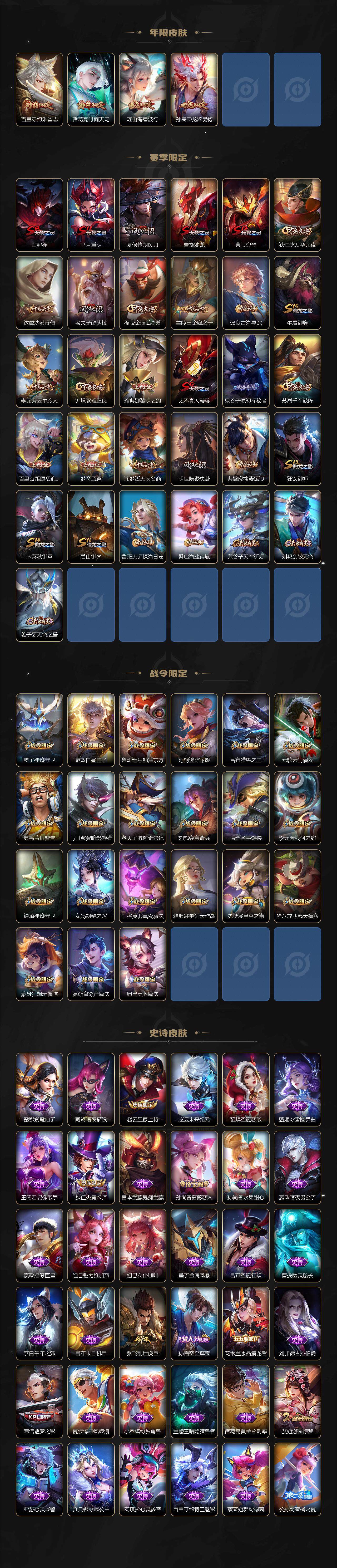 【赛季限定】:白起狰,芈月重明,夏侯惇朔风刀,曹操烛龙,典韦穷奇,狄仁杰万华元夜,达摩沙漠行僧,老夫子醍醐杖,程咬金演武夺筹,兰陵王金庭之子,张良古海寻踪,牛魔御旌,李元芳云中旅人,钟馗驱傩正仪,雅典娜黎明之约,太乙真人饕餮,鬼谷子原初探秘者,苏烈千军破阵,百里玄策原初追逐者,弈星混沌棋,梦奇顽趣,沈梦溪大漠名商,明世隐疑决卦,