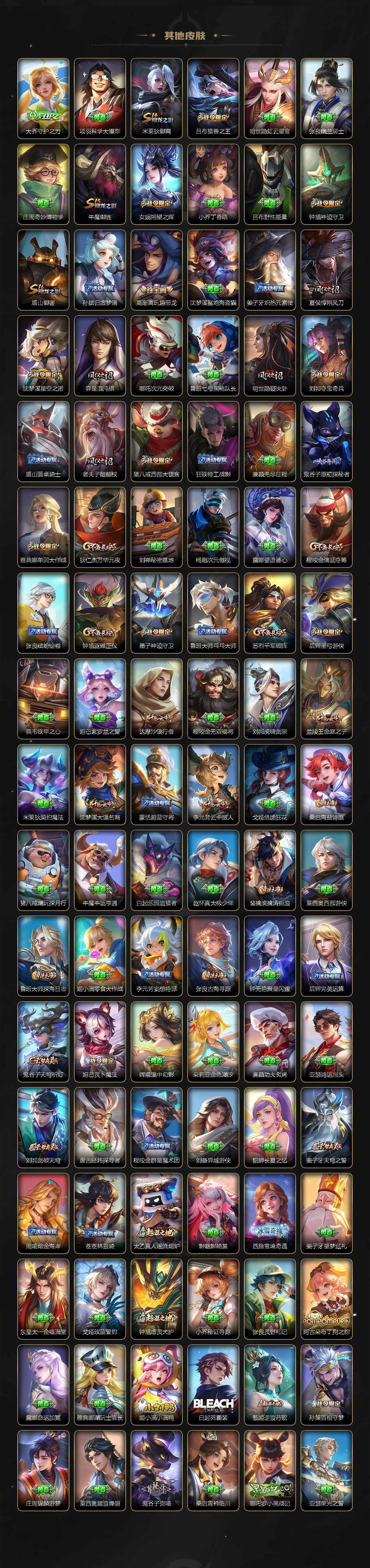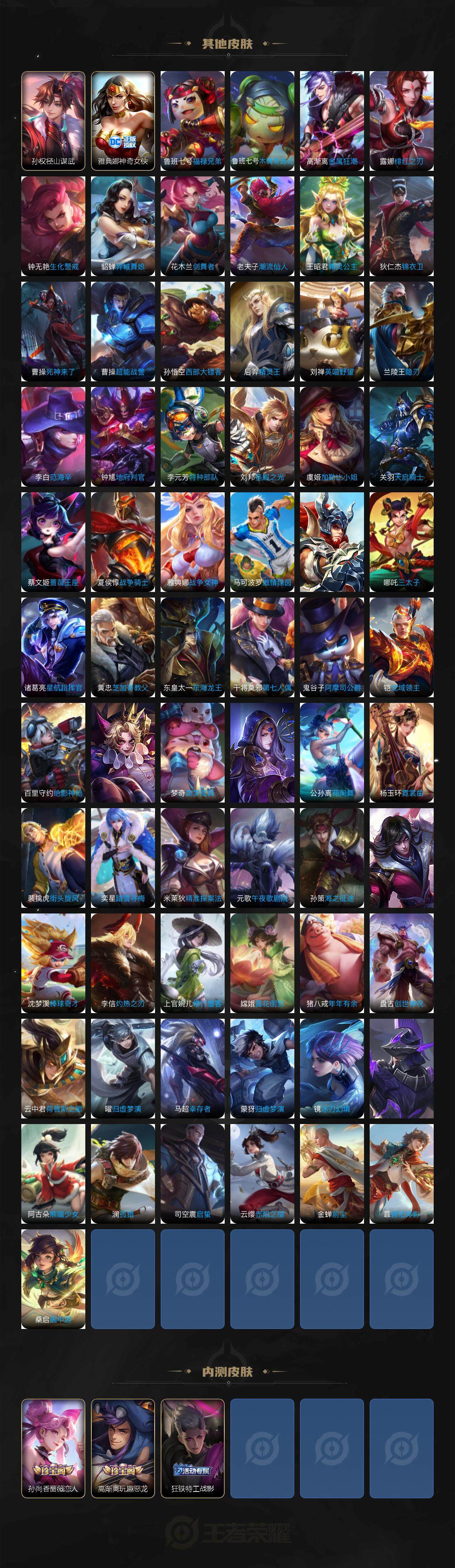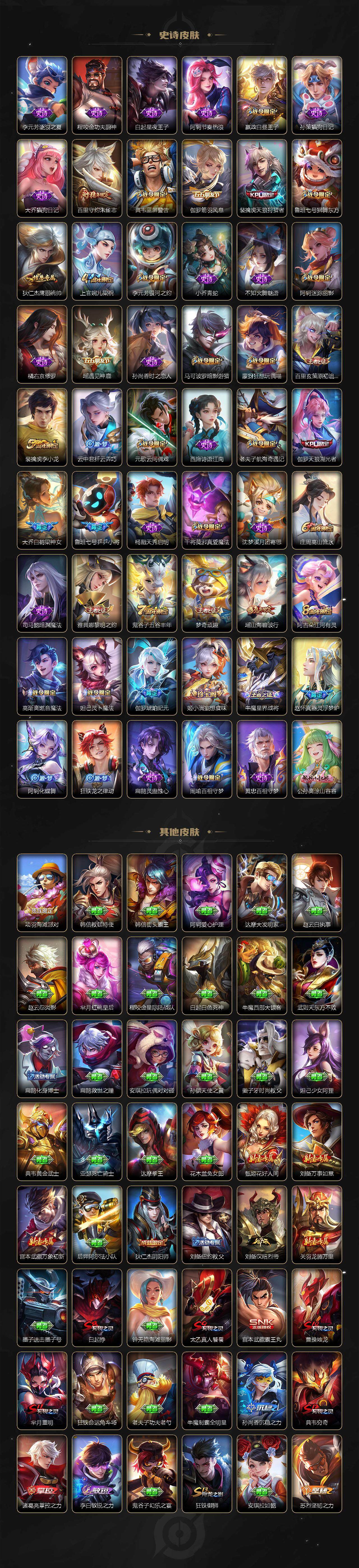 【限定皮肤】:白起狰,姜子牙天穹之誓,狄仁杰阴阳师,赵云皇家上将,墨子神迹守卫,嬴政白昼王子,孙尚香蔷薇恋人,鲁班七号狮舞东方,鲁班七号乒乒小将,庄周高山流水,高渐离玩趣恶龙,阿轲迷踪丽影,芈月重明,吕布猎兽之王,元歌云间偶戏,夏侯惇朔风刀,甄姬游园惊梦,曹操烛龙,典韦穷奇,典韦蓝屏警告,马可波罗暗影游猎,狄仁杰魔术师,狄仁杰万华元夜,达摩沙漠行僧,项羽海滩派对,老夫子醍醐杖,老夫子航海奇遇记,程咬金演武夺筹,刘邦夺宝奇兵,韩信逐梦之影,兰陵王金庭之子,孙悟空至尊宝,孙悟空齐天大圣,牛魔御旌,后羿圣弓游侠,李元芳银河之约,李元芳云中旅人,钟馗神迹守卫,钟馗驱傩正仪,女娲朔望之晖,干将莫邪真爱魔法,雅典娜单词大作战,雅典娜黎明之约,太乙真人饕餮,鬼谷子原初探秘者,鬼谷子五谷丰年,诸葛亮时雨天司,大乔白鹤梁神女,苏烈千军破阵,百里玄策原初追逐者,百里守约朱雀志,弈星混沌棋,梦奇顽趣,公孙离蜜橘之夏,沈梦溪星空之诺,沈梦溪大漠名商,明世隐疑决卦,裴擒虎天狼狩猎者,裴擒虎李小龙,裴擒虎擒涛扼浪,狂铁御狮,米莱狄御霄,瑶山海碧波行,云中君纤云弄巧,伽罗天狼溯光者,盾山御銮,猪八戒西部大镖客,上官婉儿梁祝,蒙犽狂想玩偶喵,鲁班大师探海日志,桑启海盐诗旅,阿古朵江河有灵,张良古海寻踪,高渐离燃音魔法,妲己灵卜魔法,鬼谷子天穹祈灯,伽罗琥珀纪元,马超琥珀纪元,姬小满妄想食味,孙策乘龙淬吴钩,刘邦剑破天穹,程咬金群星魔术团,刘备异域游侠,周瑜熔金海岸