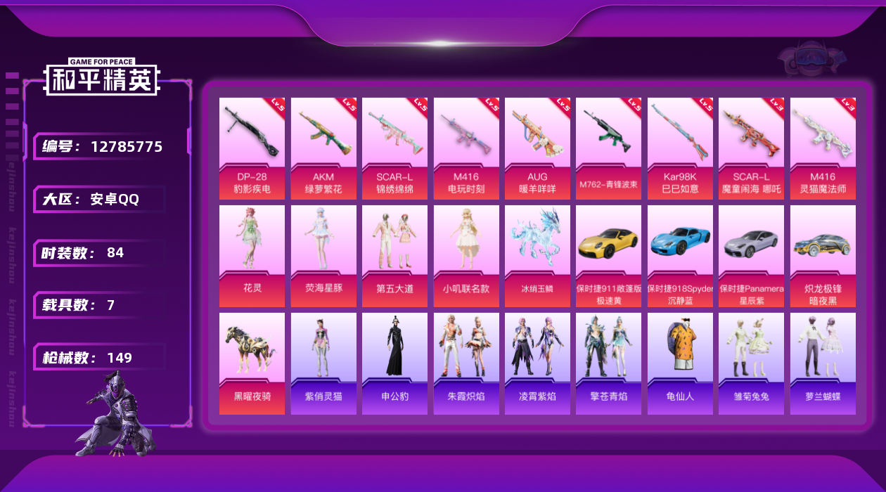 [12785775]素材身法号 安卓 手Q-4粉装-9特效枪-7载具-4粉色飞行器-5.4w热力值-7王牌印记-84套装-149枪皮【热门品类】:套装-龟仙人【粉色载具】:炽龙极锋(暗夜黑),保时捷911 敞篷版(极速黄),保时捷Panamera(星辰紫),保时捷918 Spyder(沉静蓝),僚机-冰龙团团,黑曜夜骑,冰绡玉鳞【粉色套装】:粉装-第五大道,角色-小叽联名款,角色-荧海星豚,角色-花灵【粉色枪皮等级】:AKM-绿萝繁花(五级),SCAR-L-锦绣绵绵(五级),SCAR-L-魔童闹海 哪吒(三级),M416-电玩时刻(五级),M416-灵猫魔法师(三级),AUG-暖羊咩咩(五级),M762-青锋波束(五级),Kar98K-巳巳如意(五级),DP-28-豹影疾电(五级)【粉色飞行器】:夜幕颂歌飞行器,灵猫魔法师飞行器,灵珠游龙飞行器