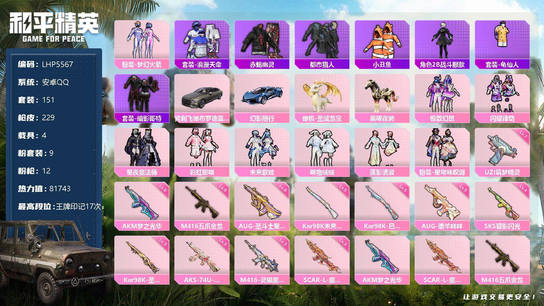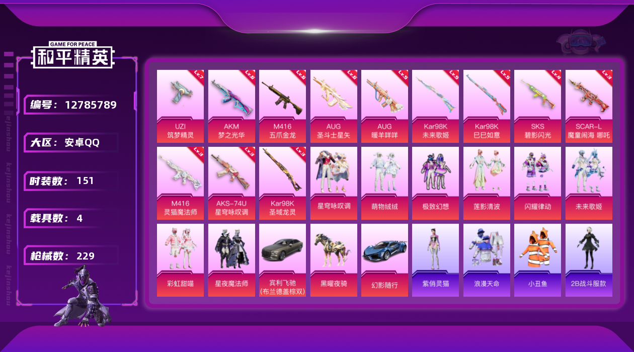 [12785789]素材身法号/绝世印记1/地铁满天赋 安卓 手Q-9粉装-12特效枪-4载具-10粉色飞行器-8.1w热力值-17王牌印记-151套装-229枪皮【热门品类】:粉装-梦幻火箭,套装-浪漫天命,套装-赤蝎幽灵,套装-都市猎人,套装-小丑鱼,角色-2B战斗服款,套装-龟仙人,套装-暗影哥特【粉色载具】:宾利飞驰(布罗德盖棕双色),幻影随行,僚机-圣域龙宝,黑曜夜骑【粉色套装】:粉装-梦幻火箭,粉装-极致幻想,粉装-闪耀律动,粉装-星夜魔法师,粉装-彩虹甜喵,粉装-未来歌姬,粉装-萌物绒绒,粉装-莲影清波,粉装-星穹咏叹调【粉色枪皮等级】:AKM-梦之光华(六级),SCAR-L-魔童闹海 哪吒(三级),M416-五爪金龙(六级),M416-灵猫魔法师(三级),AUG-暖羊咩咩(五级),AUG-圣斗士星矢(六级),UZI-筑梦精灵(七级),AKS-74U-星穹咏叹调(三级),Kar98K-未来歌姬(五级),Kar98K-巳巳如意(五级),Kar98K-圣域龙灵(三级),SKS-碧影闪光(四级)【粉色飞行器】:梦幻火箭飞行器,天之羽翼飞行器,歌者泠鸢飞行器,粉樱探戈飞行器,拂晓神骑飞行器,萌物绒绒飞行器,繁龙极客飞行器,圣域金龙飞行器,灵猫魔法师飞行器,飞天猪飞行器
