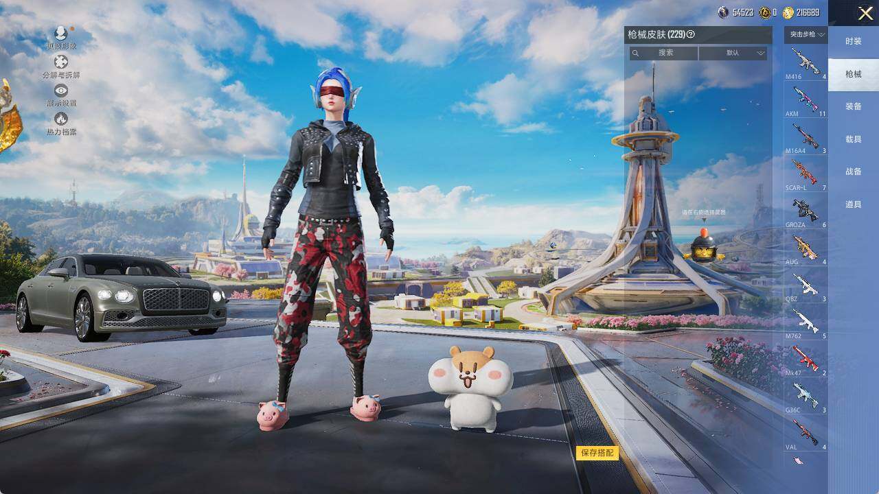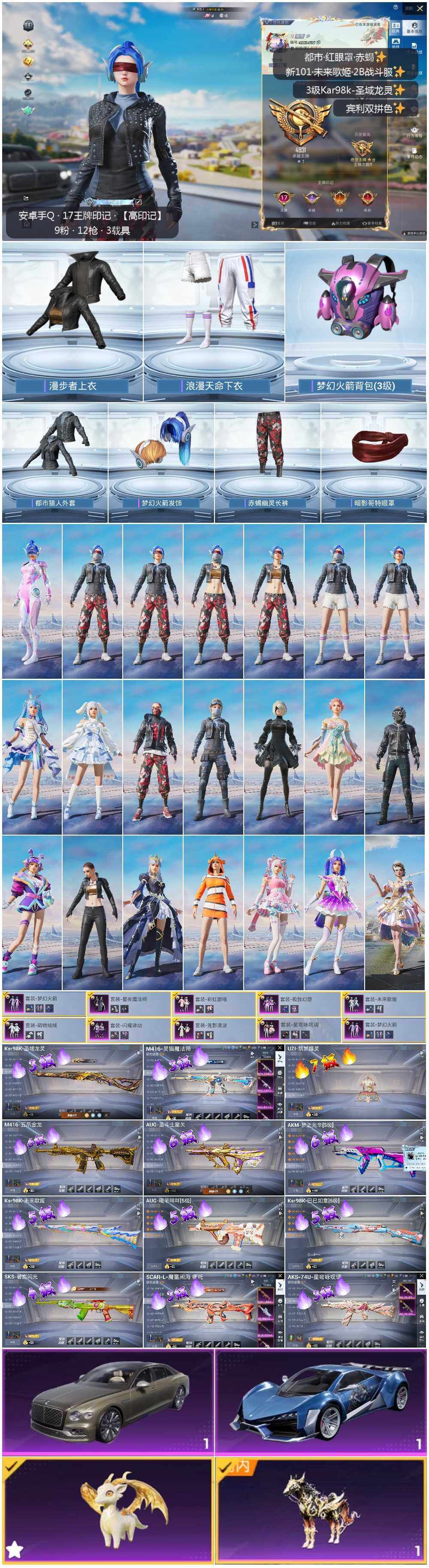 AKM-梦之光华,M416-五爪金龙,AUG-暖羊咩咩,UZI-筑梦精灵,Kar98K-未来歌姬,Kar98K-巳巳如意,Kar98K-圣域龙灵,SKS-碧影闪光