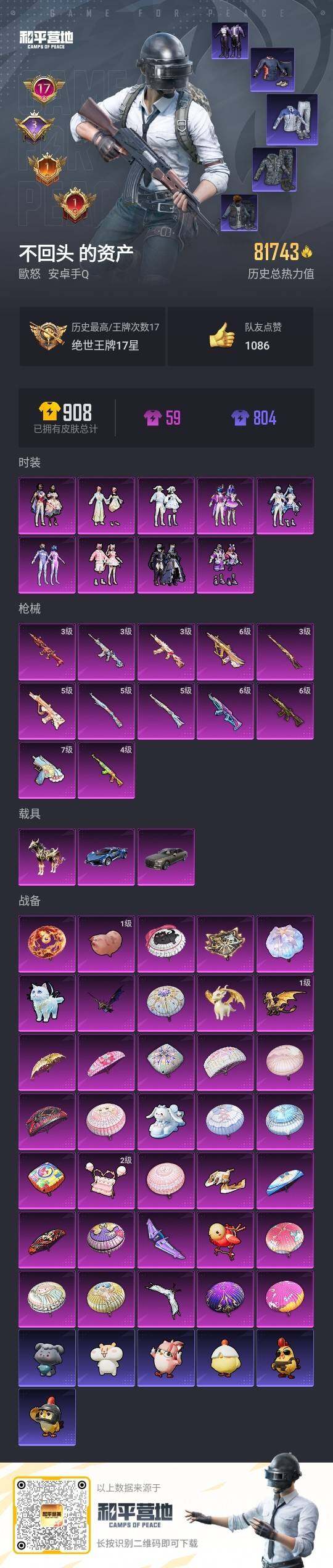 - PX_2083208- 苹果手Q-18王牌印记-7粉装-6特效枪-2载具-77082热力值-169套装-236枪皮-2卓越印记-1传奇印记 【7粉装】,梦幻火箭,宝贝奶油派,天使彩虹糖,洛天依,千金淑猫,沙场疾风,极限特训 【6特效枪】AKM-星际浪客-7级 SCAR-L-青春物语-6级 M416-至情至圣-7级 M416-风花雪月-5级 AUG-暖羊咩咩-5级 Kar98K-巳巳如意-5级 【