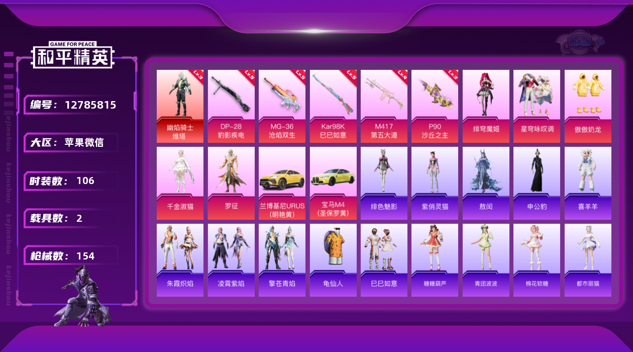 [12785815]绝世印记3 苹果 微信-1神装-5粉装-5特效枪-2载具-6粉色飞行器-5.2w热力值-7王牌印记-106套装-154枪皮【红色神装等级】:幽焰骑士-维塔(三级)【热门品类】:套装-龟仙人【粉色载具】:兰博基尼URUS(明艳黄),宝马M4(圣保罗黄)【粉色套装】:粉装-傲傲奶龙,角色-千金淑猫,粉装-星穹咏叹调,角色-罗征,角色-绯穹魔姬【粉色枪皮等级】:P90-沙丘之主(三级),Kar98K-巳巳如意(五级),M417-第五大道(四级),DP-28-豹影疾电(五级),MG-36-沧焰双生(五级)【粉色飞行器】:酣梦熊熊飞行器,繁龙极客飞行器,镜域双华-灵镜之阶,龙翔九天飞行器,幽焰列车飞行器