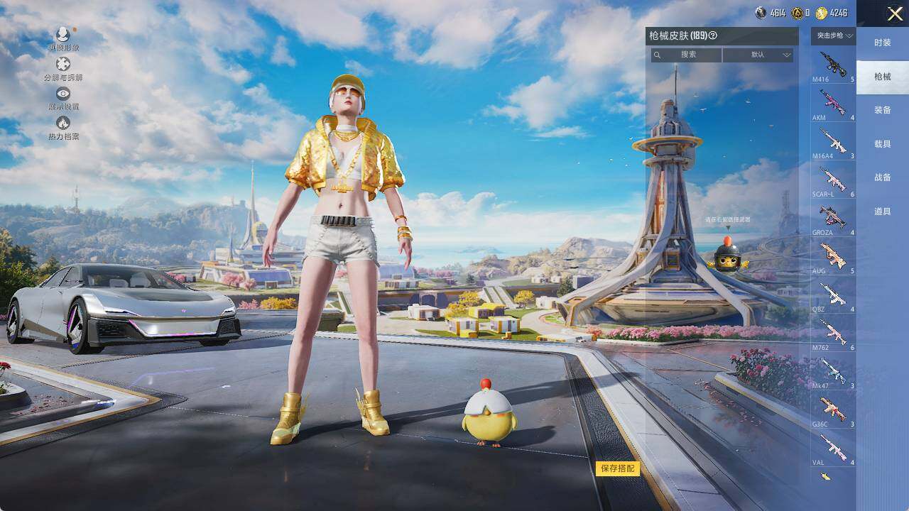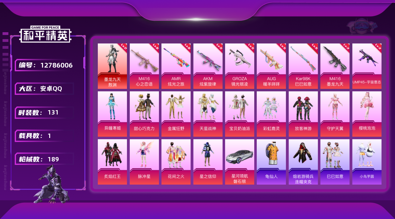 AKM-炫紫旋律,M416-心之恋语,M416-墨龙九天,GROZA-镜光银凌,AUG-暖羊咩咩,UMP45-宇宙意志,Kar98K-巳巳如意,AMR-炫光之旅