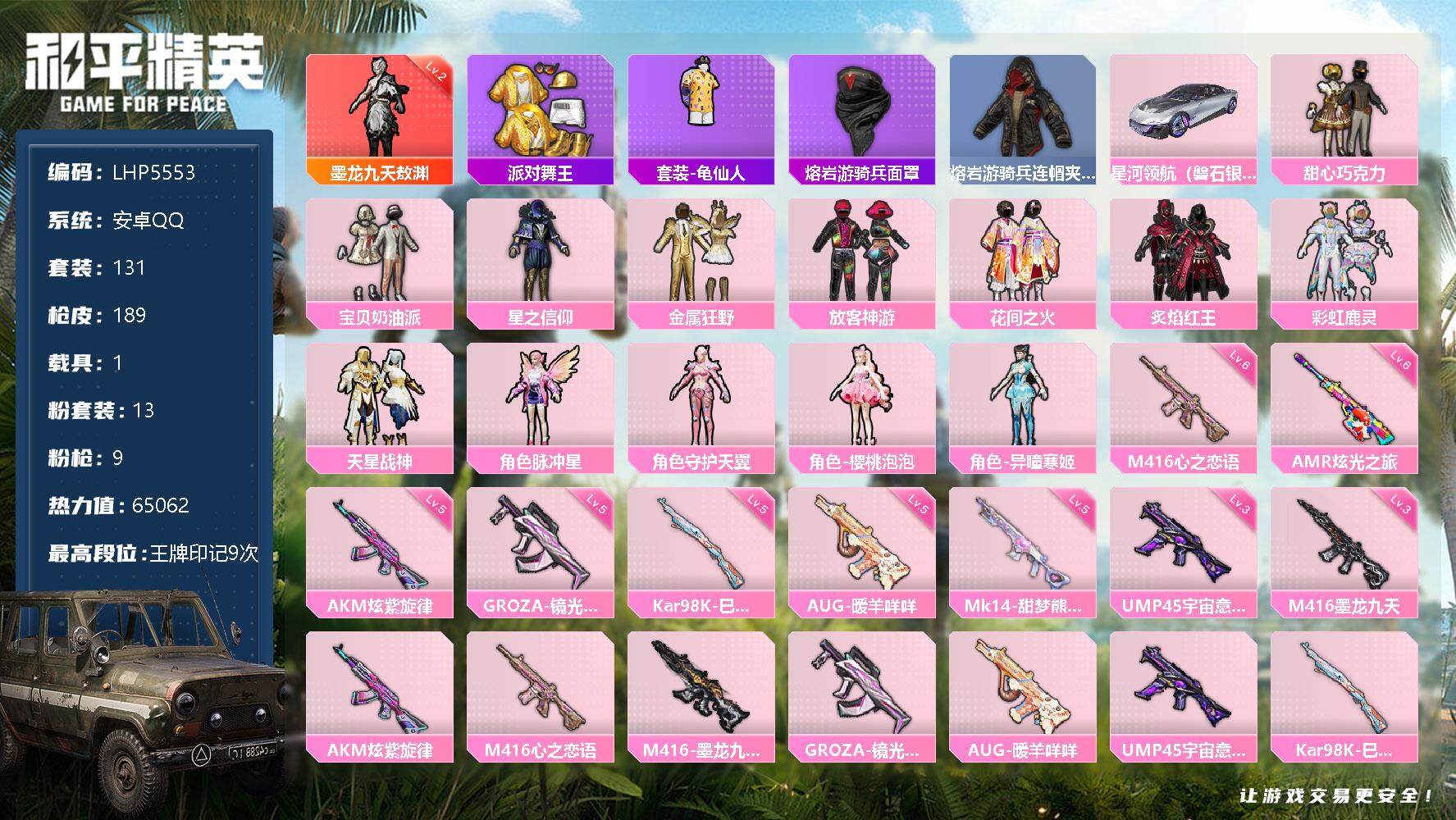 [12786006]素材身法号/扭蛋碎片763/地铁满天赋 安卓 手Q-1神装-13粉装-9特效枪-1载具-4粉色飞行器-6.5w热力值-9王牌印记-131套装-189枪皮【红色神装等级】:墨龙九天-敖渊(二级)【热门品类】:套装-派对舞王,套装-龟仙人,熔岩游骑兵面罩,熔岩游骑兵连帽夹克【粉色载具】:星河领航(磐石银)【粉色套装】:粉装-甜心巧克力,粉装-宝贝奶油派,粉装-星之信仰,粉装-金属狂野,粉装-放客神游,粉装-花间之火,粉装-炙焰红王,粉装-彩虹鹿灵,粉装-天星战神,角色-脉冲星,角色-守护天翼,角色-樱桃泡泡,角色-异瞳寒姬【粉色枪皮等级】:AKM-炫紫旋律(五级),M416-心之恋语(六级),M416-墨龙九天(三级),GROZA-镜光银凌(五级),AUG-暖羊咩咩(五级),UMP45-宇宙意志(三级),Kar98K-巳巳如意(五级),Mk14-甜梦熊击(五级),AMR-炫光之旅(六级)【粉色飞行器】:黄族统领飞行器,龙翔九天飞行器,深渊漩涡飞行器,彩虹独角兽飞行器