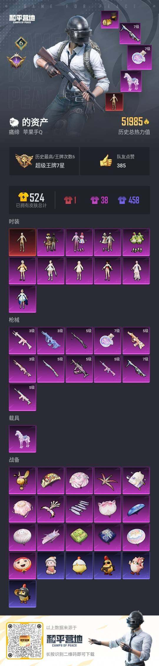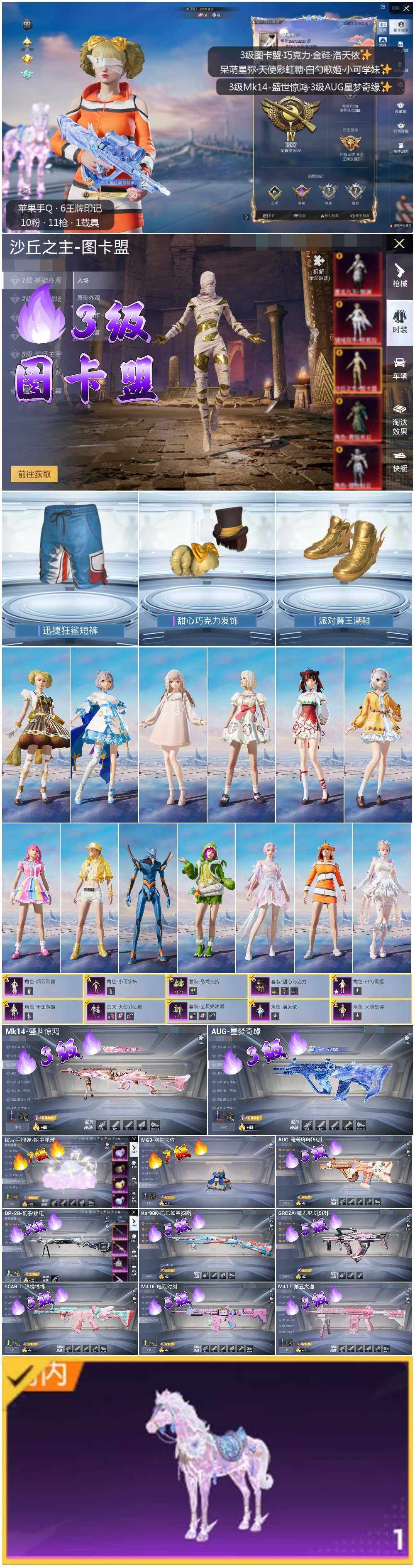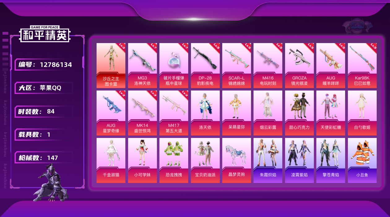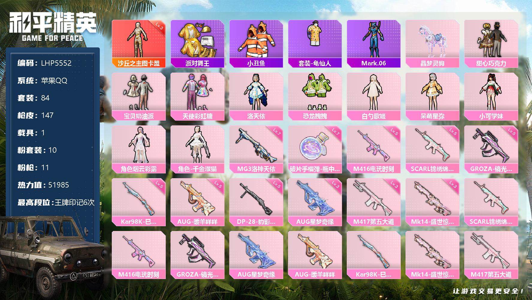 [12786134]素材身法号 苹果 手Q-1神装-10粉装-11特效枪-1载具-5粉色飞行器-5.1w热力值-6王牌印记-84套装-147枪皮【红色神装等级】:沙丘之主-图卡盟(三级)【热门品类】:套装-派对舞王,套装-小丑鱼,套装-龟仙人,角色-Mark.06【粉色载具】:晶梦灵驹【粉色套装】:粉装-甜心巧克力,粉装-宝贝奶油派,粉装-天使彩虹糖,角色-洛天依,粉装-恐龙拽拽,角色-白勺歌姬,角色-呆萌星弥,角色-小可学妹,角色-烟云彩露,角色-千金淑猫【粉色枪皮等级】:SCAR-L-锦绣绵绵(五级),M416-电玩时刻(五级),GROZA-镜光银凌(五级),AUG-星梦奇缘(三级),AUG-暖羊咩咩(五级),Kar98K-巳巳如意(五级),Mk14-盛世惊鸿(三级),M417-第五大道(三级),DP-28-豹影疾电(五级),MG3-洛神天依(七级),破片手榴弹-瓶中星球(七级)【粉色飞行器】:酣梦熊熊飞行器,镜域双华-灵镜之阶,凤舞九天飞行器