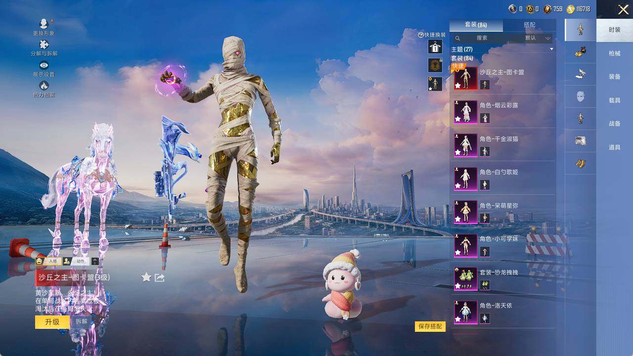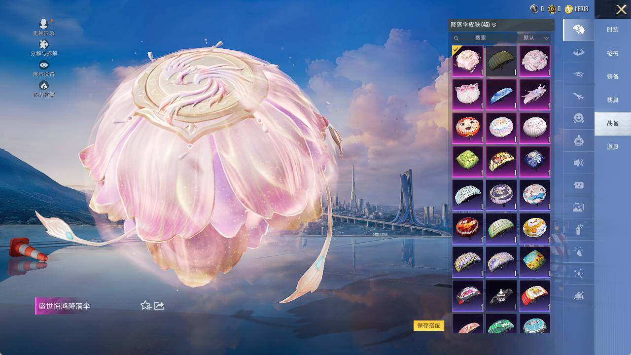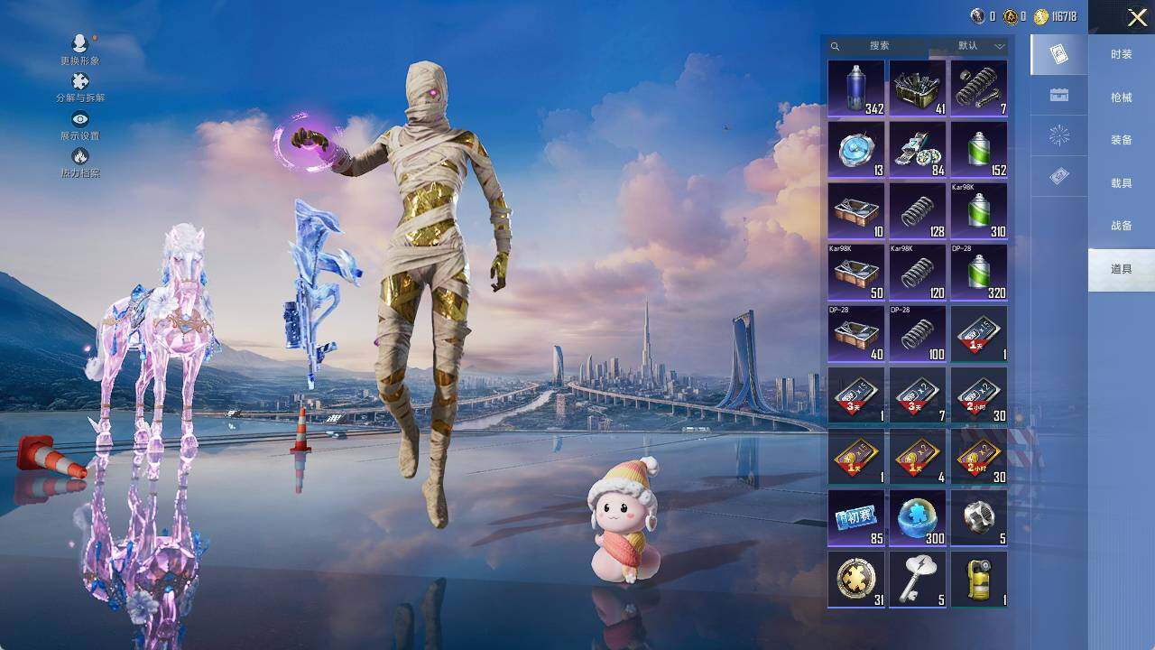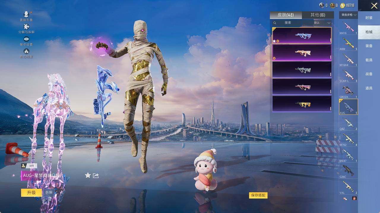 M416-电玩时刻,GROZA-镜光银凌,AUG-星梦奇缘,AUG-暖羊咩咩,Kar98K-巳巳如意,Mk14-盛世惊鸿,M417-第五大道,MG3-洛神天依