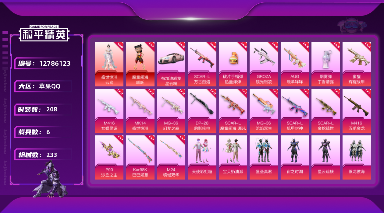 - PX_2093852- 苹果手Q-16王牌印记-10粉装-9特效枪-1载具-73827热力值-197套装-237枪皮-5卓越印记-3传奇印记 【10粉装】,甜心巧克力,宝贝奶油派,天使彩虹糖,放客神游,天龙座 紫龙,冷漠罗丽,星穹咏叹调,光极星,深渊皇后,圣堂之誓 【9特效枪】AKM-绿萝繁花-5级 SCAR-L-锦绣绵绵-5级 M416-风花雪月-5级 M416-至情至圣-9级 GROZA-镜光
