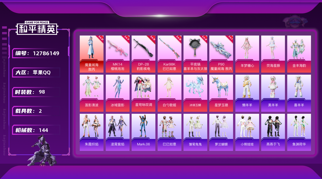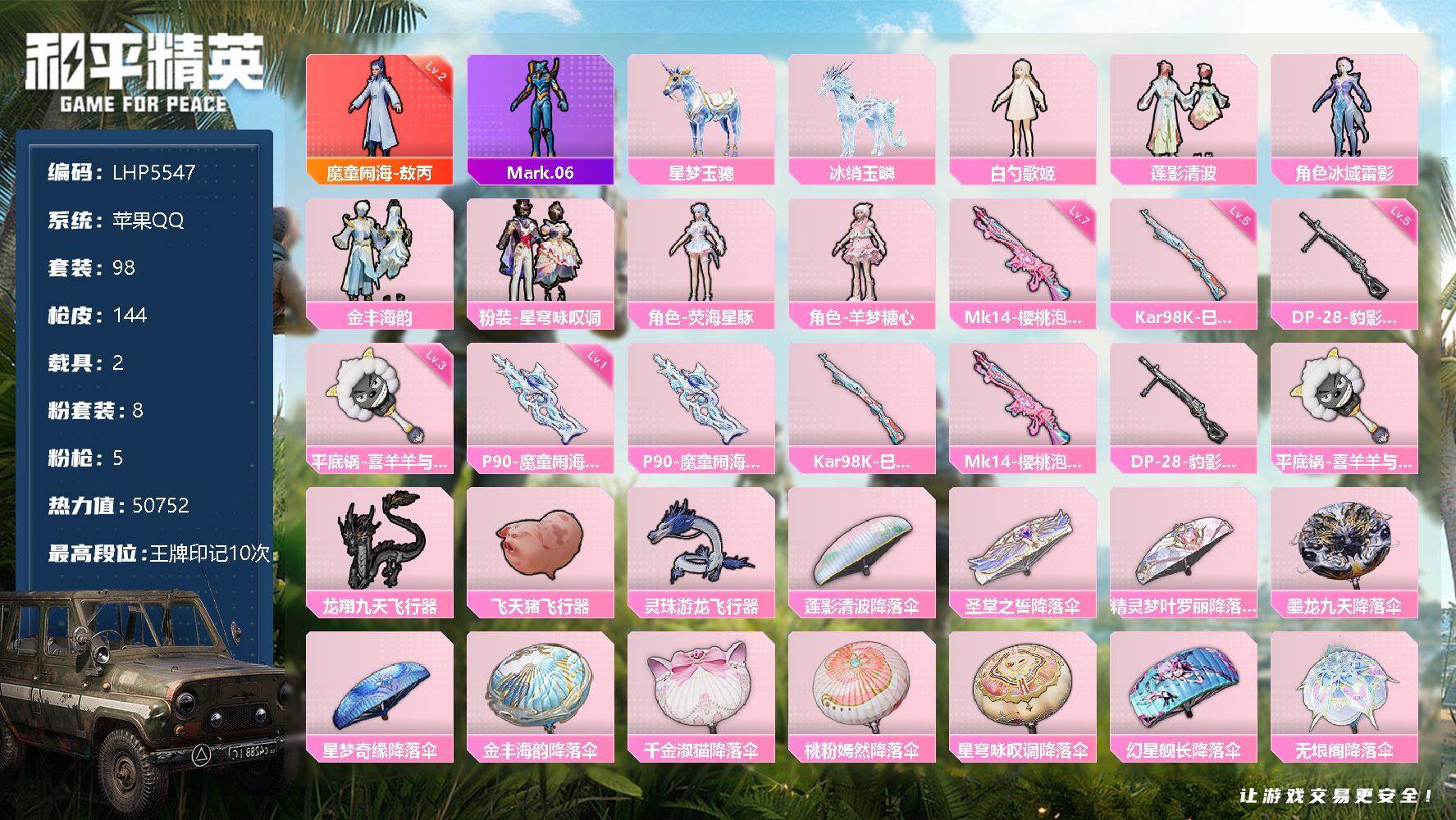 [12786149]素材身法号/绝世印记2 苹果 手Q-1神装-8粉装-5特效枪-2载具-4粉色飞行器-5w热力值-10王牌印记-98套装-144枪皮【红色神装等级】:魔童闹海-敖丙(二级)【热门品类】:角色-Mark.06【粉色载具】:星梦玉骢,冰绡玉鳞【粉色套装】:角色-白勺歌姬,粉装-莲影清波,角色-冰域雷影,粉装-金丰海韵,粉装-星穹咏叹调,角色-荧海星豚,角色-羊梦糖心【粉色枪皮等级】:P90-魔童闹海 敖丙(一级),Kar98K-巳巳如意(五级),Mk14-樱桃泡泡(七级),DP-28-豹影疾电(五级),平底锅-喜羊羊与灰太狼(三级)【粉色飞行器】:龙翔九天飞行器,飞天猪飞行器,灵珠游龙飞行器