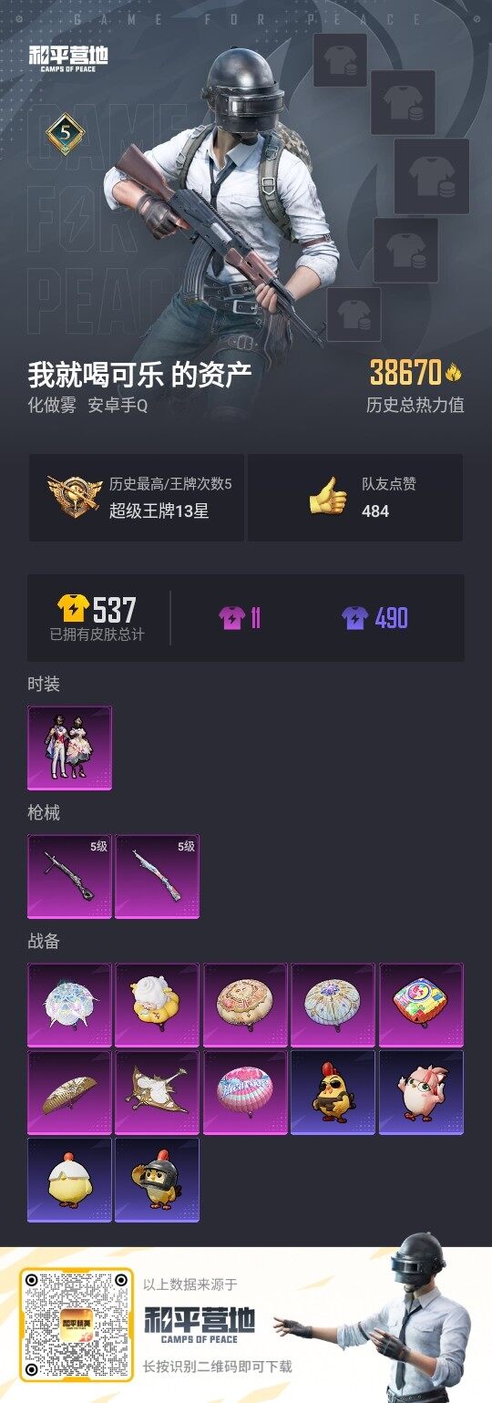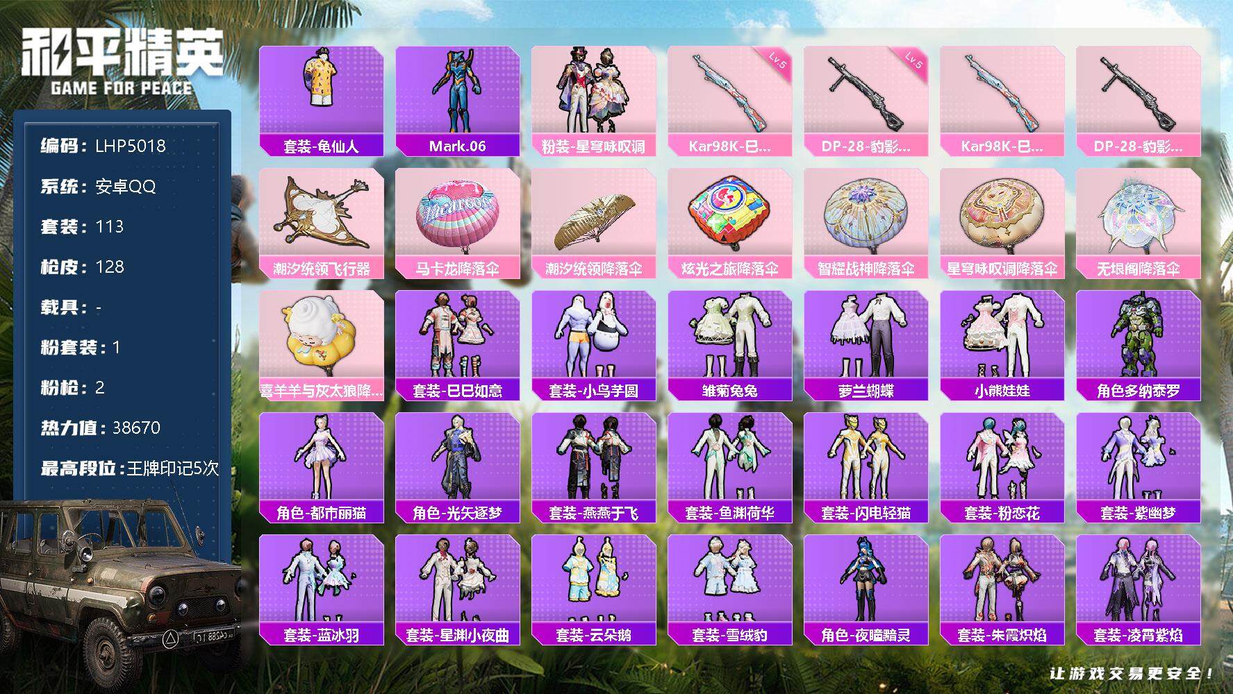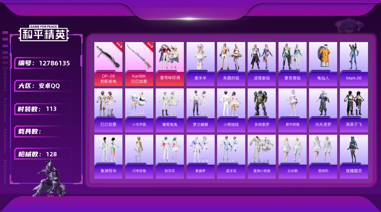 - [12583745]安卓 手Q-19粉装-4特效枪-2载具-4粉色飞行器-95063热力值-7王牌印记-242套装-262枪皮 【热门品类】:粉装-梦幻火箭,粉装-彩装战姬,套装-浪漫天命,套装-派对舞王,套装-奇异狩猎者,套装-龟仙人,套装-暗影哥特,套装-粉红小猪,角色-8号机,角色-Mark.06 【粉色载具】:兰博基尼Estoque(银翼灰),兰博基尼URUS(明艳黄) 【粉色套装】:粉装-数码大师,粉装-甜心巧克力,粉装-宝贝奶油派,粉装-蝶舞迷情,粉装-梦幻火箭,粉装-草莓生巧,粉装-炙焰红王,粉装-黄伞悠悠,粉装-黑伞漫漫,粉装-幻情紫藤,粉装-青葱仙萝,粉装-精灵娃娃,粉装-酣梦娃娃,粉装-天之羽翼,粉装-焦糖拿铁,角色-复仇流浪者,粉装-莲影清波,粉装-彩装战姬,粉装-星穹咏叹调 【粉色枪皮等级】:M416-风花雪月(七级),GROZA-焦糖拿铁(七级),AUG-暖羊咩咩(五级),Kar98K-巳巳如意(五级) 【粉色枪皮】:M416-风花雪月,GROZA-焦糖拿铁,AUG-暖羊咩咩,Kar98K-巳巳如意 【粉色飞行器】:梦幻火箭飞行器,天之羽翼飞行器,焦糖拿铁飞行器,龙翔九天飞行器 【粉色降落伞】:极限特训降落伞,百万伏特降落伞,银河战甲降落伞,甜心宝贝降落伞,梦幻火箭降落伞,锦绣火鲤降落伞,香水柠檬降落伞,暗夜玫瑰降落伞,红伞翩翩降落伞,蓝莓炮弹降落伞,绚金瑰梦降落伞,甜心娃娃降落伞,暗星紫秘降落伞,天之羽翼降落伞,焦糖拿铁降落伞,碧影闪光降落伞,青春物语降落伞,垂柳戏鸭降落伞,彩虹甜喵降落伞,闲梦青缨降落伞,莲影清波降落伞,彩装战姬降落伞,墨龙九天降落伞,创世·救赎降落伞,临安公主降落伞,月影灵韵降落伞 【稀有套装】:套装-龟仙人,套装-巳巳如意,套装-萝兰蝴蝶,套装-糖糖葫芦,套装-青团波波,角色-许七安,套装-燕燕于飞,套装-鱼渊荷华,套装-紫幽梦,套装-蓝冰羽,套装-星渊小夜曲 【稀有枪皮】:AKM-四圣焕新,AKM-夜灯,AKM-彩虹符号,AKM-灼热熔岩,AKM-萌趣颜团子,AKM-虎虎生威,AKM-霓虹街区,M16A4-幻世战舞者,M16A4-甜心亚梦,M16A4-红色方程式,SCAR-L-夜灯,SCAR-L-暗夜玫瑰,SCAR-L-炫彩节奏,SCAR-L-玉兔迎春,SCAR-L-黄金龙骨,SCAR-L-龙宫之主,M416-夜灯,M416-暗星紫