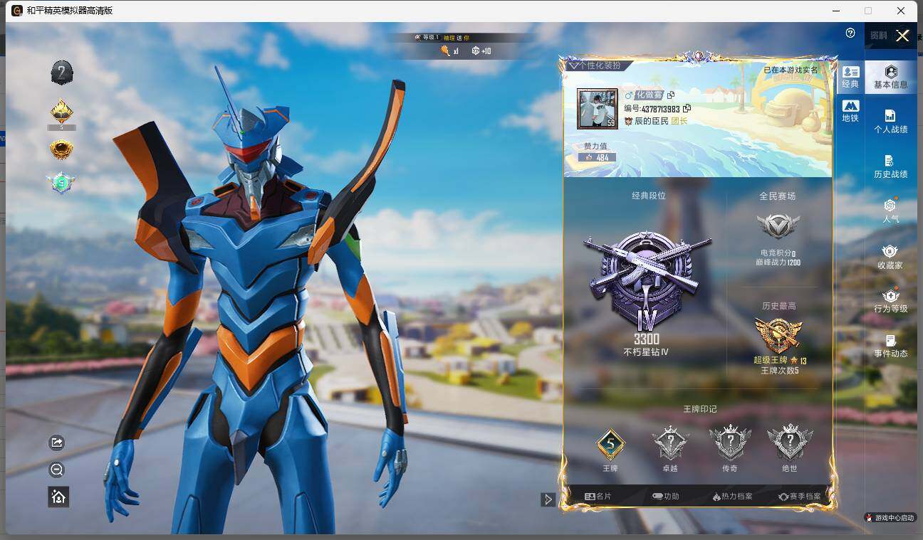 - PX_2081500-贵族等级: V5 英雄数: 103 皮肤数: 59 传说皮: 云鹰飞将,炽翼辉光 限定皮: 百木心枪,启示之音,鸣野蒿