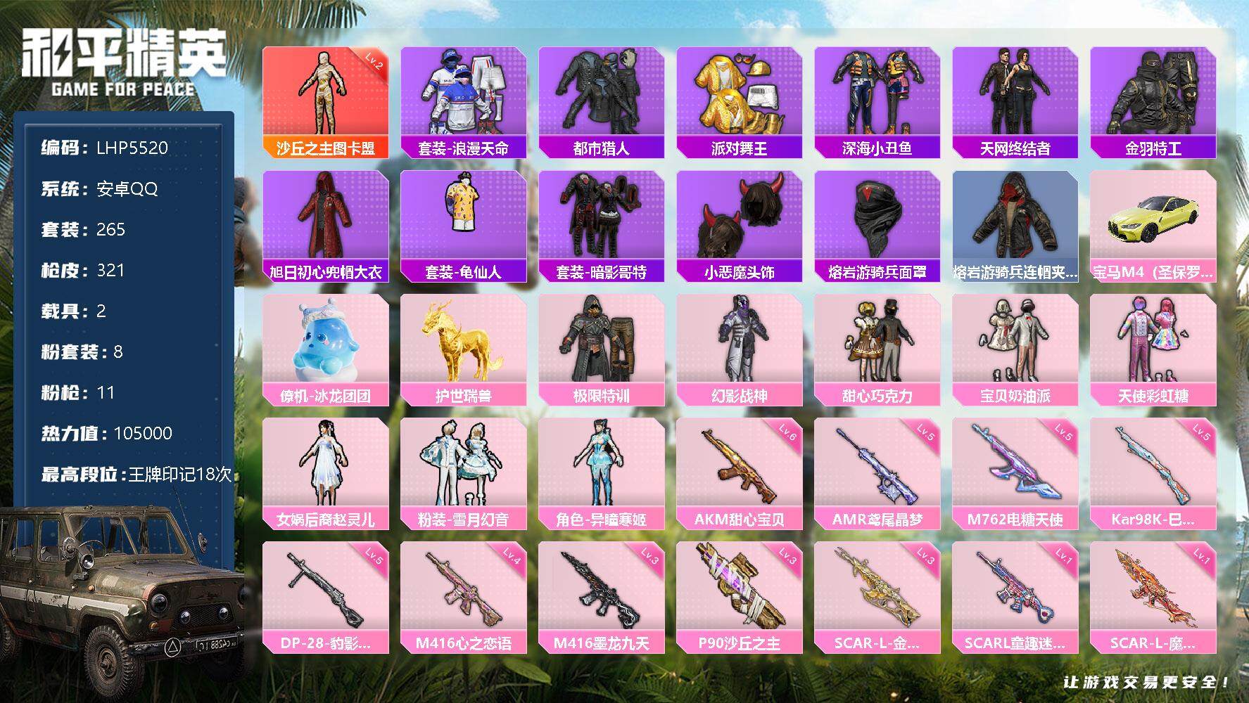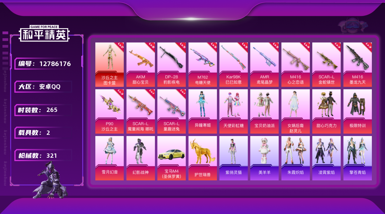 [12786176]地铁满天赋安卓 手Q-1神装-8粉装-11特效枪-2载具-10粉色飞行器-105000热力值-18王牌印记-265套装-321枪皮【红色神装等级】:沙丘之主-图卡盟(二级)【红色角色神装】:沙丘之主-图卡盟【热门品类】:套装-浪漫天命,套装-都市猎人,套装-派对舞王,套装-深海小丑鱼,套装-天网终结者,套装-金羽特工,旭日初心兜帽大衣,套装-龟仙人,套装-暗影哥特,小恶魔头饰熔岩游骑兵面罩,熔岩游骑兵连帽夹克 【粉色载具】:宝马M4(圣保罗黄),僚机-冰龙团团,护世瑞兽【粉色套装】:粉装-极限特训,粉装-幻影战神,粉装-甜心巧克力,粉装-宝贝奶油派,粉装-天使彩虹糖,女娲后裔-赵灵儿,粉装-雪月幻音,角色-异瞳寒姬【粉色枪皮等级】:AKM-甜心宝贝(六级),SCAR-L-童趣迷兔(一级),SCAR-L-金蛇镇世(三级),SCAR-L-魔童闹海 哪吒(一级),M416-心之恋语(四级),M416-墨龙九天(三级),M762-电糖天使(五级),P90-沙丘之主(三级),Kar98K-巳巳如意(五级),AMR-鸢尾晶梦(五级),DP-28-豹影疾电(五级)【粉色枪皮】:AKM-甜心宝贝,SCAR-L-童趣迷兔,SCAR-L-金蛇镇世,SCAR-L-魔童闹海 哪吒,M416-心之恋语,M416-墨龙九天,M762-电糖天使,P90-沙丘之主,Kar98K-巳巳如意,AMR-鸢尾晶梦,DP-28-豹影疾电【粉色飞行器】:酣梦熊熊飞行器,神秘黑猫飞行器,黄族统领飞行器,沙丘之主天马,龙翔九天飞行器,万象金身飞行器,灵猫魔法师飞行器,飞天猪飞行器