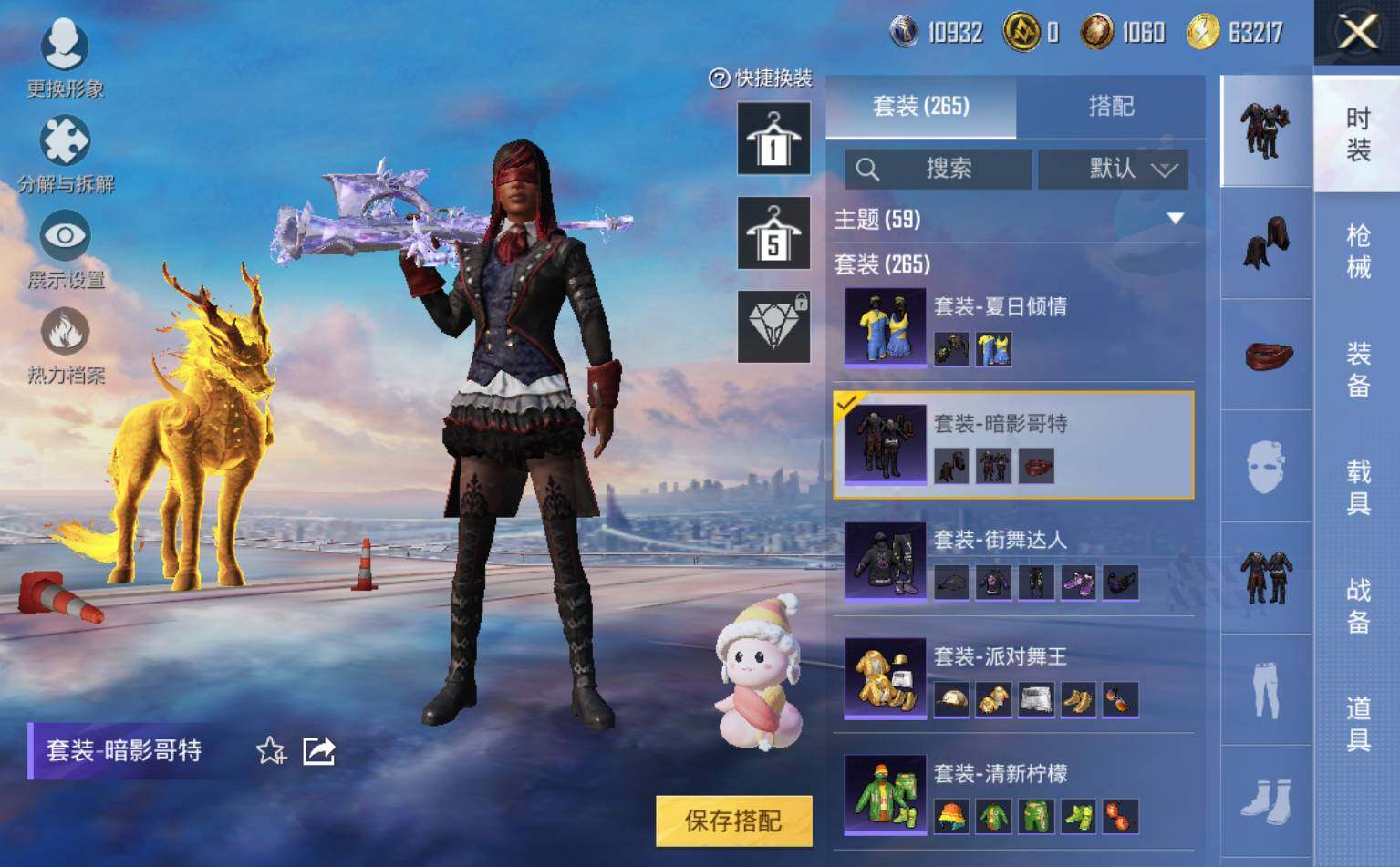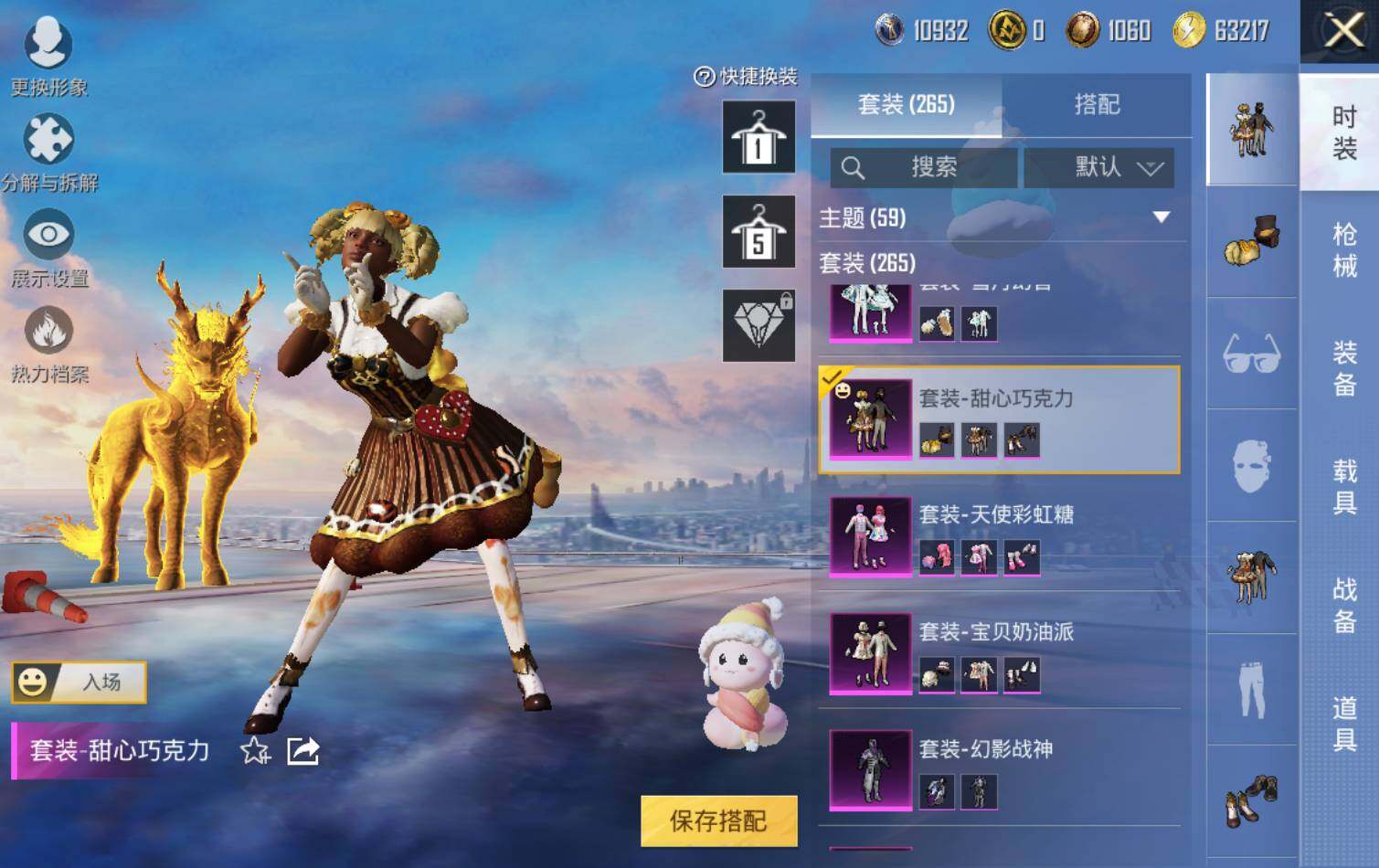 套装-浪漫天命,套装-金羽特工,套装-龟仙人,套装-暗影哥特,套装-极速红龙,套装-狂沙舞者,套装-破蛋小黄鸡,套装-漫步者,套装-水银刺客,套装-弄潮海豚,套装-雪山精英,白月香洋装套装,风华少年志套装,角色-赛罗奥特曼,套装-瑞龙福将,套装-团圆交子