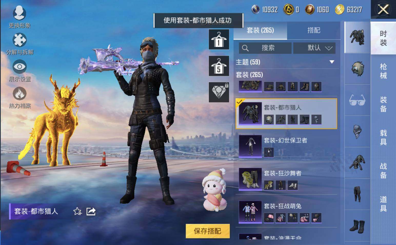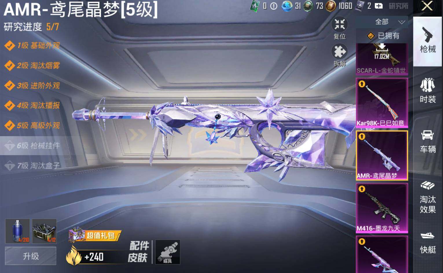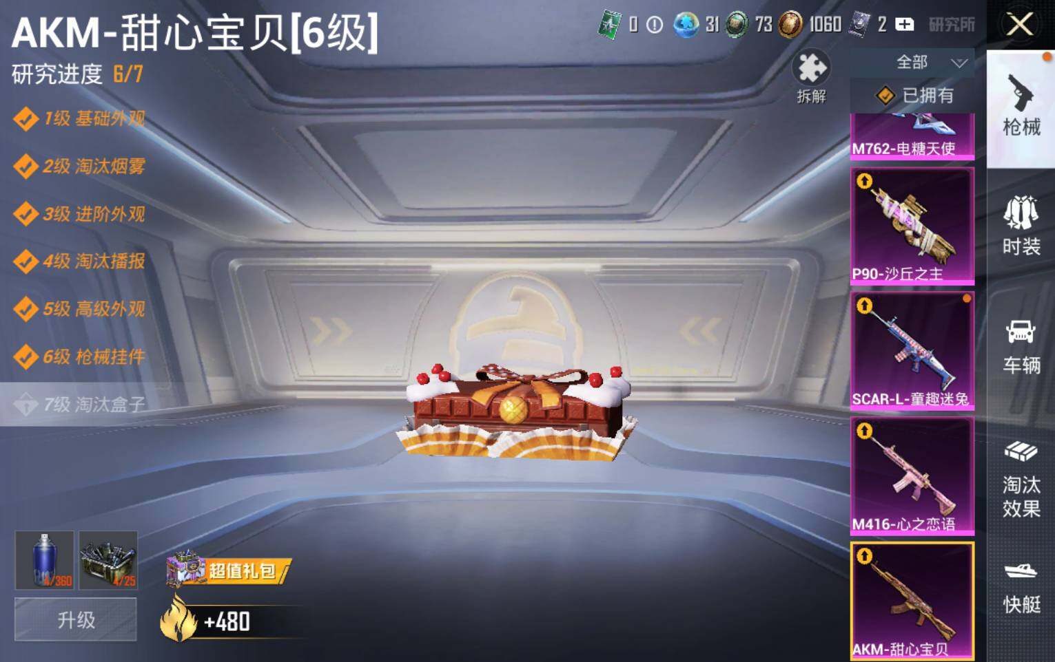AKM-甜心宝贝,SCAR-L-童趣迷兔,SCAR-L-金蛇镇世,M416-心之恋语,M416-墨龙九天,M762-电糖天使,P90-沙丘之主,Kar98K-巳巳如意,AMR-鸢尾晶梦