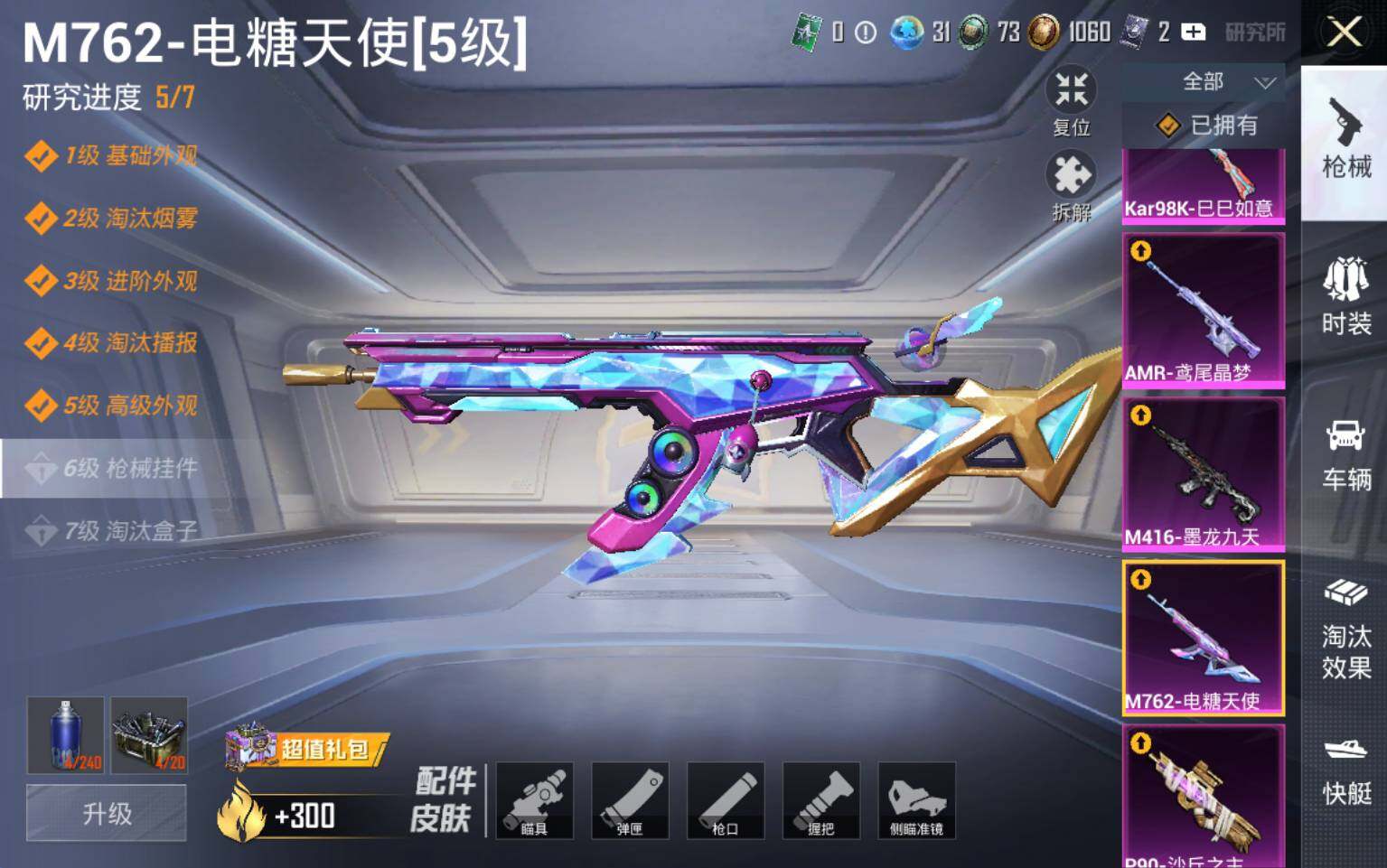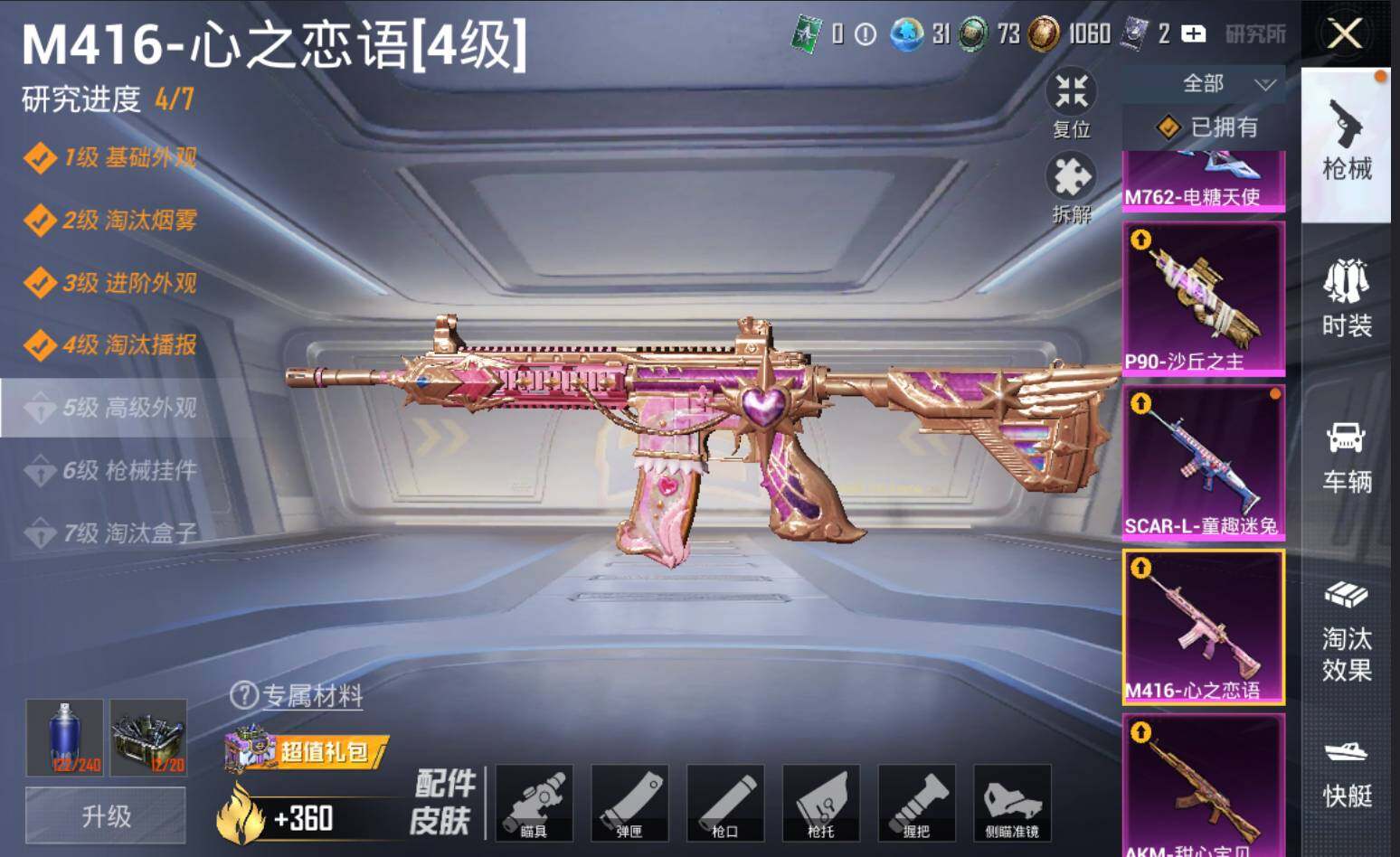 【粉色载具】:宝马M4(圣保罗黄),僚机-冰龙团团,护世瑞兽【粉色套装】:粉装-极限特训,粉装-幻影战神,粉装-甜心巧克力,粉装-宝贝奶油派,粉装-天使彩虹糖,女娲后裔-赵灵儿,粉装-雪月幻音,角色-异瞳寒姬【粉色枪皮等级】:AKM-甜心宝贝(六级),SCAR-L-童趣迷兔(一级),SCAR-L-金蛇镇世(三级),SCAR-L-魔童闹海 哪吒(一级),M416-心之恋语(四级),M416-墨龙九天(三级),M762-电糖天使(五级),P90-沙丘之主(三级),Kar98K-巳巳如意(五级),AMR-鸢尾晶梦(五级),DP-28-豹影疾电(五级)【粉色枪皮】:AKM-甜心宝贝,SCAR-L-童趣迷兔,SCAR-L-金蛇镇世,SCAR-L-魔童闹海 哪吒,M416-心之恋语,M416-墨龙九天,M762-电糖天使,P90-沙丘之主,Kar98K-巳巳如意,AMR-鸢尾晶梦,DP-28-豹影疾电【粉色飞行器】:酣梦熊熊飞行器,神秘黑猫飞行器,黄族统领飞行器,沙丘之主天马,龙翔九天飞行器,万象金身飞行器,灵猫魔法师飞行器,飞天猪飞行器