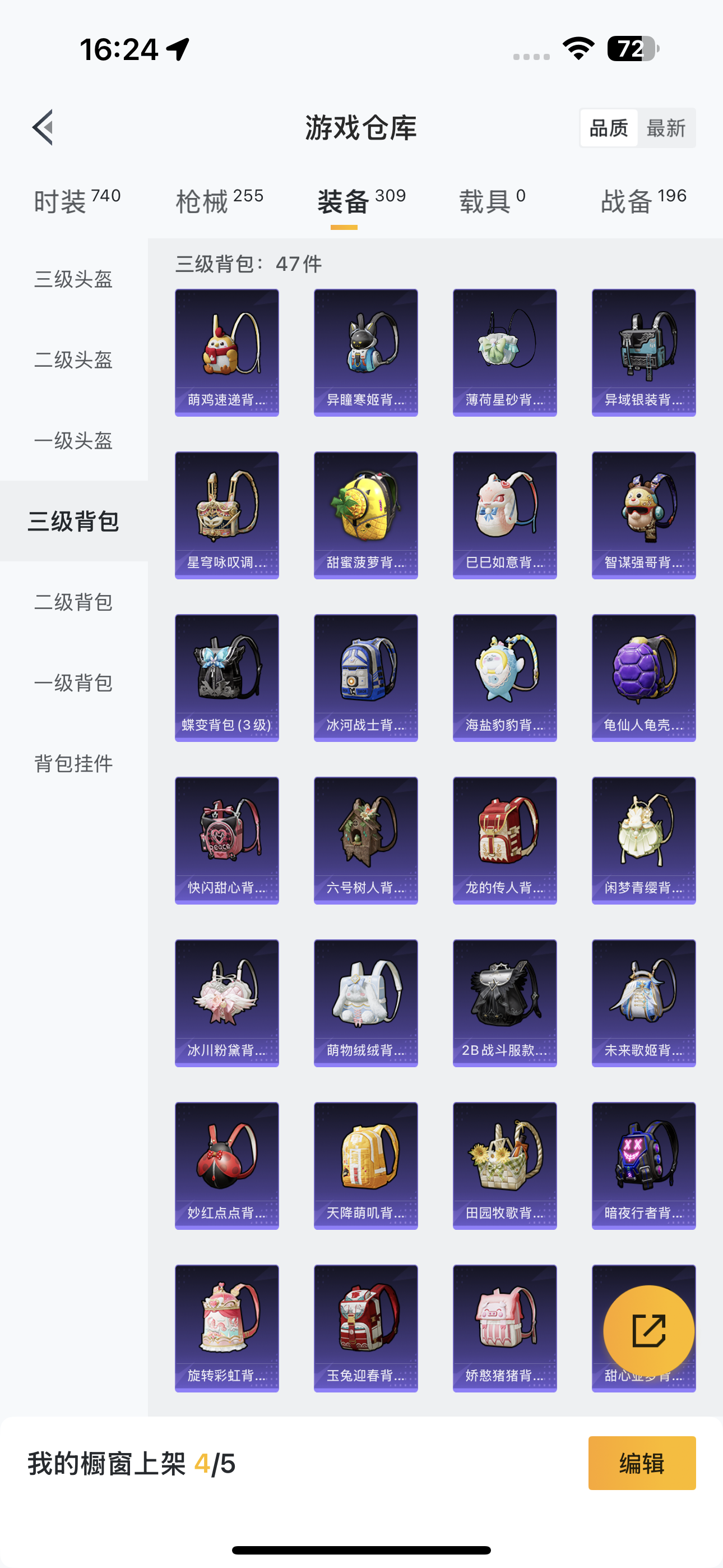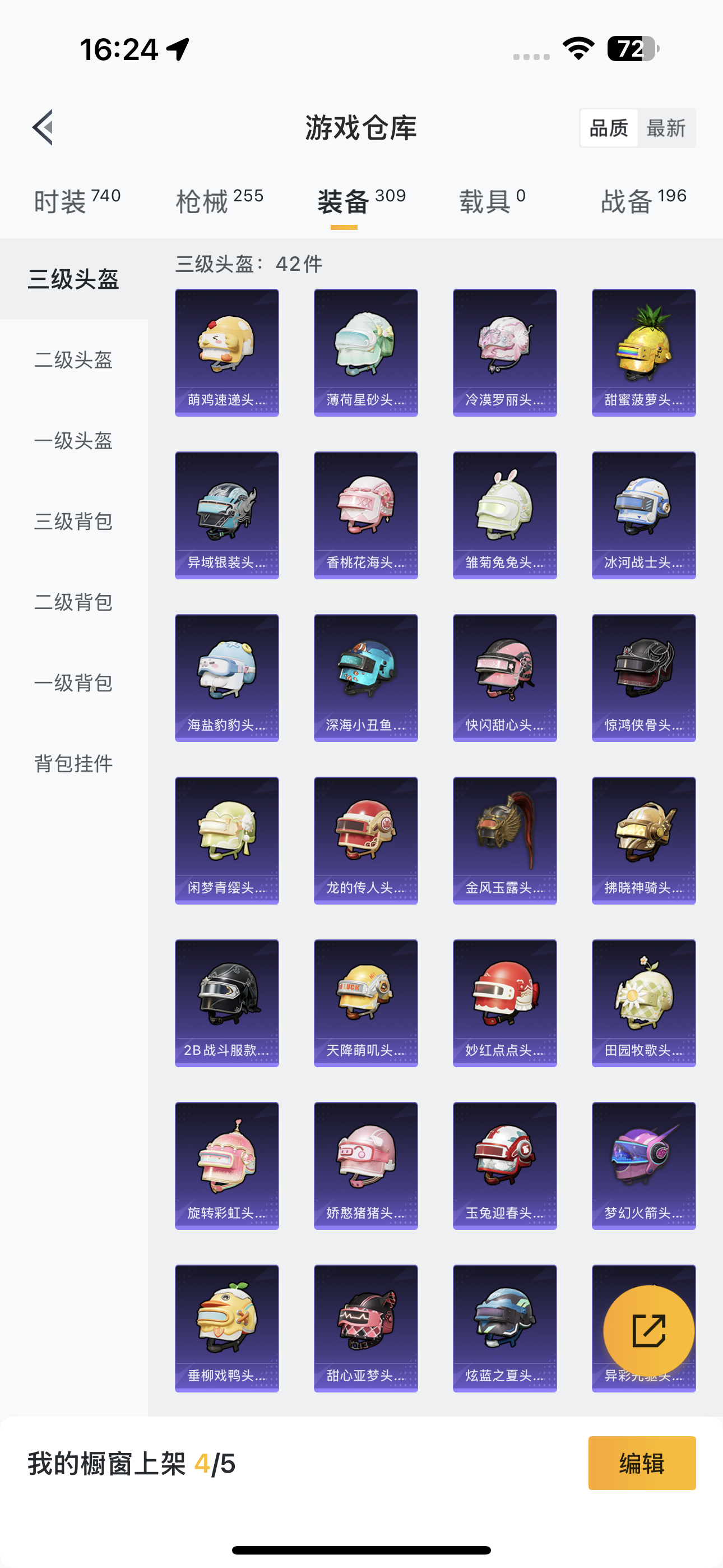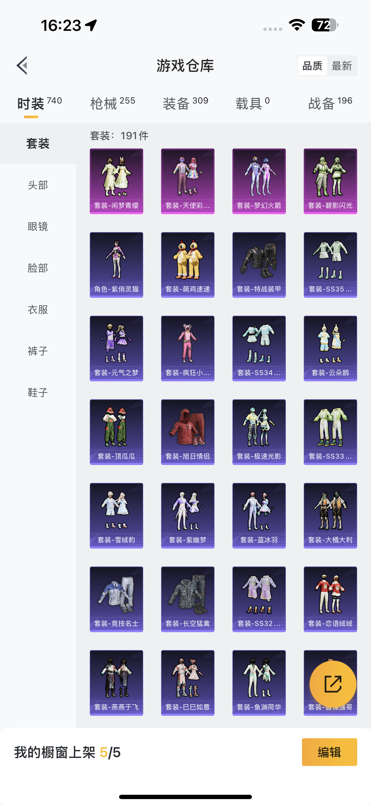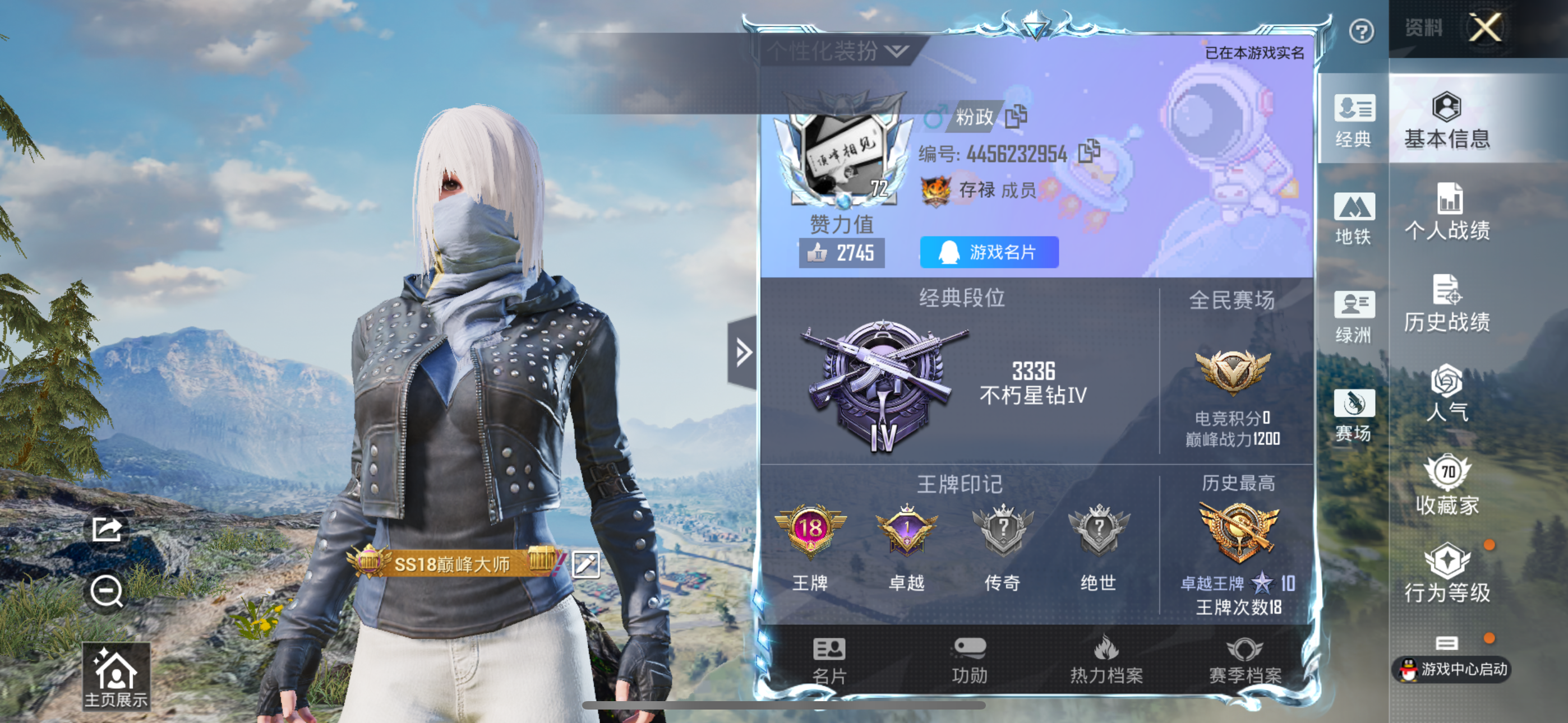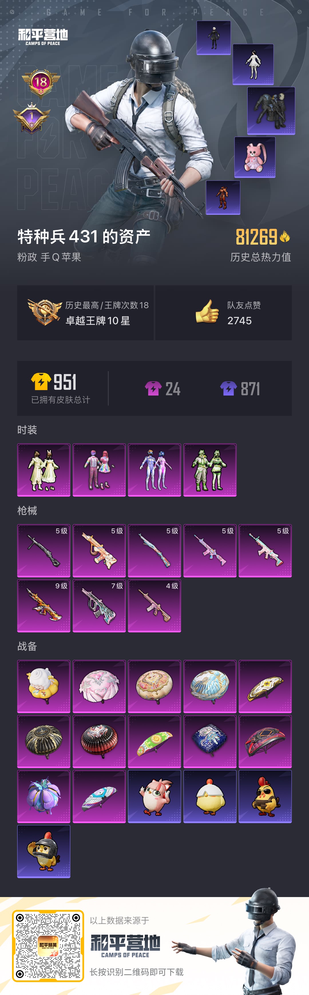 [12716686]实名: 可修改 时装数: 740 枪械数: 255 战备数: 196 热门装扮: 奇异狩猎者,梦幻火箭(新101),天使彩虹糖,鹰眼刺客,都市猎人,碧影闪光,暴走罗小黑,闲梦青缨 稀有枪皮: M416心之恋语,M416至情至圣,AUG超新星,SCAR-L-锦绣绵绵,M416电玩时刻,Kar98K-巳巳如意,AUG-暖羊咩咩,DP-28-豹影疾电