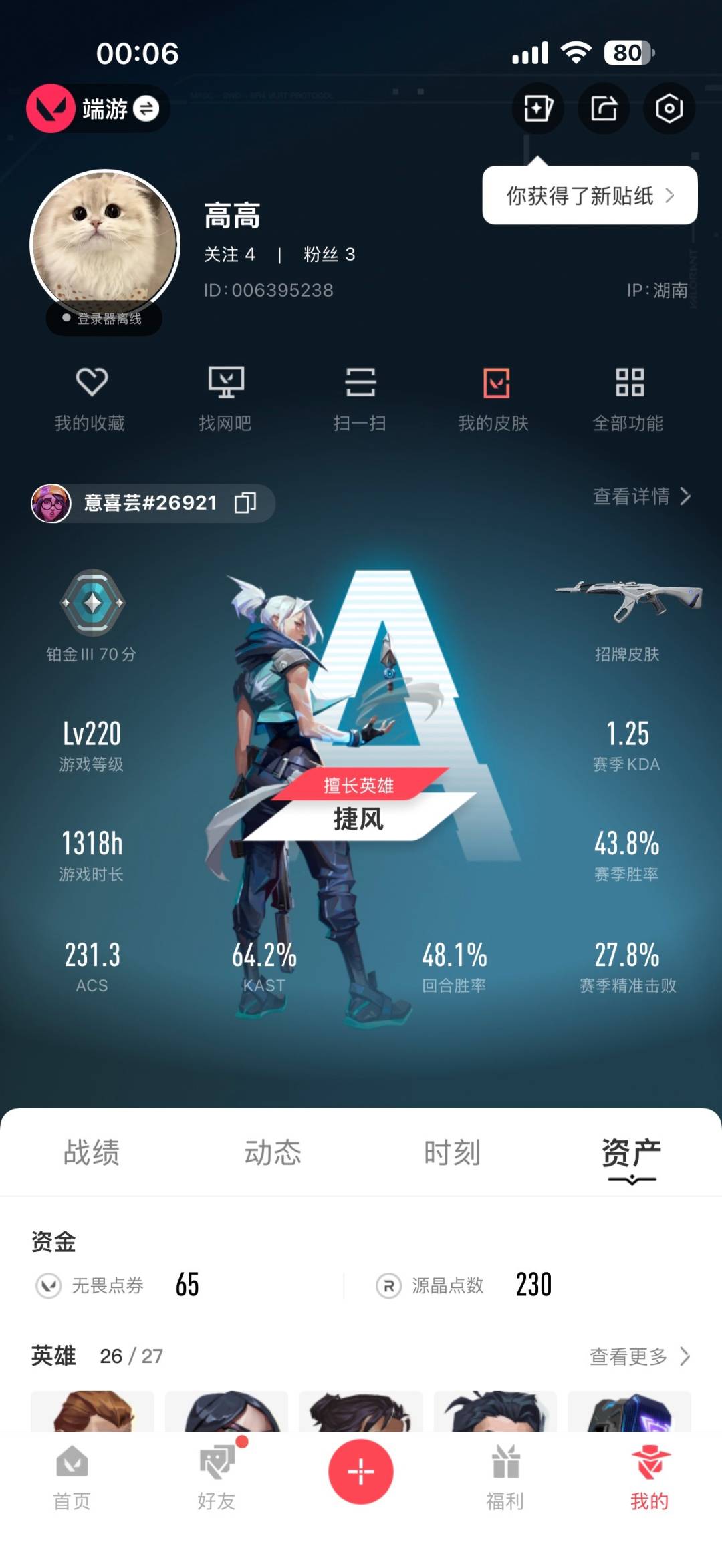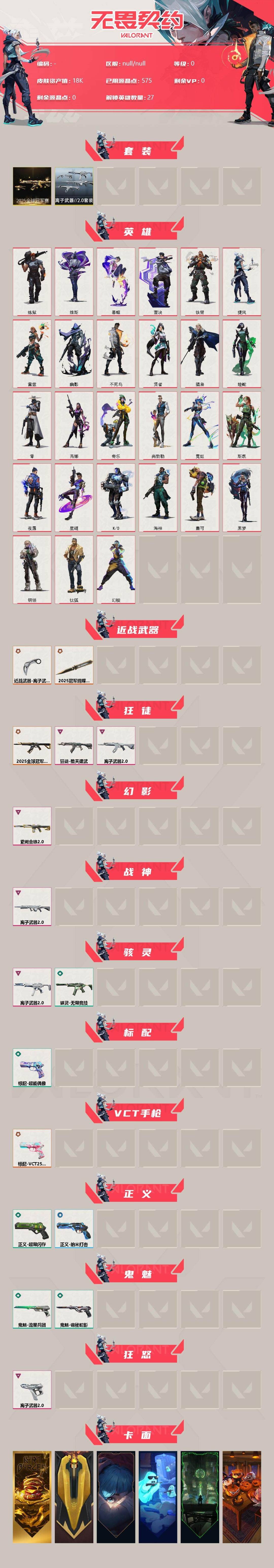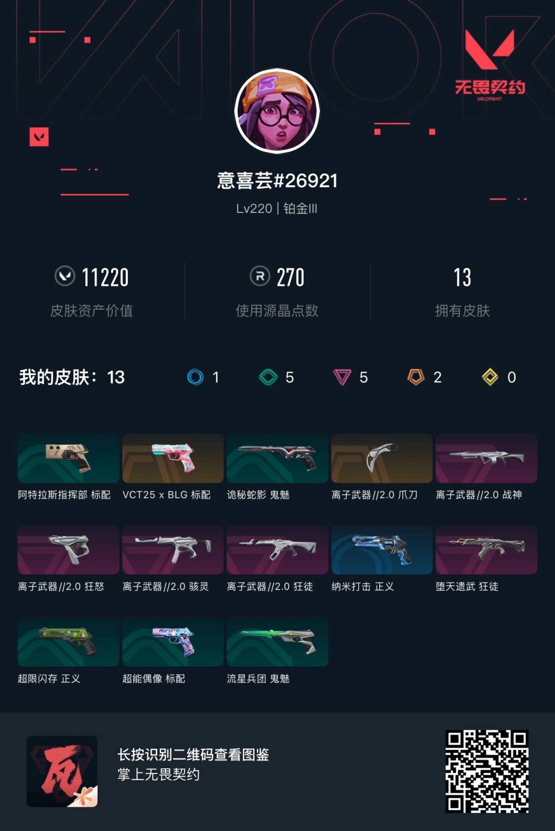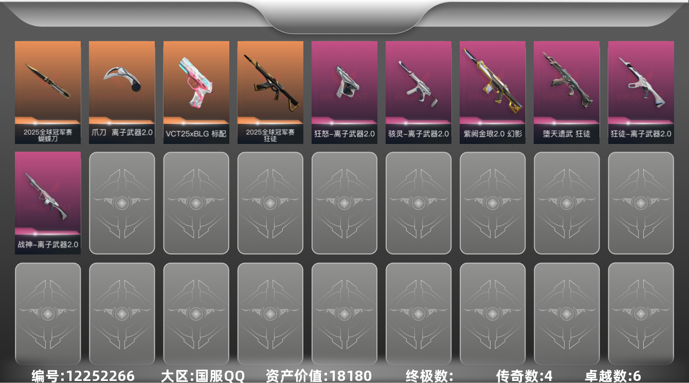 [12252266]2橙皮 5紫皮 13皮肤 26英雄 64卡面 270已用源晶 铂金 优质装备:离子武器2.0 爪刀 套装:离子武器2.0 佩枪皮肤:标配-VCT25xBLG,狂怒-离子武器2.0 冲锋枪皮肤:骇灵-离子武器2.0 步枪皮肤:狂徒-离子武器2.0,狂徒-堕天遗武 机枪皮肤:战神-离子武器2.0