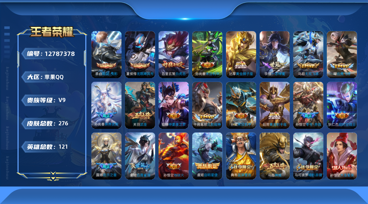 [12787378]苹果Q-V7-永恒钻石V段位-121英雄-276皮肤-2典藏-0珍品无双-0无双-0珍品传说-18传说-70史诗