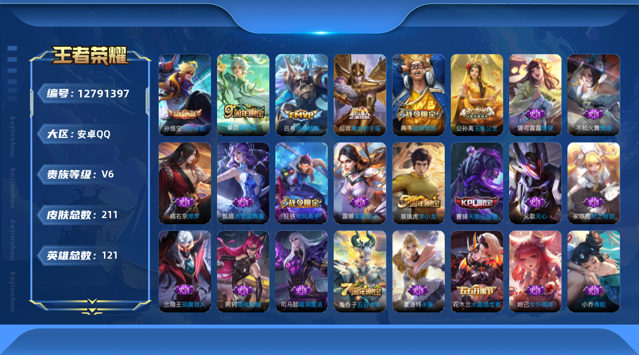 [12791397]安卓Q-V3-尊贵铂金II段位-121英雄-211皮肤-1典藏-0珍品无双-0无双-0珍品传说-3传说-55史诗 【荣耀典藏】:孙悟空全息碎影 【内测皮肤】:孙尚香蔷薇恋人,狂铁特工战影 【传说皮肤】:后羿黄金射手座,吕布怒海麟威,桑启鸣野蒿 【限定皮肤】:狄仁杰阴阳师,赵云皇家上将,孙尚香蔷薇恋人,鲁班七号狮舞东方,庄周高山流水,钟无艳超时空战士,白起夜都怪侠,芈月幻夜卜梦,周瑜赤莲之焰,元歌无心,夏侯惇朔风刀,甄姬落雪兰心,曹操天狼征服者,典韦蓝屏警告,狄仁杰魔术师,狄仁杰万华元夜,达摩沙漠行僧,项羽海滩派对,老夫子醍醐杖,王昭君午后时光,兰陵王驯魔猎人,兰陵王金庭之子,牛魔御旌,李元芳银河之约,李元芳云中旅人,钟馗神迹守卫,钟馗驱傩正仪,杨玉环遇见飞天,女娲朔望之晖,雅典娜黎明之约,蔡文姬繁星吟游,鬼谷子原初探秘者,鬼谷子五谷丰年,黄忠火炮绅士,苏烈千军破阵,百里玄策原初追逐者,弈星混沌棋,公孙离玉兔公主,沈梦溪星空之诺,沈梦溪大漠名商,明世隐疑决卦,明世隐吟游魔法,裴擒虎李小龙,裴擒虎擒涛扼浪,狂铁电玩高手,米莱狄御霄,云中君纤云弄巧,盾山御銮,上官婉儿梁祝,嫦娥拒霜思,桑启海盐诗旅,张良古海寻踪,鬼谷子天穹祈灯,沈梦溪龙舞盛年,刘邦剑破天穹,程咬金群星魔术团,周瑜熔金海岸 【赛季限定】:夏侯惇朔风刀,狄仁杰万华元夜,达摩沙漠行僧,老夫子醍醐杖,兰陵王金庭之子,张良古海寻踪,牛魔御旌,李元芳云中旅人,钟馗驱傩正仪,雅典娜黎明之约,鬼谷子原初探秘者,苏烈千军破阵,百里玄策原初追逐者,弈星混沌棋,沈梦溪大漠名商,明世隐疑决卦,裴擒虎擒涛扼浪,米莱狄御霄,盾山御銮,桑启海盐诗旅,鬼谷子天穹祈灯,刘邦剑破天穹 【战令限定】:鲁班七号狮舞东方,钟无艳超时空战士,白起夜都怪侠,芈月幻夜卜梦,周瑜赤莲之焰,甄姬落雪兰心,典韦蓝屏警告,王昭君午后时光,兰陵王驯魔猎人,李元芳银河之约,钟馗神迹守卫,女娲朔望之晖,黄忠火炮绅士,沈梦溪星空之诺,明世隐吟游魔法,狂铁电玩高手 【史诗皮肤】:露娜紫霞仙子,阿轲暗夜猫娘,赵云皇家上将,貂蝉圣诞恋歌,甄姬冰雪圆舞曲,狄仁杰魔术师,宫本武藏鬼剑武藏,孙尚香蔷薇恋人,孙尚香水果甜心,妲己魅力维加斯,妲己女仆咖啡,墨子龙骑士,墨子金属风暴,吕布圣诞狂欢,曹操幽灵船长,吕布末日机甲,花木兰水晶猎龙者,刘邦德古拉伯爵,夏侯惇乘风破浪,兰陵王暗隐