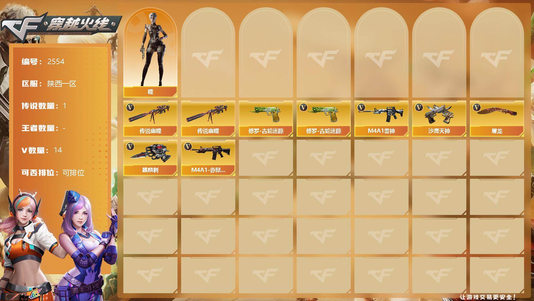 [12791809]陕西一区-14V-0王者-0炫金 【传说武器】:传说幽瞳 【热门武器】:传说幽瞳,修罗-古蛇迷踪 【角色】:瞳 【英雄级武器】:M4A1-雷神,M4A1-赤狱骑士,修罗-古蛇迷踪,沙鹰-天神*5,麒麟刺*3,屠龙 【特殊枪械】: