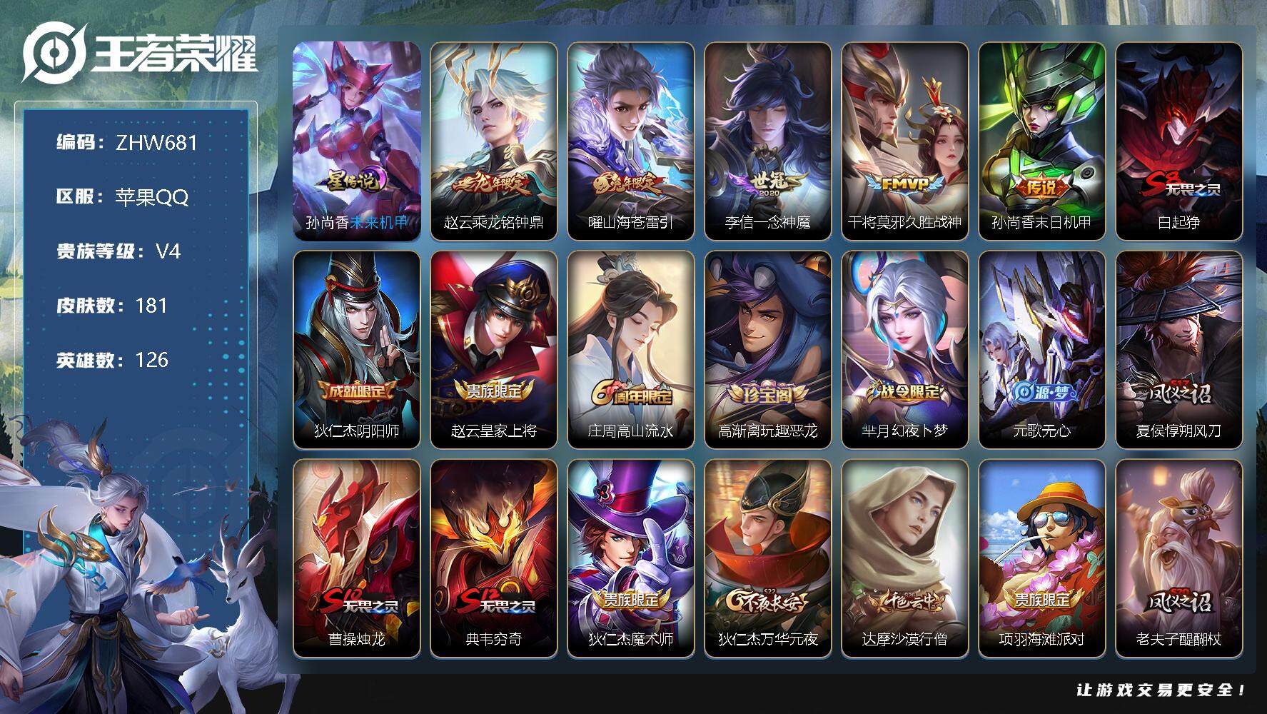 [12792555]苹果Q-V4-至尊星耀II段位-126英雄-181皮肤-5传说-1星传说-37史诗 【英雄全皮】:鬼谷子全皮 【传说皮肤】:赵云乘龙铭钟鼎,曜山海苍雷引,李信一念神魔,干将莫邪久胜战神,孙尚香末日机甲 【限定皮肤】:白起狰,狄仁杰阴阳师,赵云皇家上将,庄周高山流水,高渐离玩趣恶龙,芈月幻夜卜梦,元歌无心,夏侯惇朔风刀,曹操烛龙,典韦穷奇,狄仁杰魔术师,狄仁杰万华元夜,达摩沙漠行僧,项羽海滩派对,老夫子醍醐杖,关羽百相守梦,程咬金演武夺筹,兰陵王金庭之子,牛魔御旌,李元芳云中旅人,钟馗驱傩正仪,雅典娜单词大作战,雅典娜黎明之约,太乙真人饕餮,鬼谷子原初探秘者,鬼谷子五谷丰年,黄忠火炮绅士,苏烈千军破阵,弈星混沌棋,沈梦溪大漠名商,明世隐疑决卦,裴擒虎李小龙,裴擒虎擒涛扼浪,狂铁御狮,米莱狄御霄,猪八戒猪悟能,上官婉儿梁祝,嫦娥暖冬兔眠,曜山海苍雷引,鲁班大师探海日志,桑启海盐诗旅,暃星界游侠,张良古海寻踪,鬼谷子天穹祈灯,赵云乘龙铭钟鼎,刘邦剑破天穹,程咬金群星魔术团 【年限皮肤】:曜山海苍雷引,赵云乘龙铭钟鼎 【赛季限定】:白起狰,夏侯惇朔风刀,曹操烛龙,典韦穷奇,狄仁杰万华元夜,达摩沙漠行僧,老夫子醍醐杖,程咬金演武夺筹,兰陵王金庭之子,张良古海寻踪,牛魔御旌,李元芳云中旅人,钟馗驱傩正仪,雅典娜黎明之约,太乙真人饕餮,鬼谷子原初探秘者,苏烈千军破阵,弈星混沌棋,沈梦溪大漠名商,明世隐疑决卦,裴擒虎擒涛扼浪,狂铁御狮,米莱狄御霄,鲁班大师探海日志,桑启海盐诗旅,鬼谷子天穹祈灯,刘邦剑破天穹 【战令限定】:芈月幻夜卜梦,雅典娜单词大作战,黄忠火炮绅士,嫦娥暖冬兔眠,暃星界游侠 【史诗皮肤】:赵云皇家上将,赵云未来纪元,貂蝉圣诞恋歌,王昭君偶像歌手,狄仁杰魔术师,廉颇地狱岩魂,宫本武藏鬼剑武藏,孙尚香水果甜心,嬴政摇滚巨星,妲己魅力维加斯,墨子金属风暴,吕布圣诞狂欢,吕布末日机甲,张飞乱世虎臣,花木兰水晶猎龙者,刘邦德古拉伯爵,小乔缤纷独角兽,亚瑟心灵战警,白起星夜王子,狄仁杰鹰眼统帅,上官婉儿梁祝,不知火舞魅语,裴擒虎李小龙,猪八戒猪悟能,庄周高山流水,黄忠火炮绅士,雅典娜黎明之约,鬼谷子五谷丰年,元歌无心,暃星界游侠,关羽百相守梦,刘禅电玩爆裂旋风,弈星万物之道,阿轲化蝶舞,刘禅鸭鸭历险记,狂铁龙之律动,后羿石田雨龙 【其他皮肤】:项羽海滩派对,韩信教廷特使,达