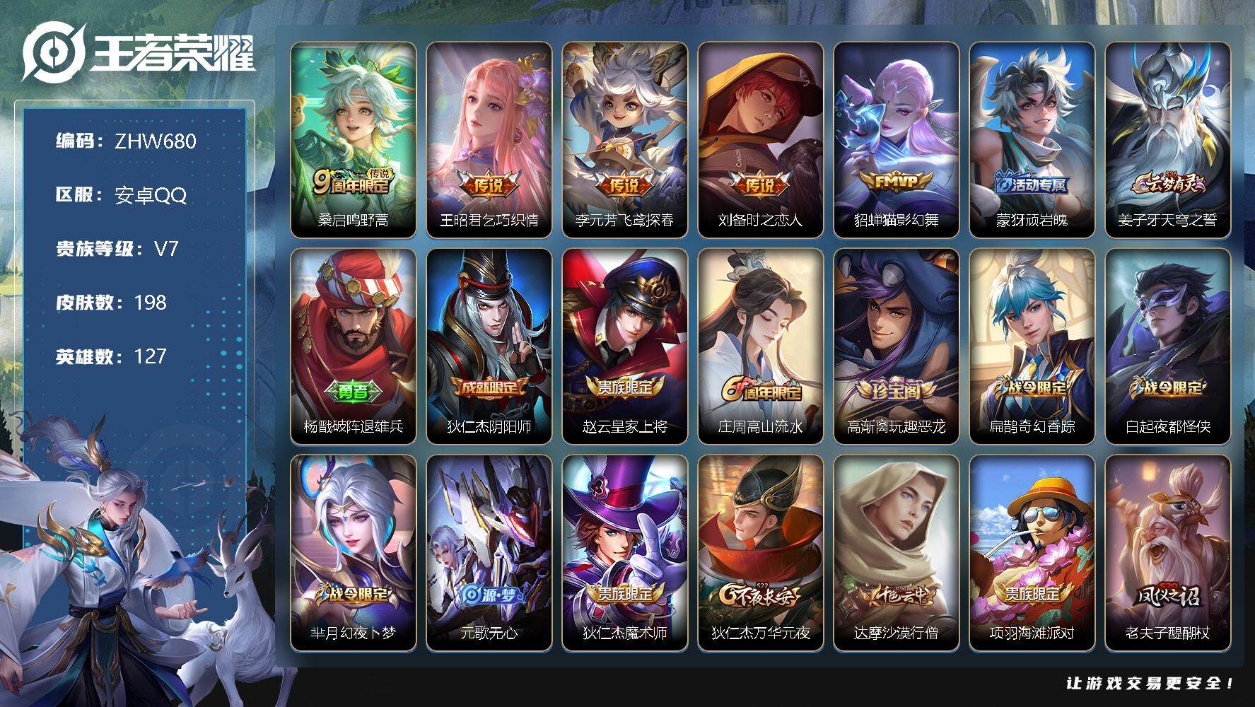 - [13403847]可二次【店主推荐捡漏号!可直接换绑】安卓Q-V8-至尊星耀V段位-127英雄-336皮肤-2典藏--4传说-94史诗 【英雄全皮】:钟馗全皮 【荣耀典藏】:孙悟空全息碎影,鲁班七号星空梦想 【传说皮肤】:后羿神树通天,桑启鸣野蒿,铠绛天战甲,虞姬启明星使 【限定皮肤】:白起狰,狄仁杰阴阳师,虞姬凯尔特女王,赵云皇家上将,墨子神迹守卫,嬴政白昼王子,孙尚香蔷薇恋人,鲁班七号狮舞东方,庄周蜃楼王,庄周高山流水,钟无艳超时空战士,孙膑妖精王,芈月重明,芈月幻夜卜梦,吕布猎兽之王,周瑜赤莲之焰,元歌云间偶戏,元歌无心,夏侯惇朔风刀,甄姬幽恒,甄姬落雪兰心,曹操烛龙,典韦穷奇,典韦蓝屏警告,马可波罗暗影游猎,狄仁杰魔术师,狄仁杰万华元夜,达摩星际陆战队,达摩沙漠行僧,项羽海滩派对,老夫子圣诞老人,老夫子醍醐杖,老夫子航海奇遇记,程咬金演武夺筹,兰陵王驯魔猎人,兰陵王金庭之子,亚瑟狮心王,亚瑟潮玩骑士王,孙悟空大圣娶亲,孙悟空孙行者,牛魔御旌,后羿如梦令,后羿圣弓游侠,李元芳银河之约,李元芳云中旅人,虞姬启明星使,钟馗神迹守卫,钟馗驱傩正仪,杨玉环遇见飞天,杨戬潮玩骑兵,女娲朔望之晖,干将莫邪冰霜恋舞曲,干将莫邪真爱魔法,雅典娜单词大作战,雅典娜黎明之约,蔡文姬繁星吟游,太乙真人饕餮,鬼谷子原初探秘者,鬼谷子五谷丰年,黄忠火炮绅士,苏烈千军破阵,百里守约朱雀志,弈星混沌棋,沈梦溪星空之诺,沈梦溪大漠名商,明世隐疑决卦,裴擒虎李小龙,裴擒虎擒涛扼浪,狂铁御狮,米莱狄御霄,米莱狄胡桃异想国,云中君纤云弄巧,盾山御銮,猪八戒西部大镖客,上官婉儿梁祝,嫦娥拒霜思,西施玲珑珍味,蒙犽狂想玩偶喵,鲁班大师探海日志,桑启海盐诗旅,艾琳女武神,阿古朵江河有灵,张良古海寻踪,鬼谷子天穹祈灯,姬小满妄想食味,鲁班七号蔬乡物语,李元芳蔬乡物语,刘邦剑破天穹,程咬金群星魔术团,关羽决胜骁骑,镜青焰无极,项羽苍威无极,海诺心动手记,刘备异域游侠 【年限皮肤】:百里守约朱雀志,甄姬幽恒 【赛季限定】:庄周蜃楼王,孙膑妖精王,白起狰,芈月重明,夏侯惇朔风刀,曹操烛龙,典韦穷奇,狄仁杰万华元夜,达摩沙漠行僧,老夫子醍醐杖,程咬金演武夺筹,兰陵王金庭之子,张良古海寻踪,亚瑟狮心王,牛魔御旌,李元芳云中旅人,虞姬凯尔特女王,钟馗驱傩正仪,雅典娜黎明之约,太乙真人饕餮,鬼谷子原初探秘者,苏烈千军破阵,弈星混沌棋,