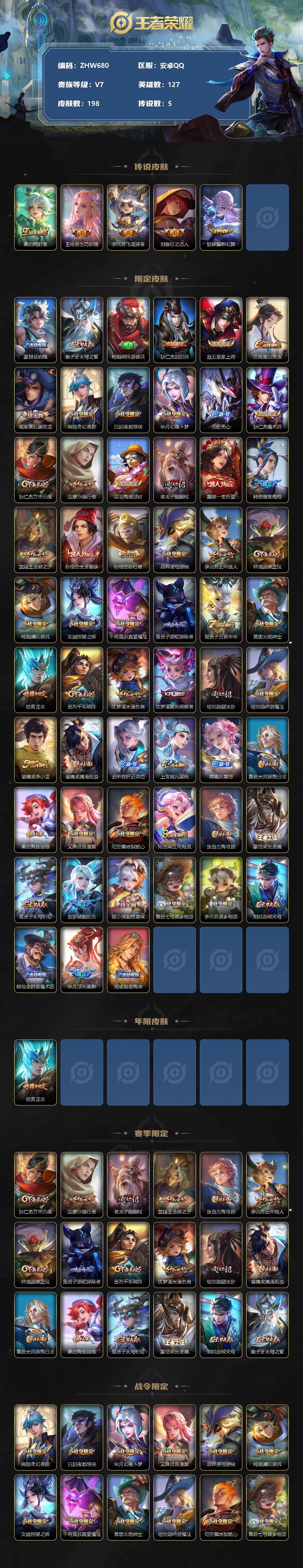 - [11608665]V7 1典藏 5传说 123英雄 217皮肤 可修改实名 优质装备:弑枪猎影(韩信典藏),云鹰飞将(小将军),零号·赤焰,超时空战士-狄仁杰 珍宝阁皮:优雅恋人,蔷薇恋人 限定皮:愿照·九州拓(澜年限),凤凰于飞,异界灵契(白毛香),神威(电光马子),飞衡(韩信年限),遇见飞天,高山流水,五谷丰年,岱宗(典韦年限),天狼绘梦者,李小龙,逐梦之影,朱雀志(守约年限),孙行者,猪悟能,青春决赛季,蜜橘之夏 史诗皮:器灵·浮梦炉,石田雨龙,茶境仙,紫霞仙子,黄金分割率,特工魅影,江河有灵,冰冠公主,偶像歌手,暗夜猫娘,龙骑士(小龙虾),末日机甲-吕布,乱世虎臣,节奏热浪,修罗,女仆咖啡,水果甜心,星夜王子,心灵骇客,功夫厨神,德古拉伯爵,暗隐猎兽者,幽灵船长,鬼剑武藏,地狱岩魂,纤云弄巧,繁星吟游(呼啦呼啦),拒霜思,乘风破浪,逐浪之夏,水晶猎龙者,箭羽风息,金属风暴,鹰眼统帅,魅力维加斯,未来纪元-赵云
