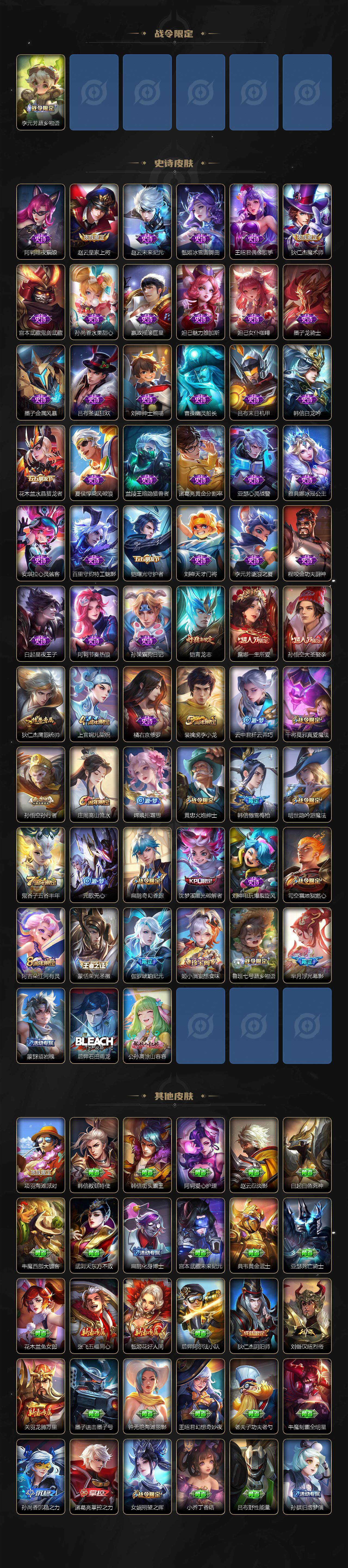 【史诗皮肤】:阿轲暗夜猫娘,赵云皇家上将,赵云未来纪元,甄姬冰雪圆舞曲,王昭君偶像歌手,狄仁杰魔术师,宫本武藏鬼剑武藏,孙尚香水果甜心,嬴政摇滚巨星,妲己魅力维加斯,妲己女仆咖啡,墨子龙骑士,墨子金属风暴,吕布圣诞狂欢,刘禅绅士熊喵,曹操幽灵船长,吕布末日机甲,韩信白龙吟,花木兰水晶猎龙者,夏侯惇乘风破浪,兰陵王暗隐猎兽者,诸葛亮黄金分割率,亚瑟心灵战警,雅典娜冰冠公主,安琪拉心灵骇客,百里守约特工魅影,铠曙光